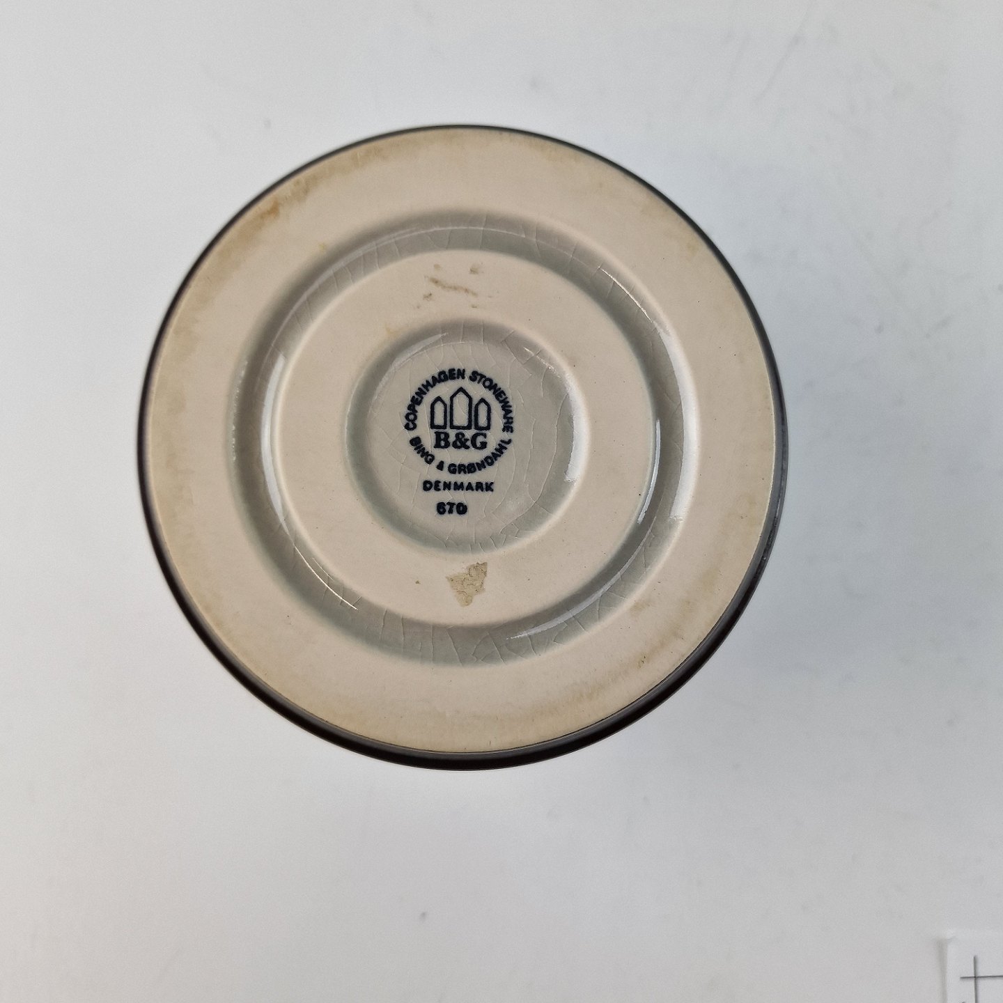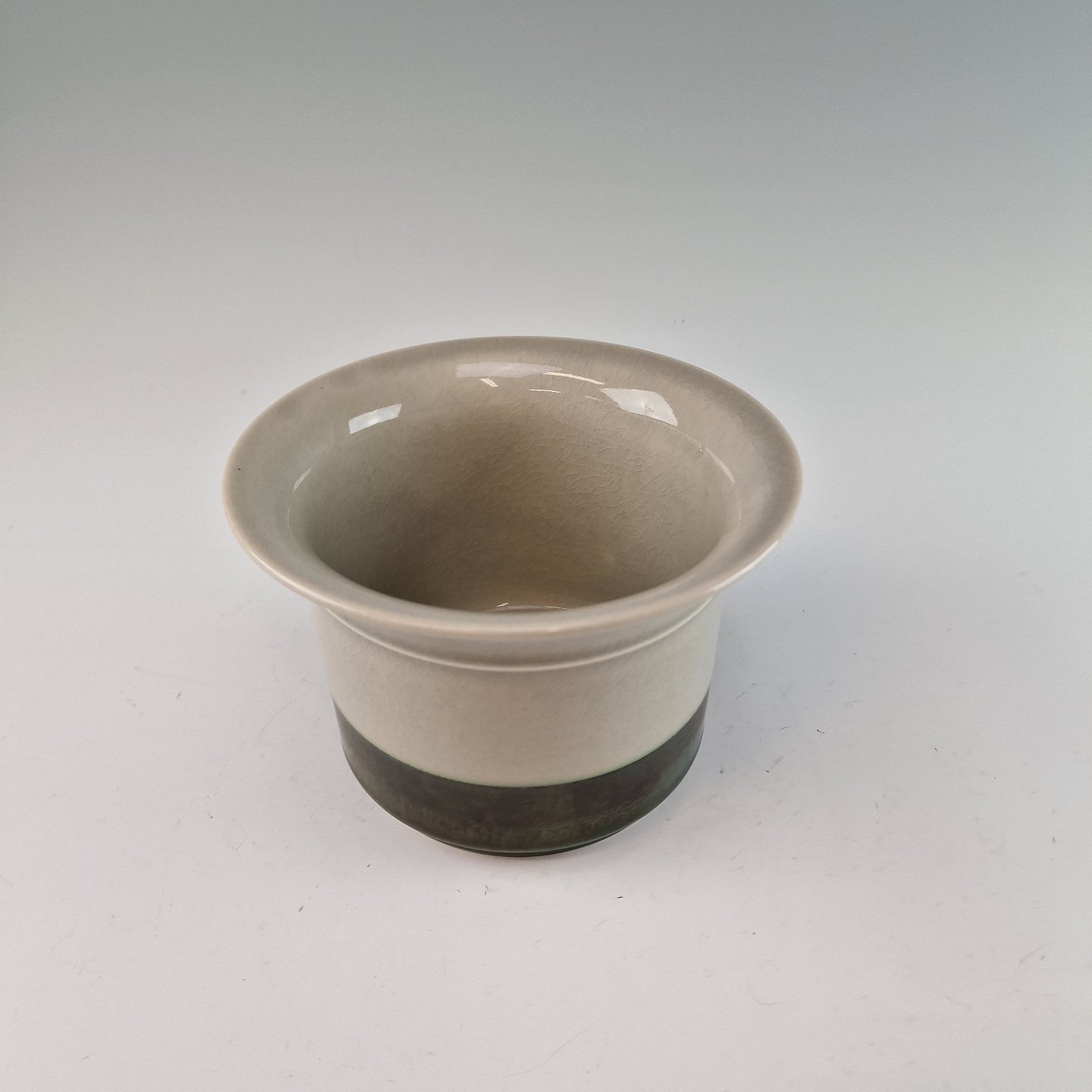 Stellet Tema er af stentøj, glaseret med lys grå og dekoreret med kanter af grønne og brune farver
