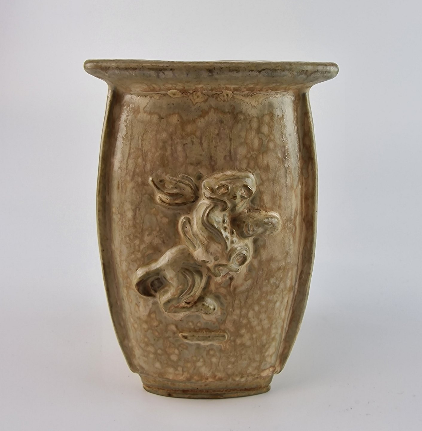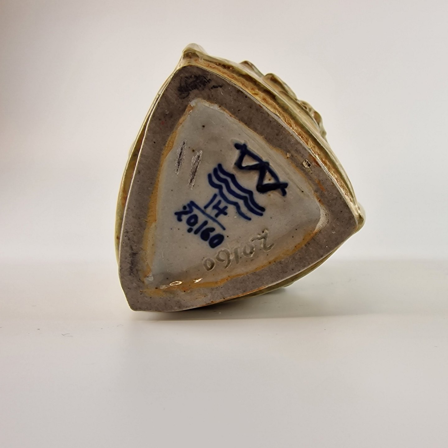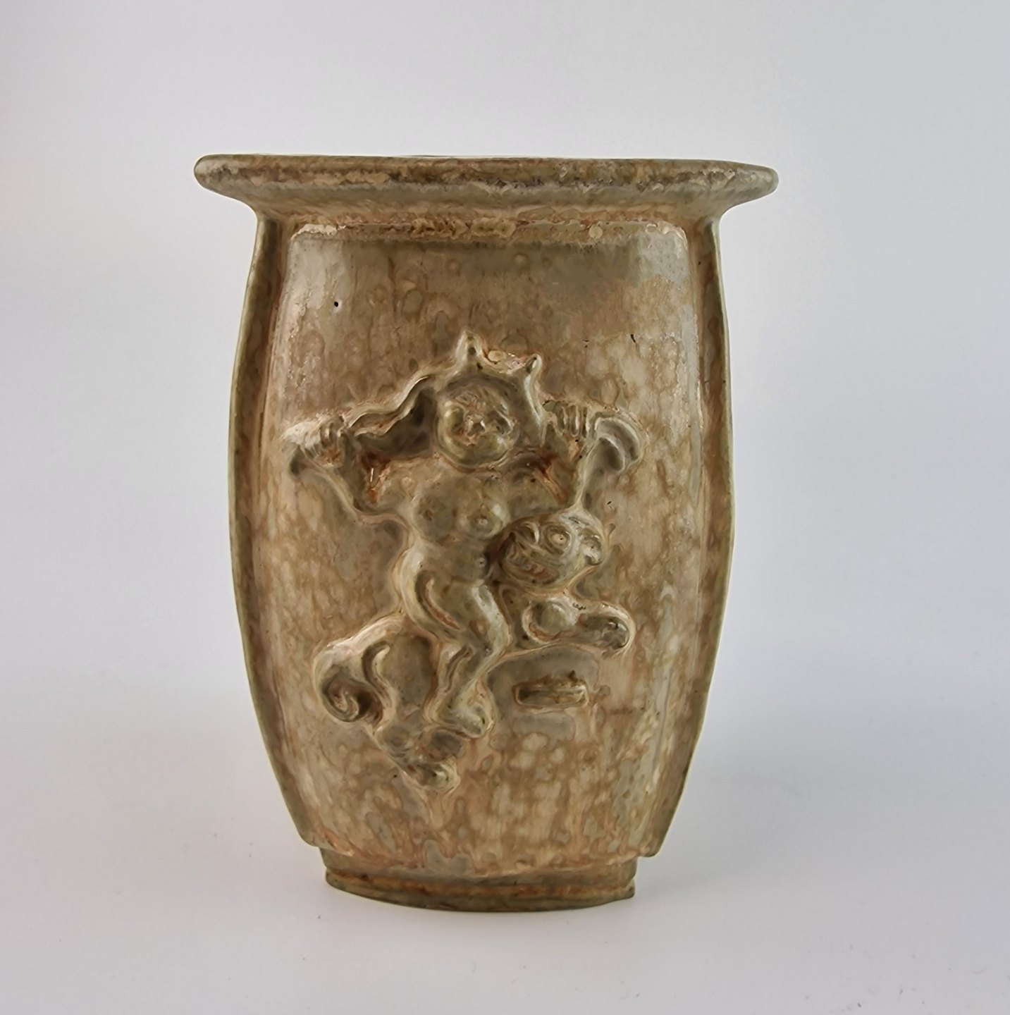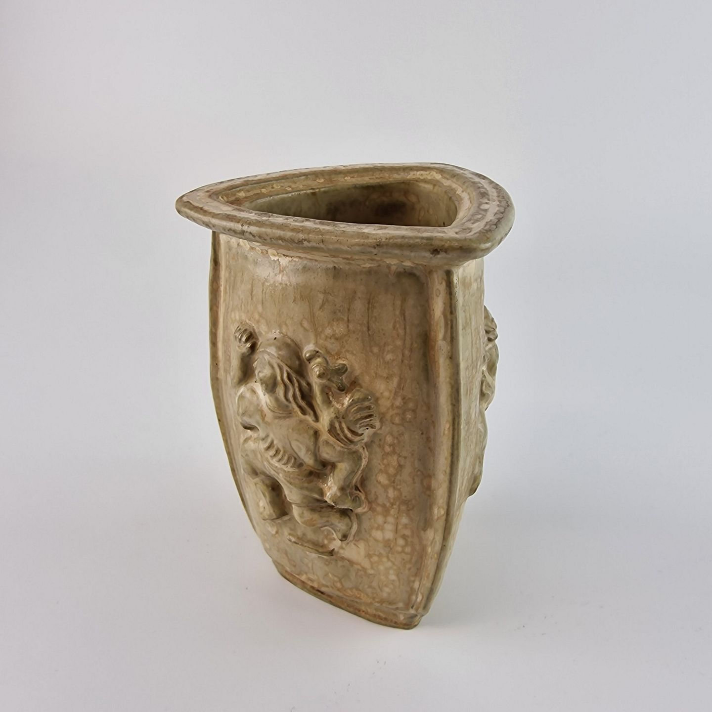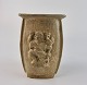 Trekantet vase med motiv på alle tre sider. Mangler låget.
