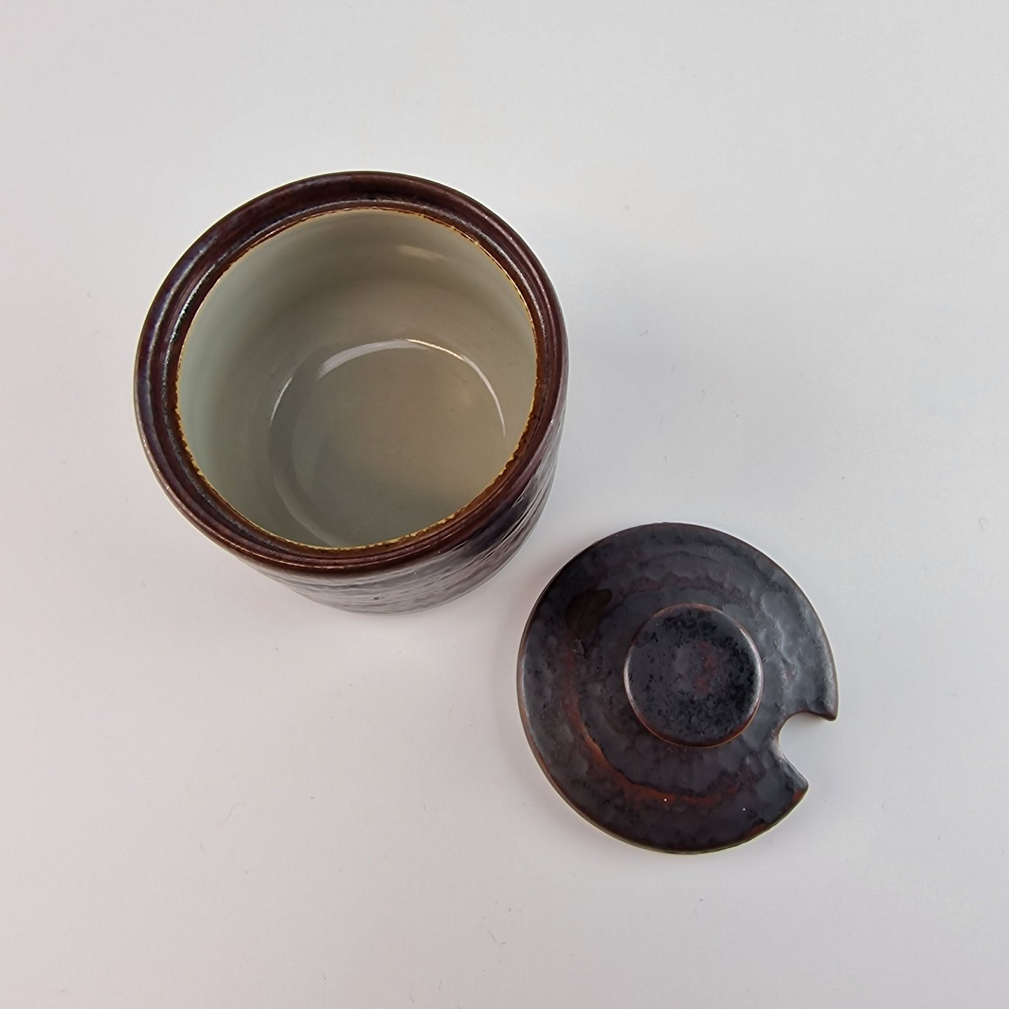 Skål med låg fra stellet Thule. I låget er der hul til ske