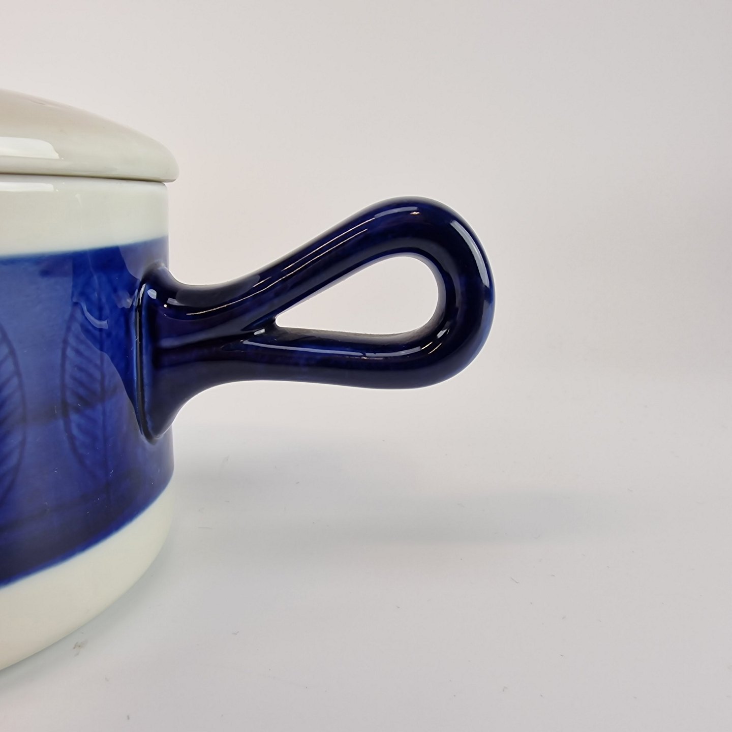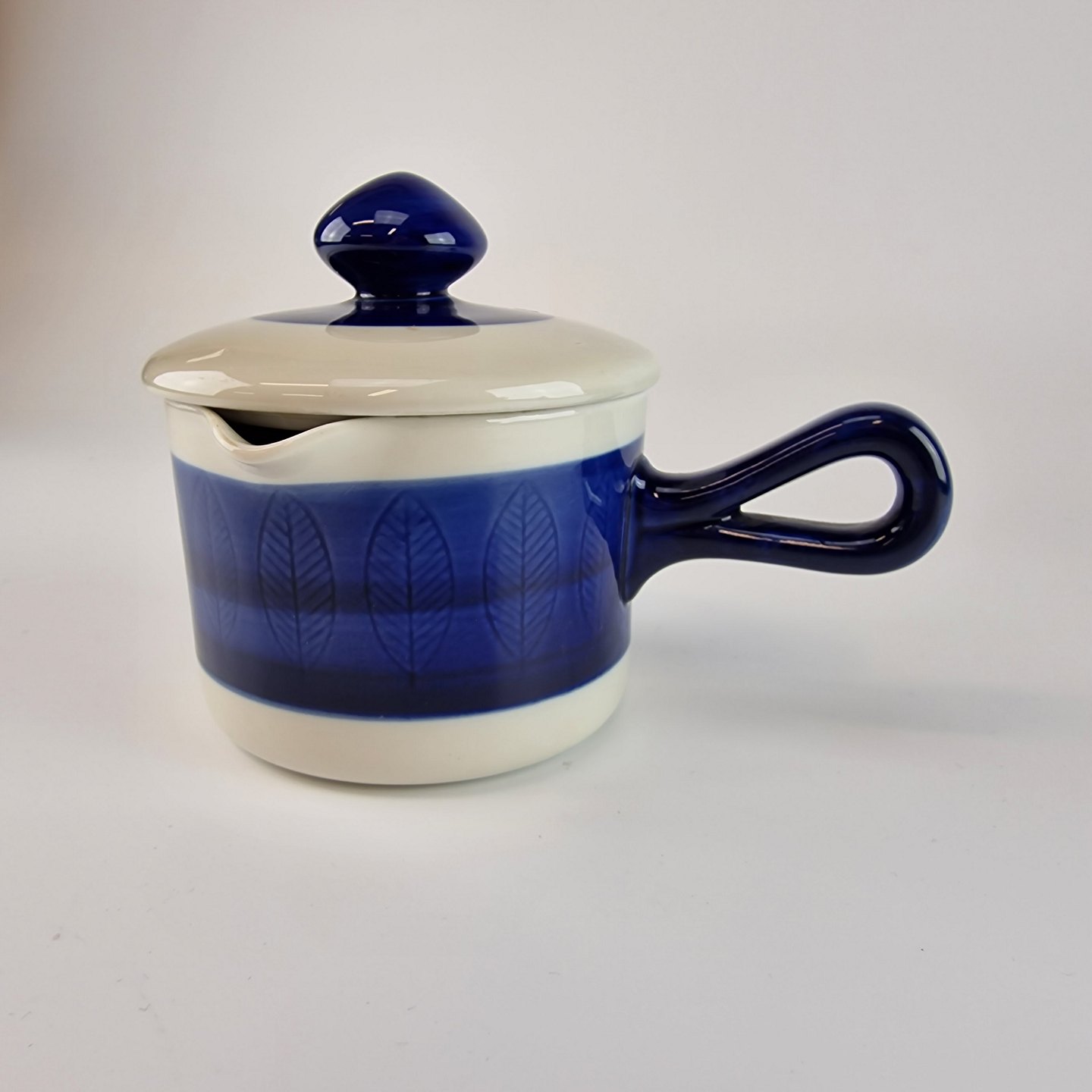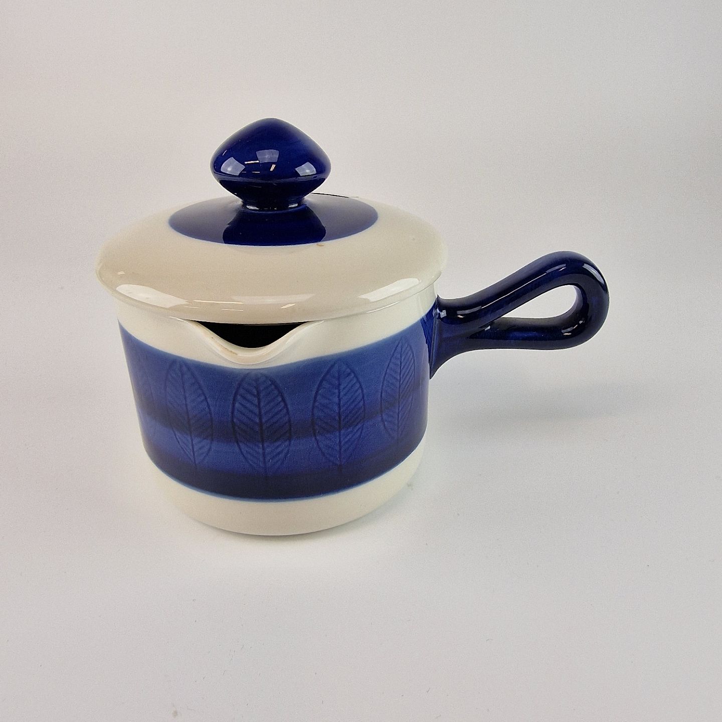 Skål med låg, hank og hældetud fra stellet Blå Koka. No 104