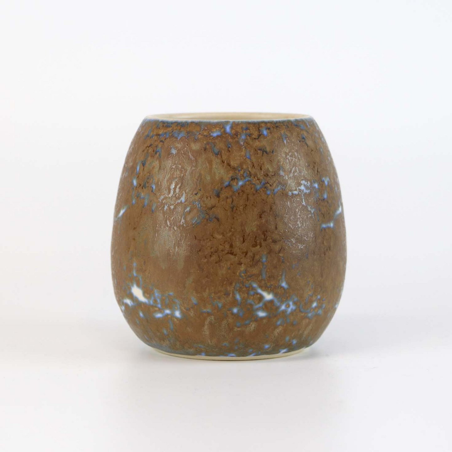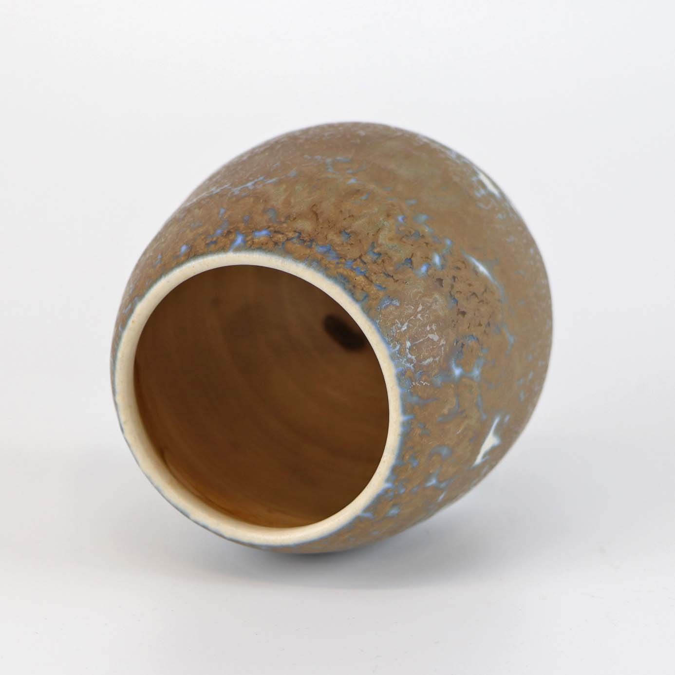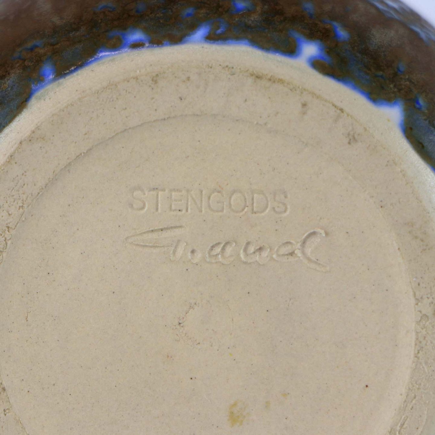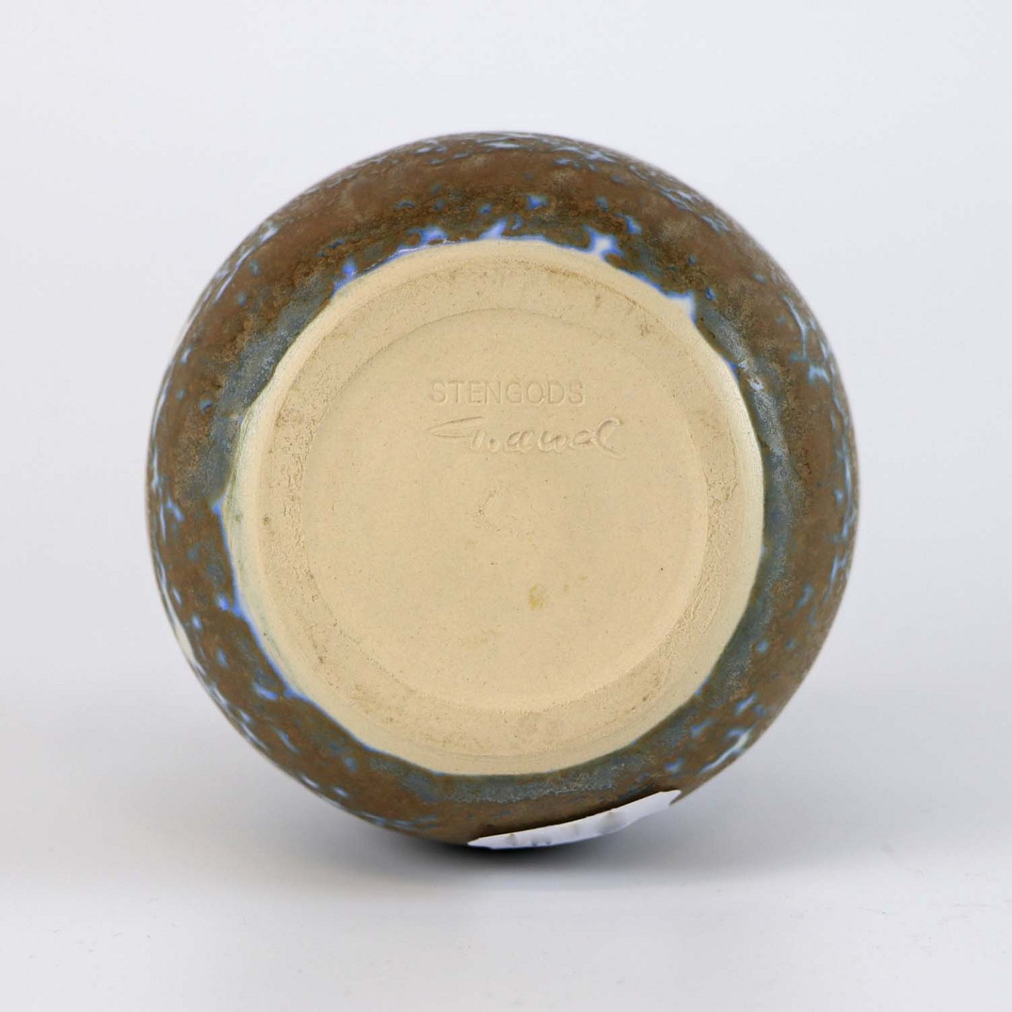 Vase, stentøj, hvid og blå underlag og brun overlag