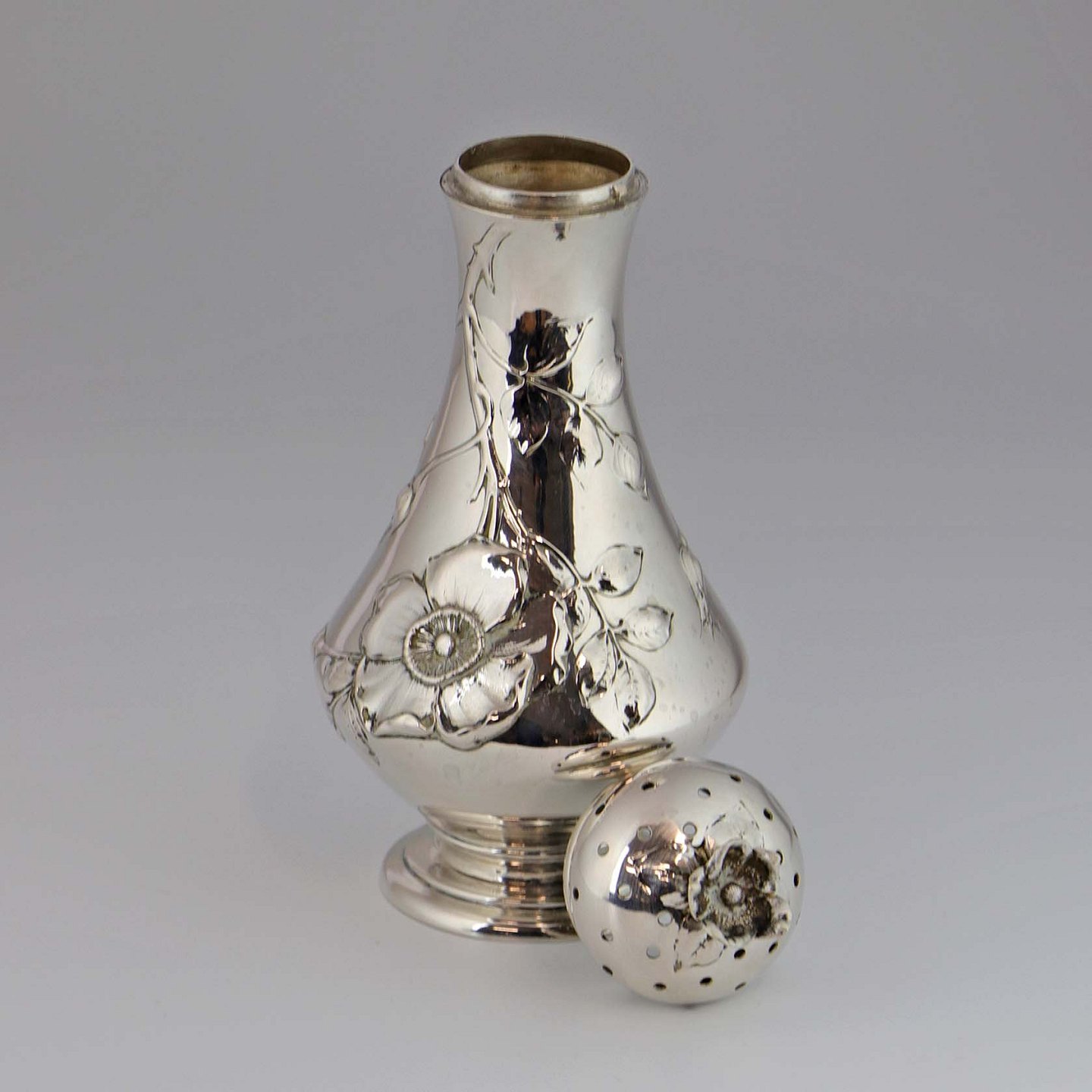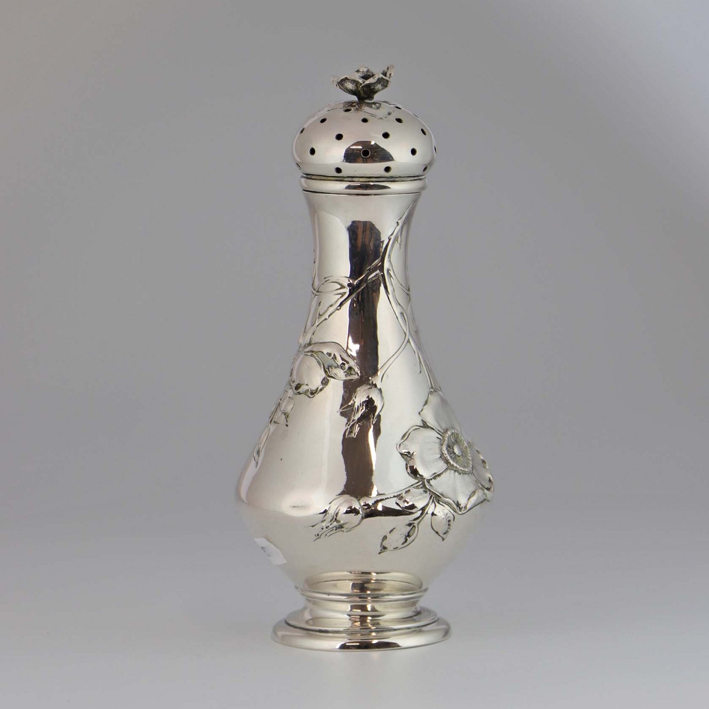 Sukkerstrø af tretårnet sølv dekoreret med blomster og blade