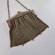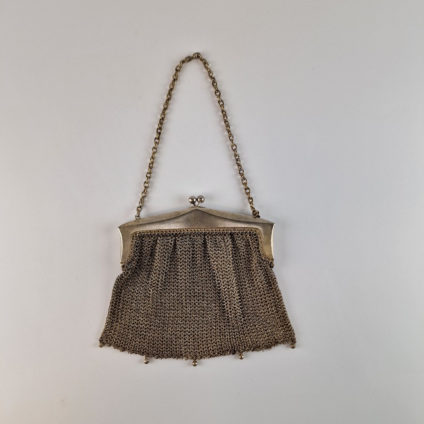 Aftentaske med kort rem. Tasken er lavet af små ringe som en brynje. Stemplet Alpacca og RK
