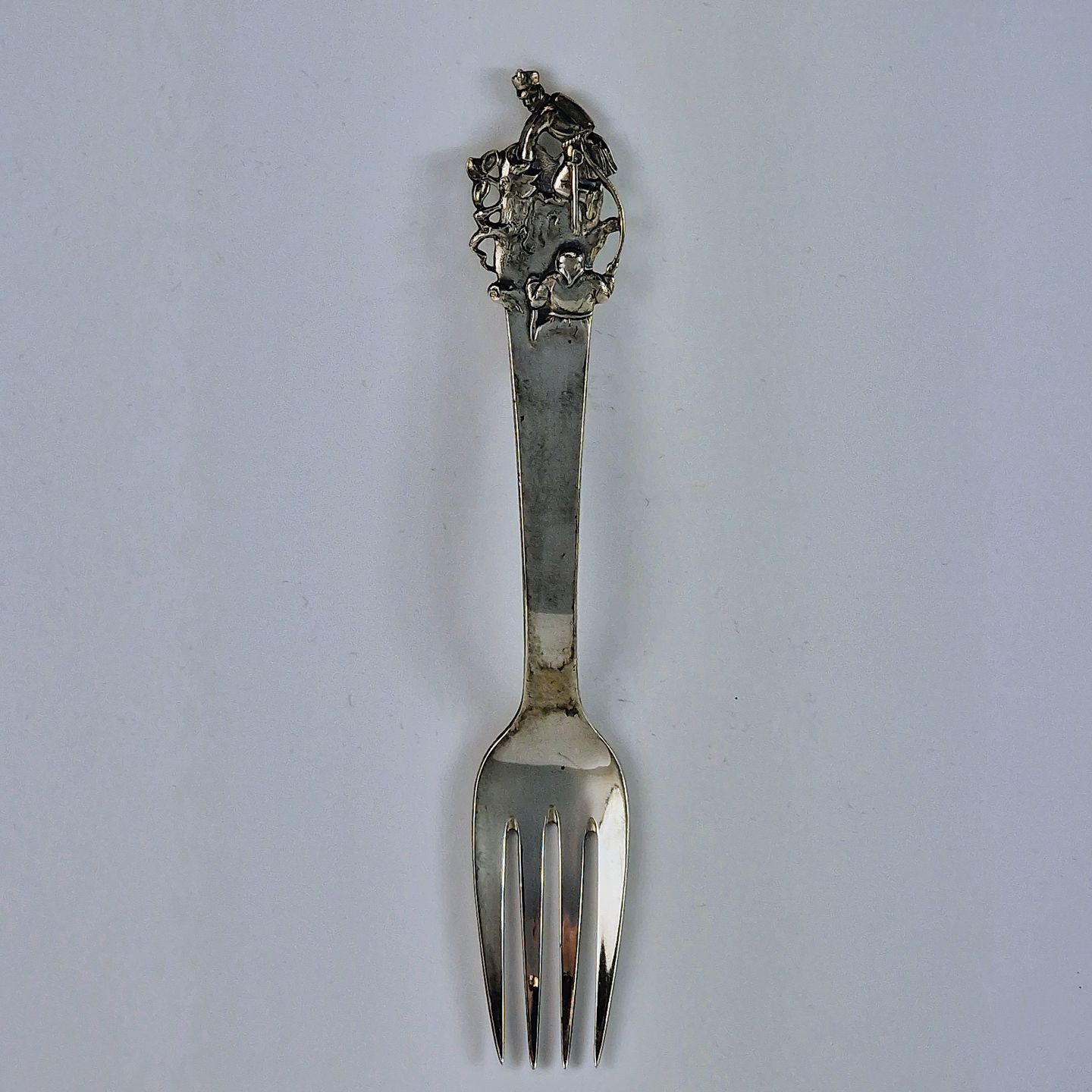 H.C. Andersen barnegaffel i sølv. Med motiv fra eventyret Fyrtøjet