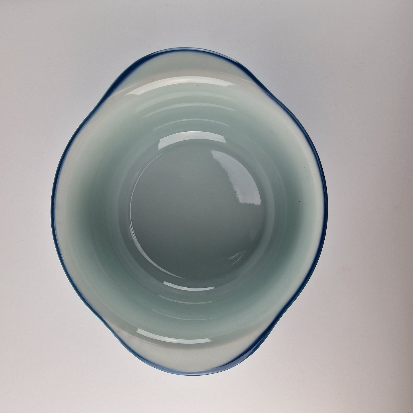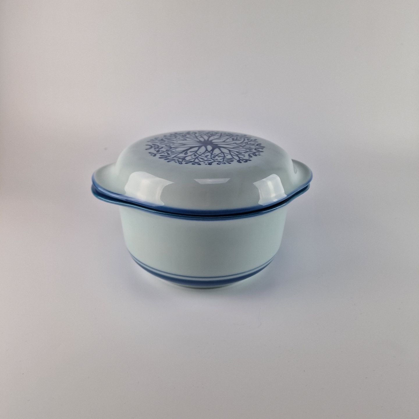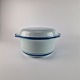 Stellets runde former er dækket med en silkeblød glasur og håndmalet med er lys almueblå farve lagt under glasuren. Stellet er ovnfast