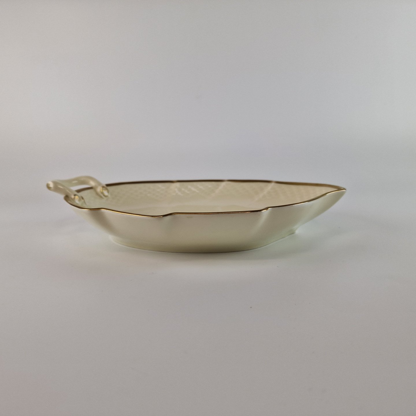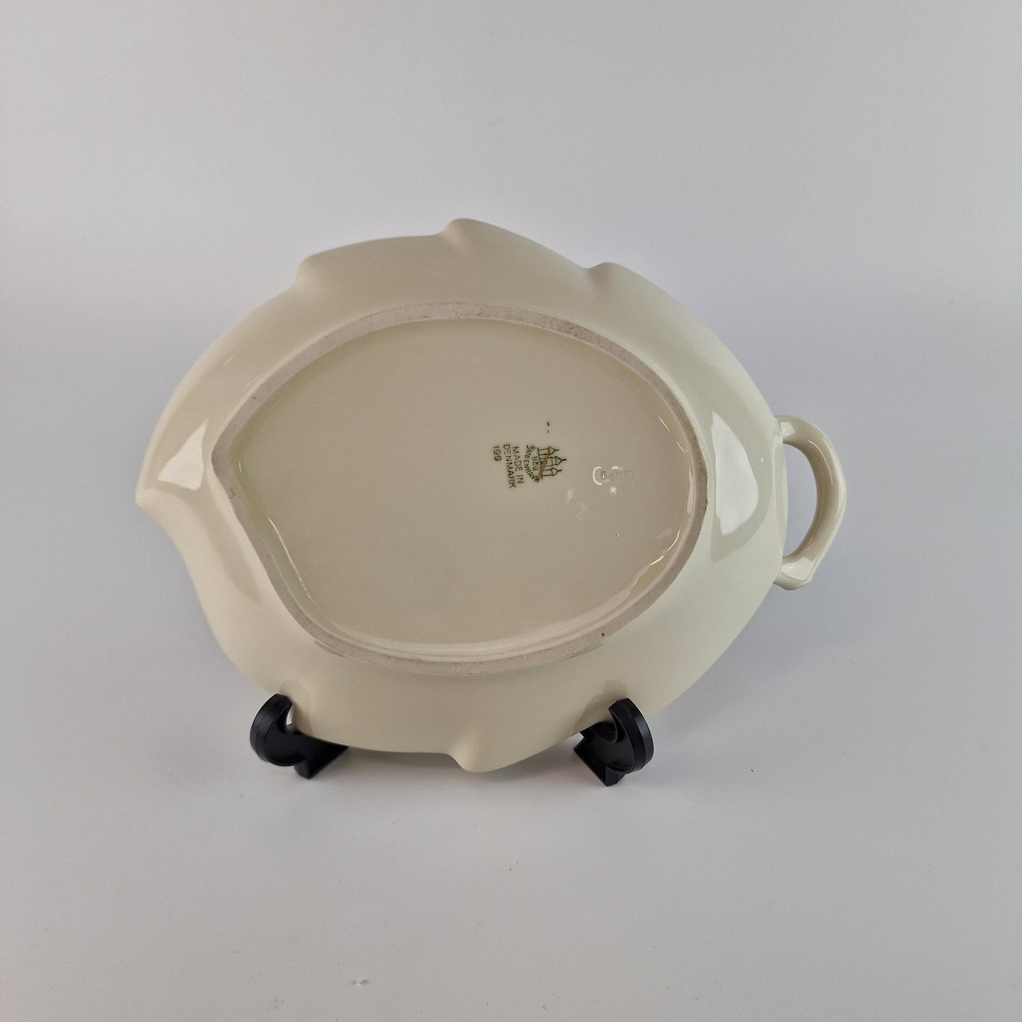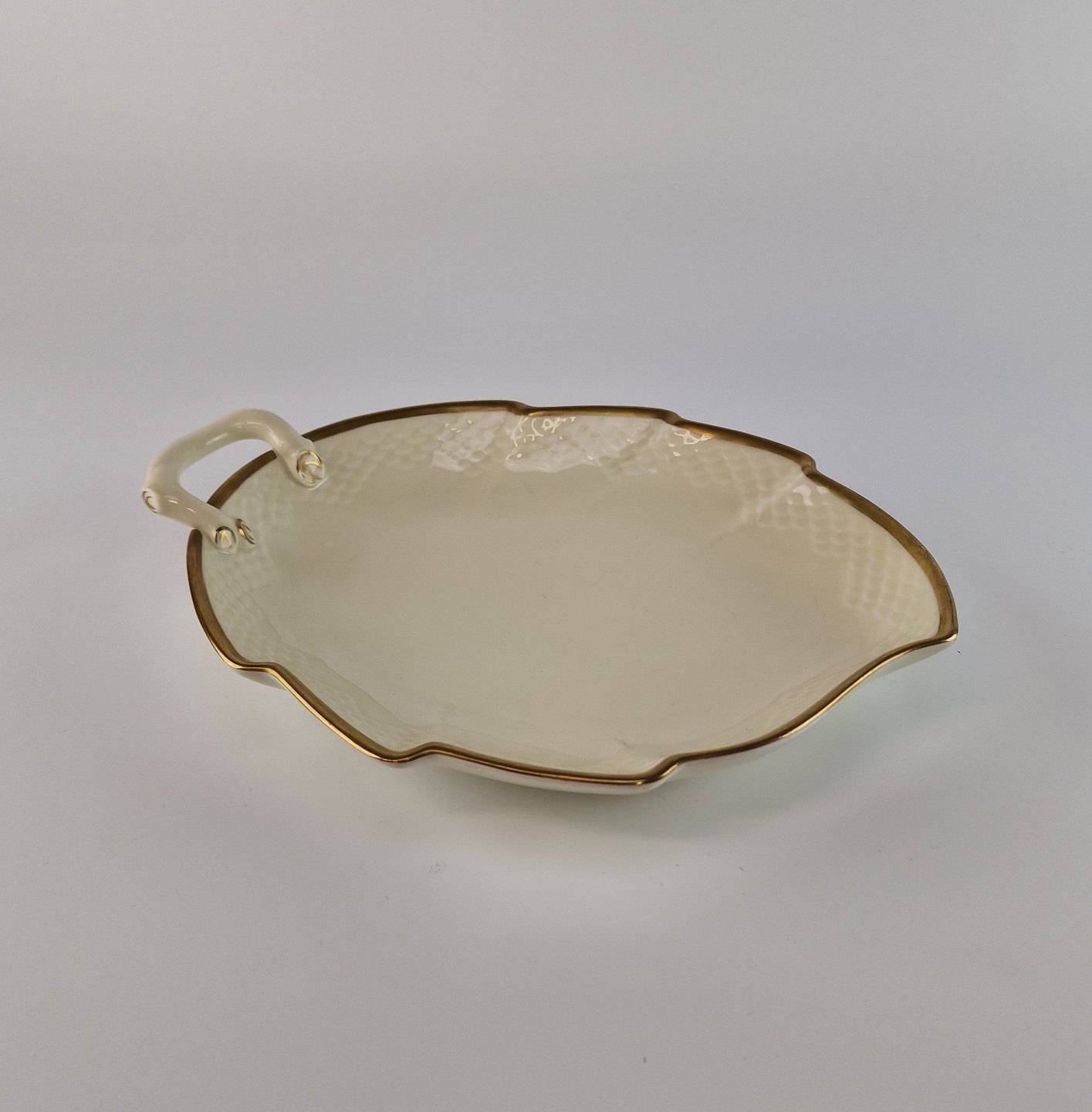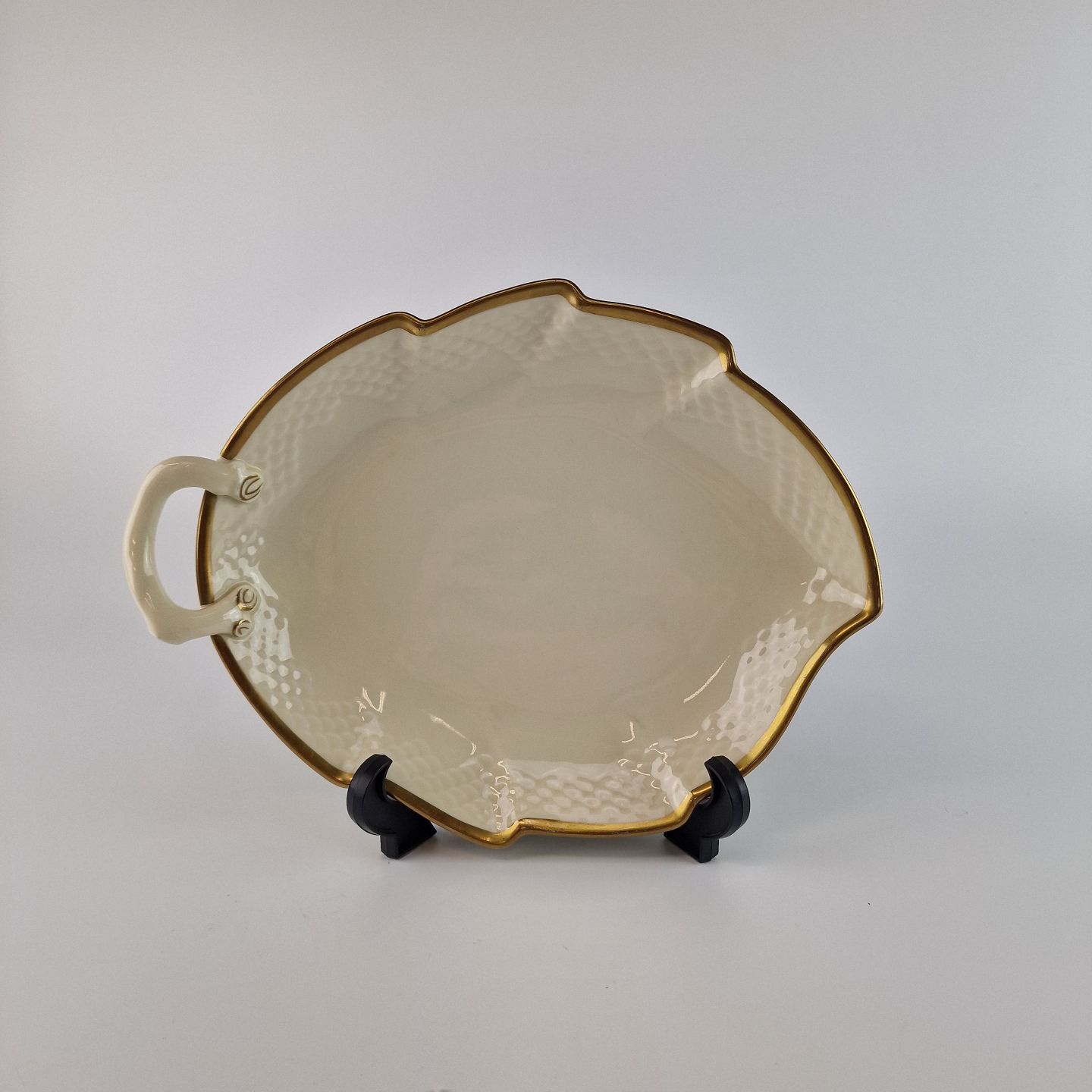 Åkjær er cremefarvet porcelæn med guldkant og mønster som ligner skæl