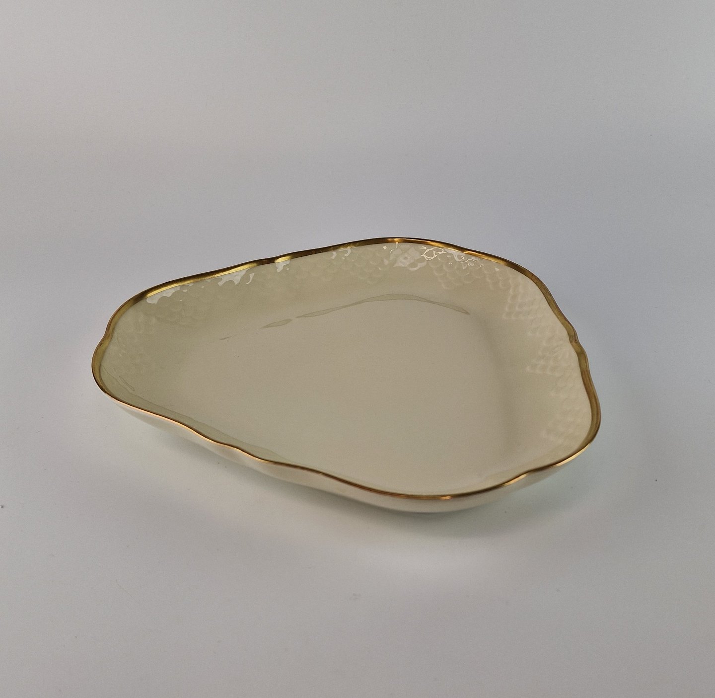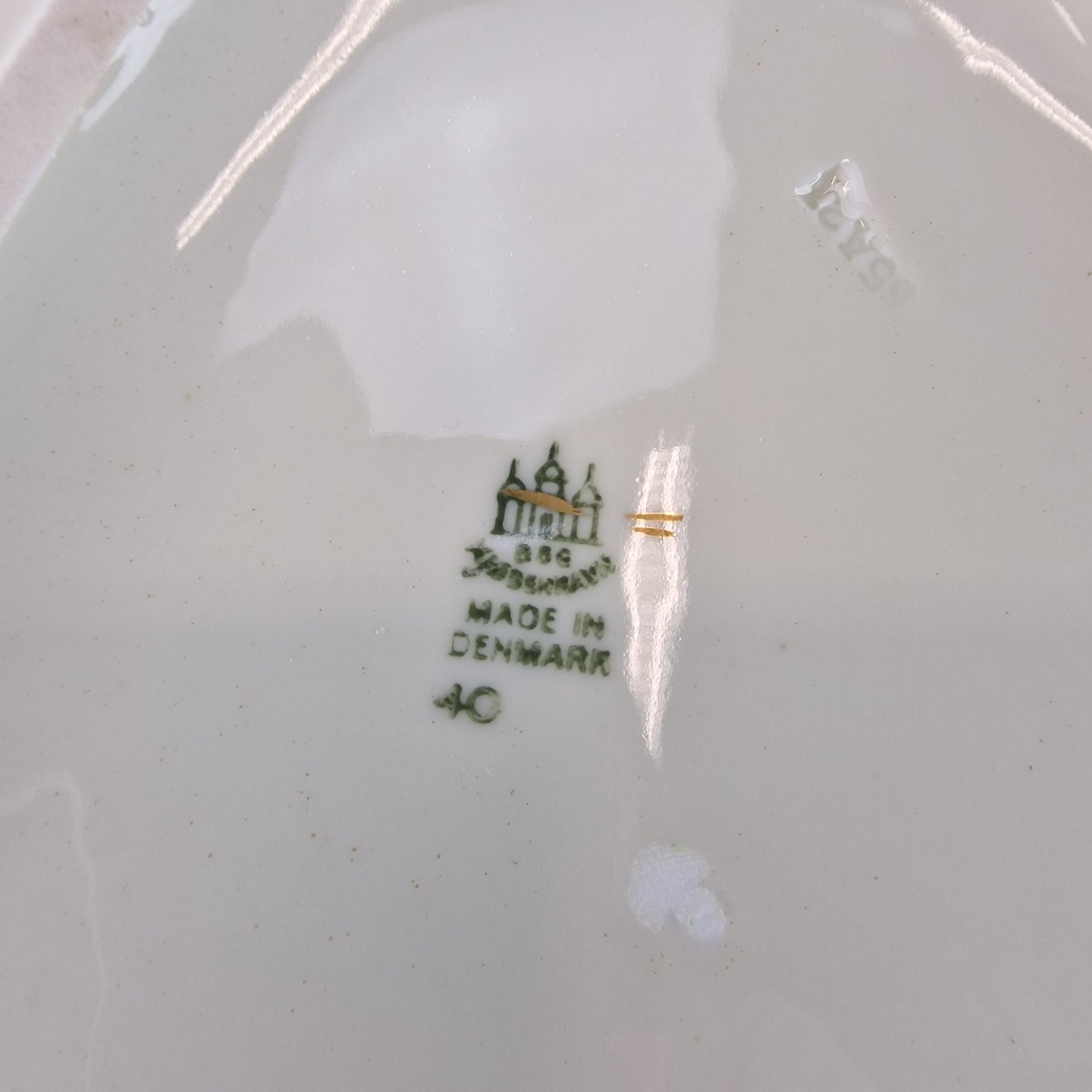 Åkjær er cremefarvet porcelæn med guldkant og mønster som ligner skæl
