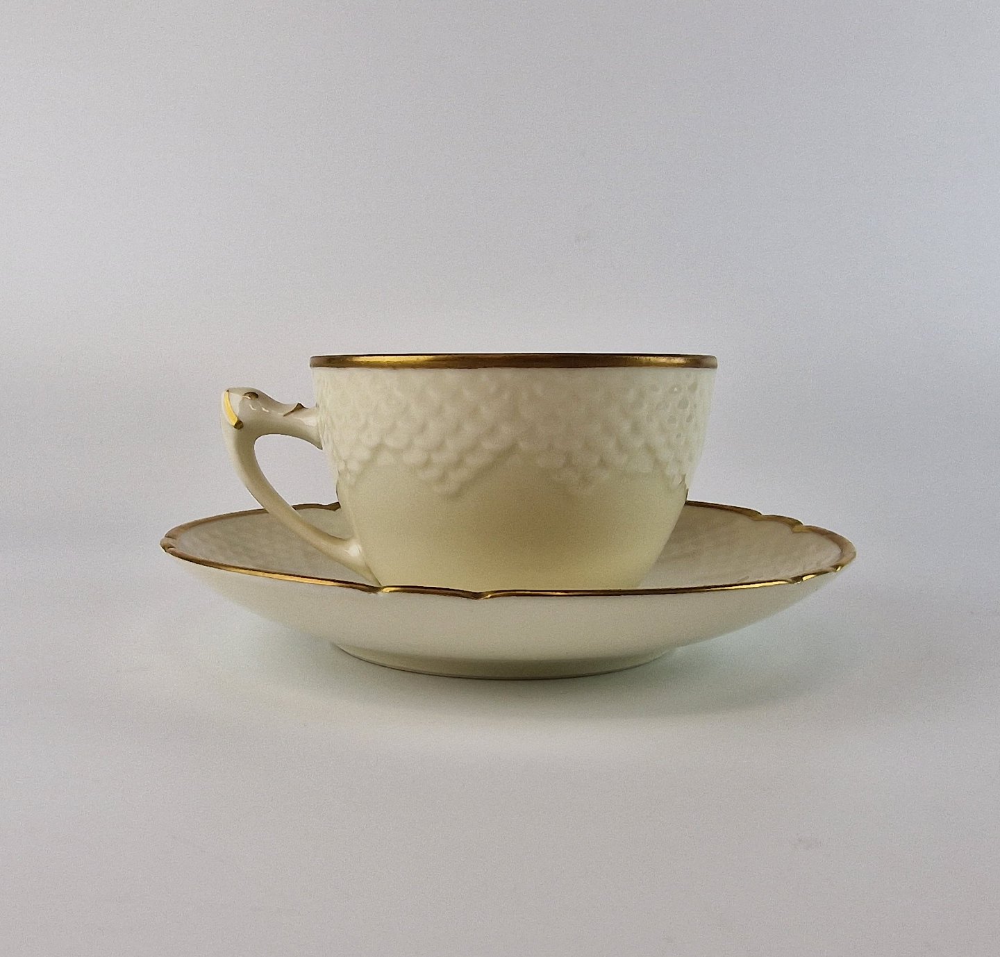 Åkjær er cremefarvet porcelæn med guldkant og mønster som ligner skæl