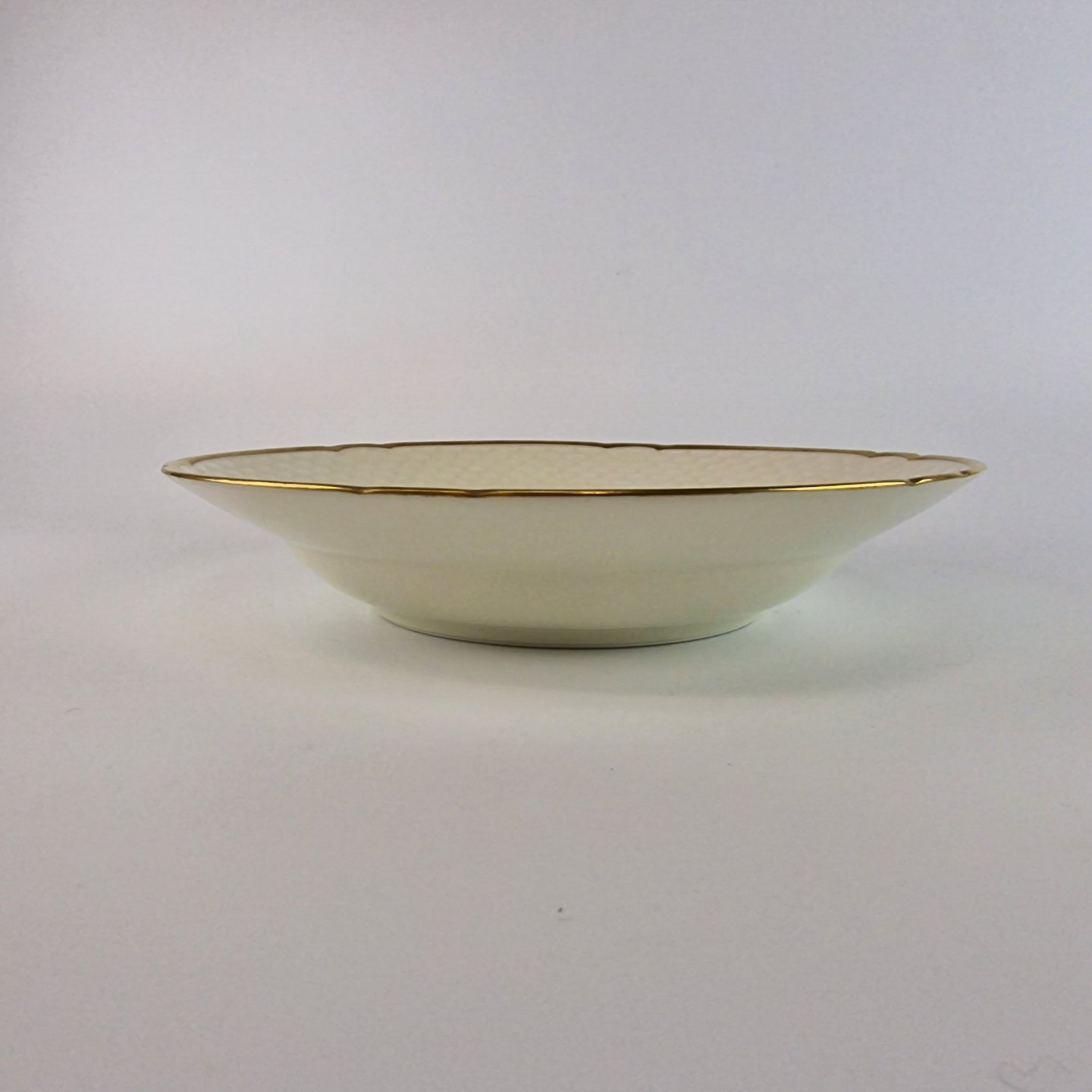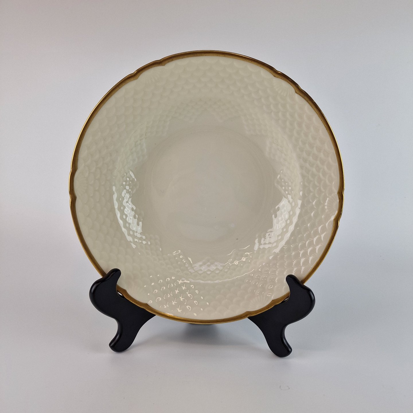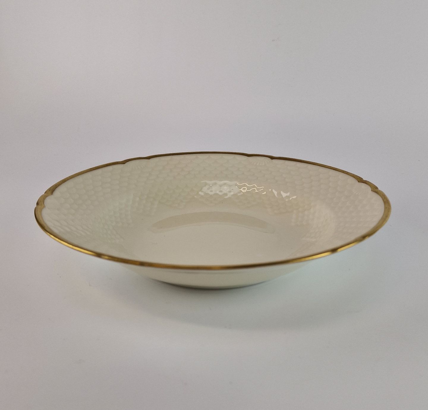 Åkjær er cremefarvet porcelæn med guldkant og mønster som ligner skæl