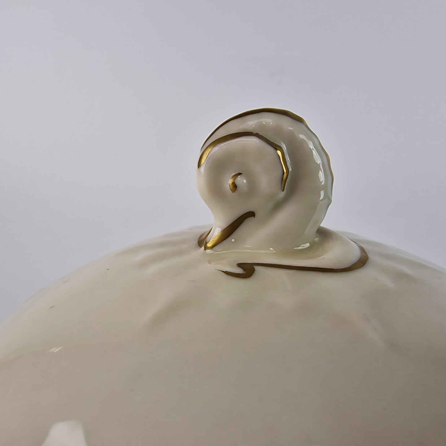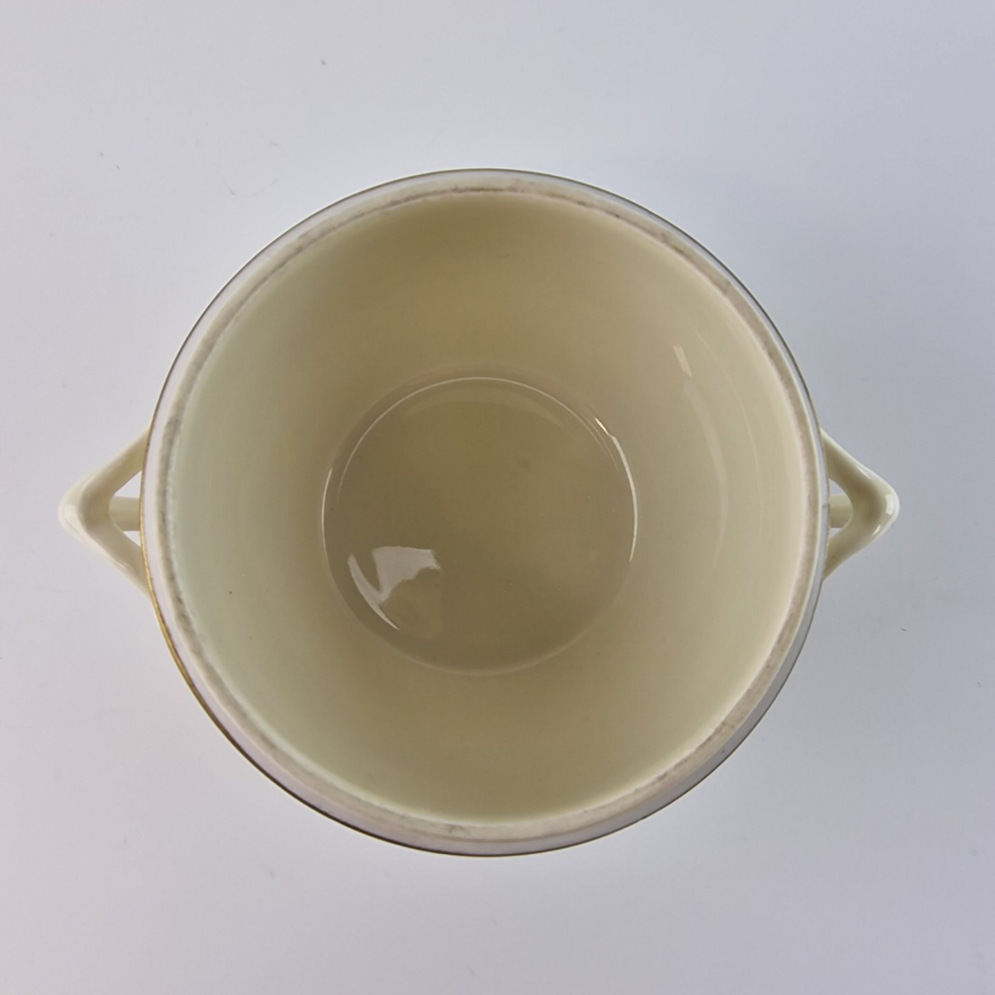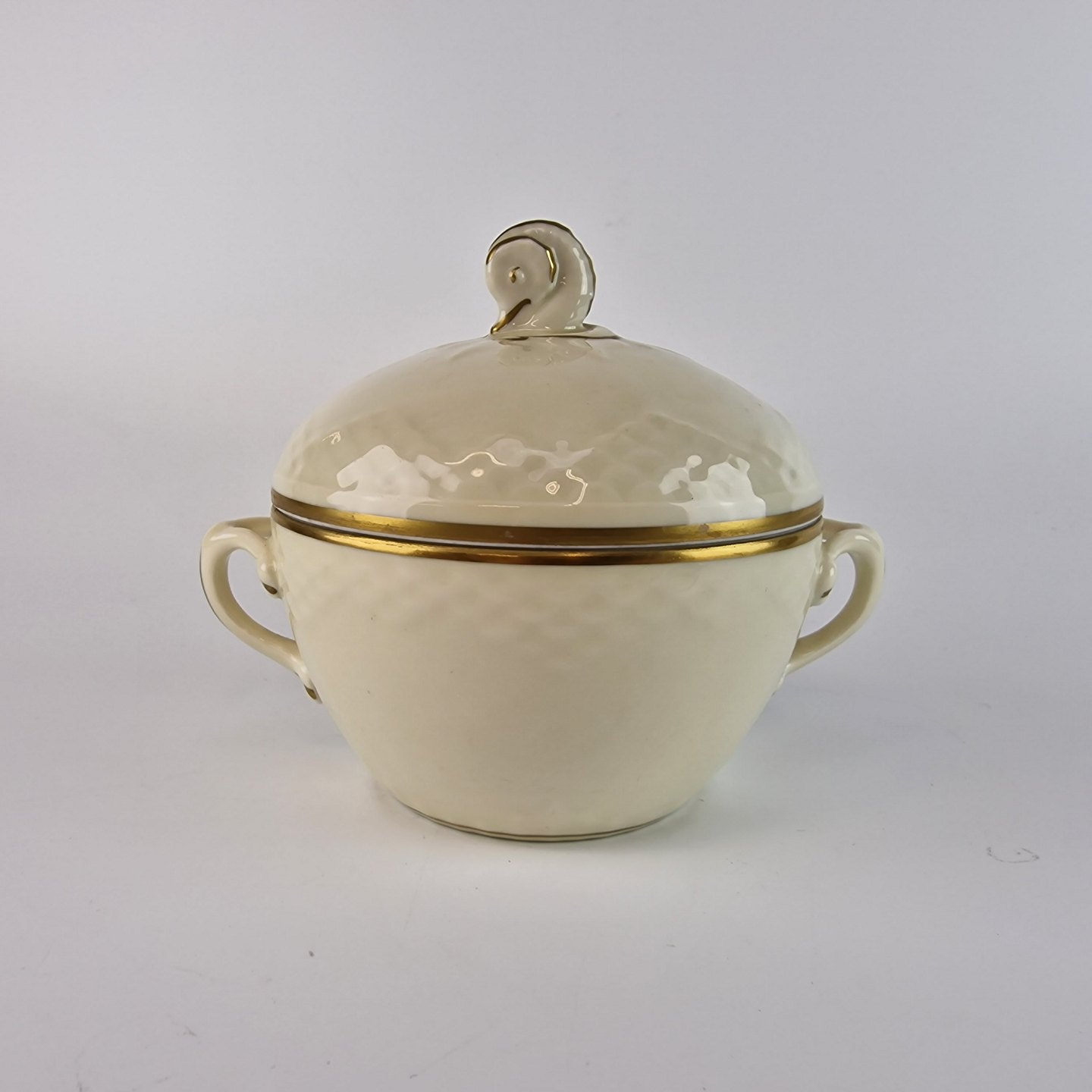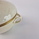 Åkjær er cremefarvet porcelæn med guldkant og mønster som ligner skæl