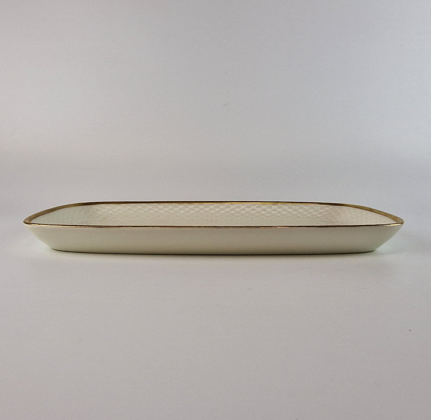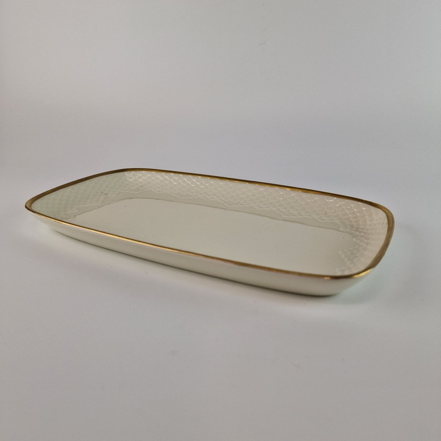 Åkjær er cremefarvet porcelæn med guldkant og mønster som ligner skæl