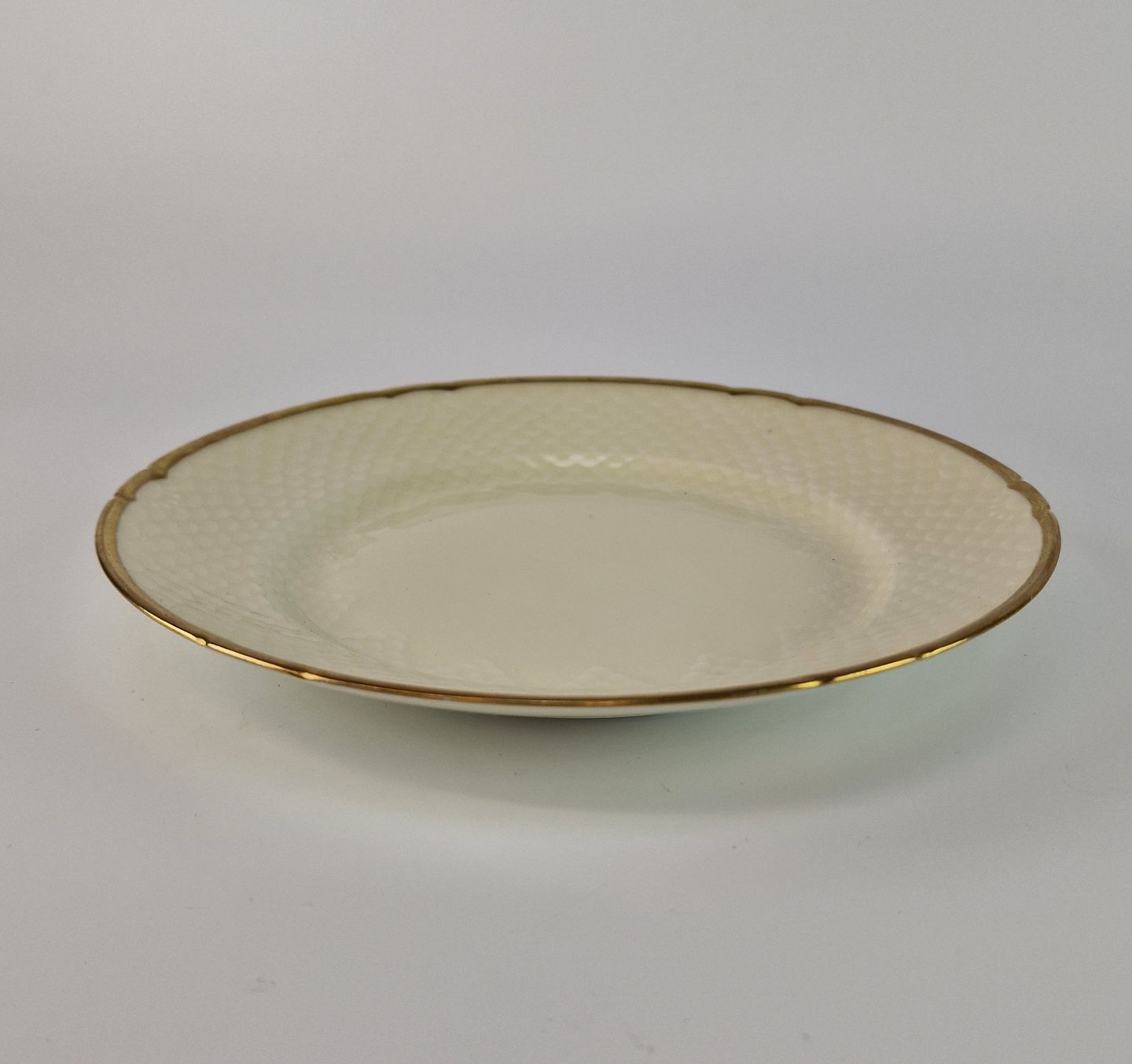 Åkjær er cremefarvet porcelæn med guldkant og mønster som ligner skæl