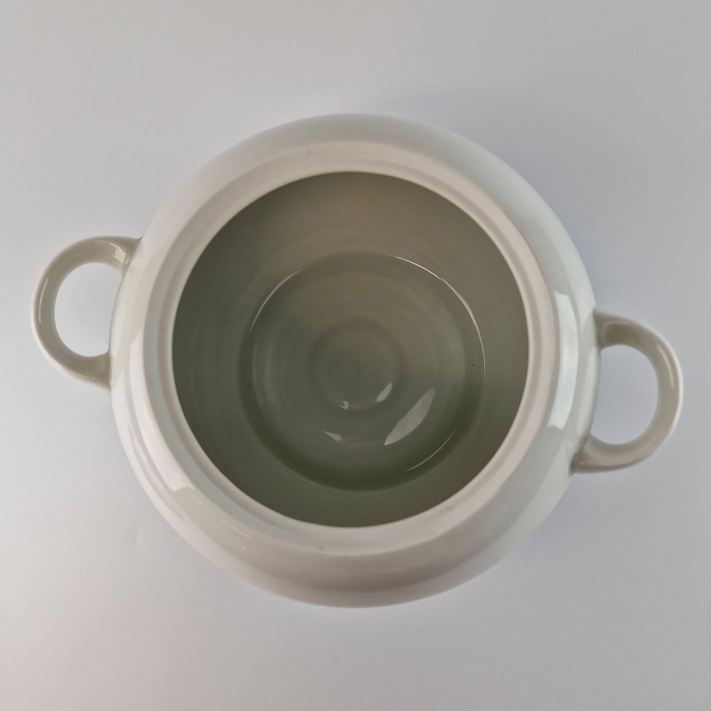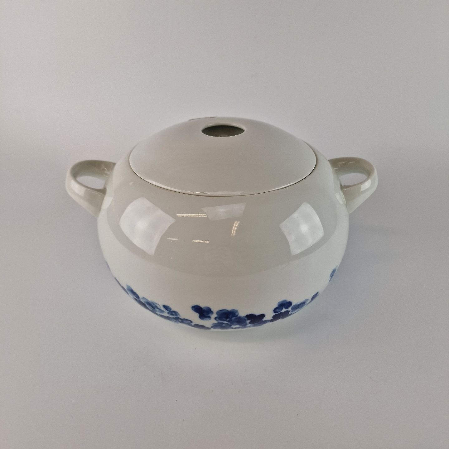 Troja er af kraftigt hvidt porcelæn med mønster af blå blomster