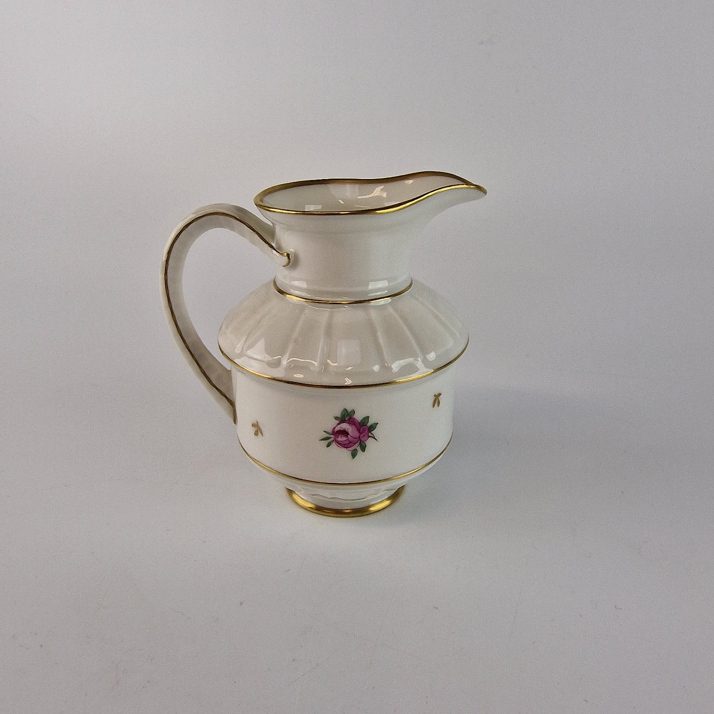 Roselil er kantet hvidt porcelæn med bred guldkant og er dekoreret med roser og blade