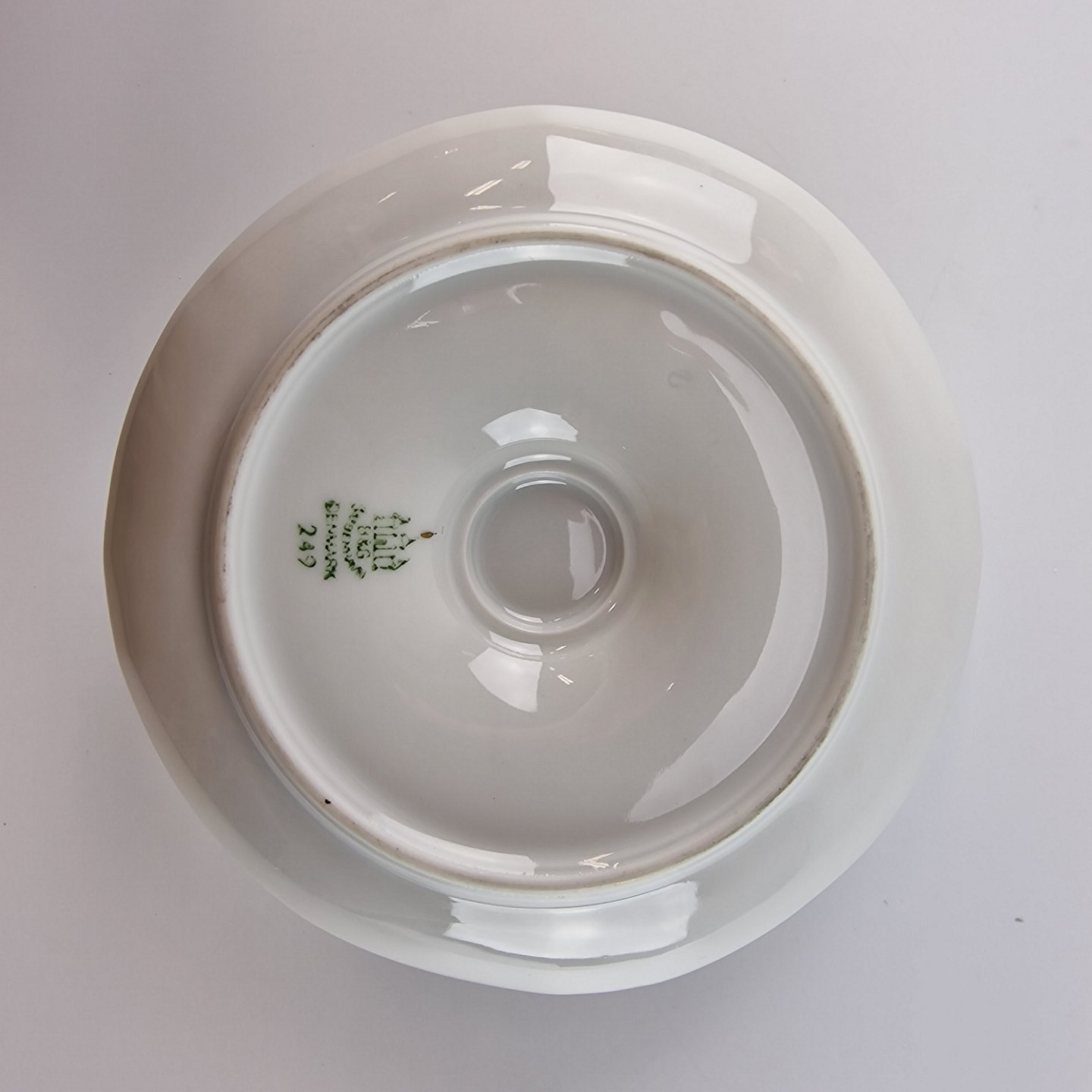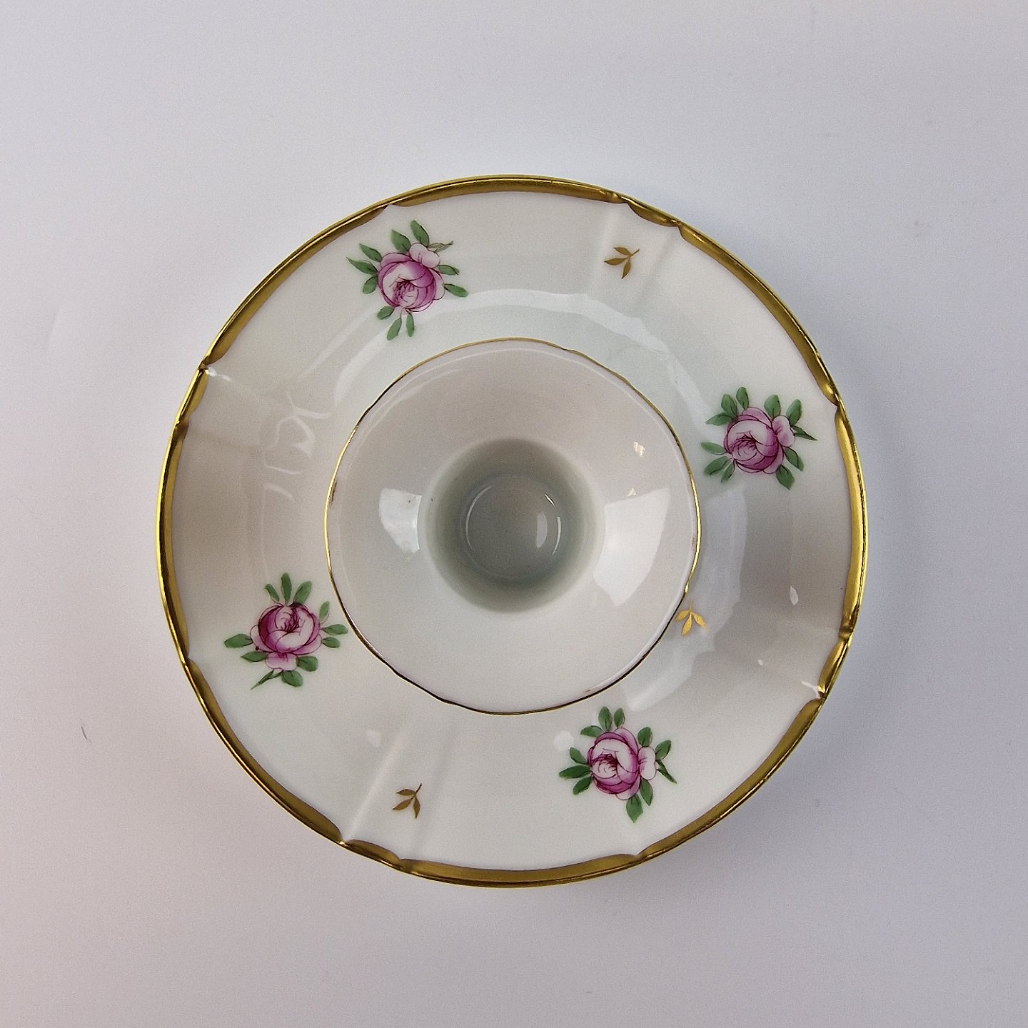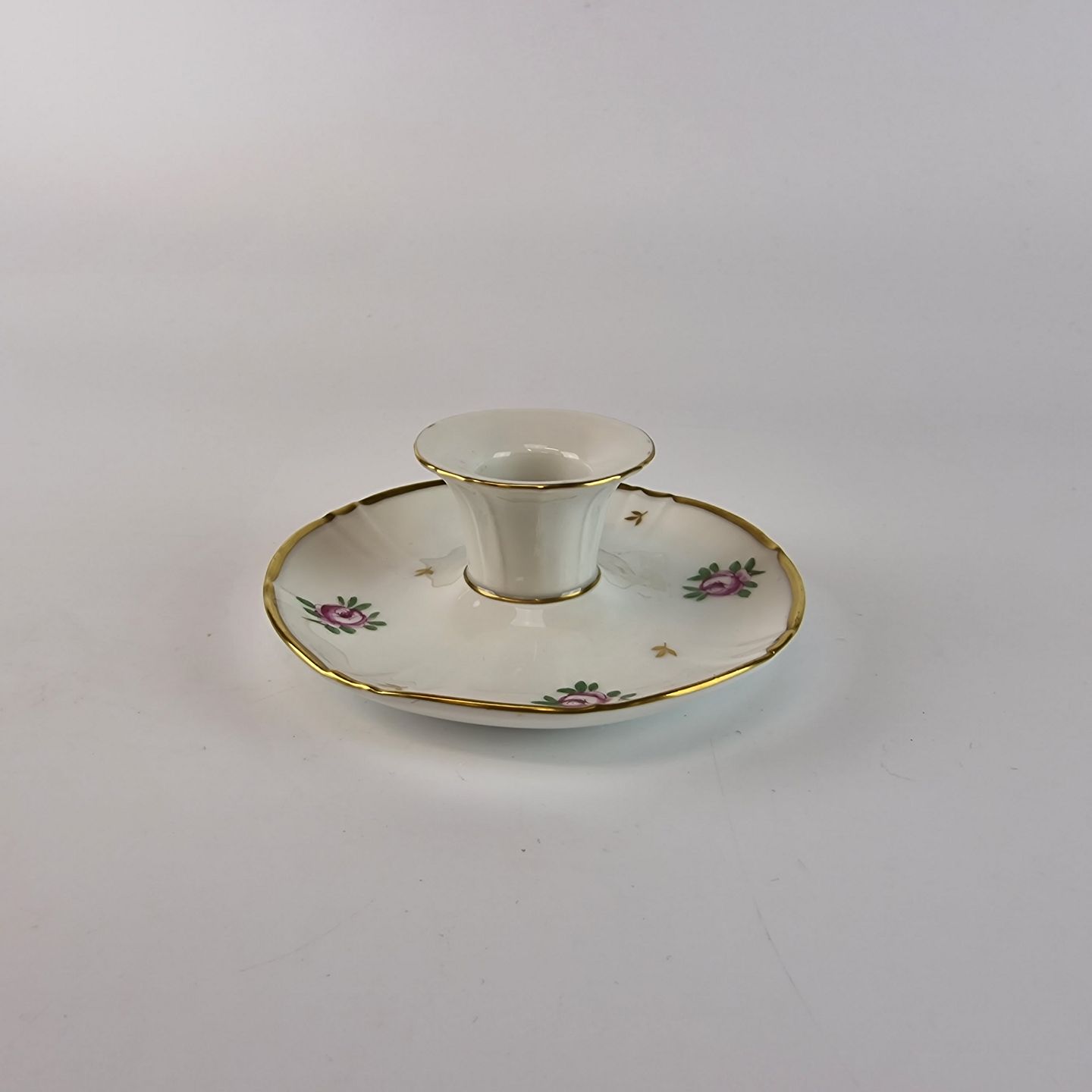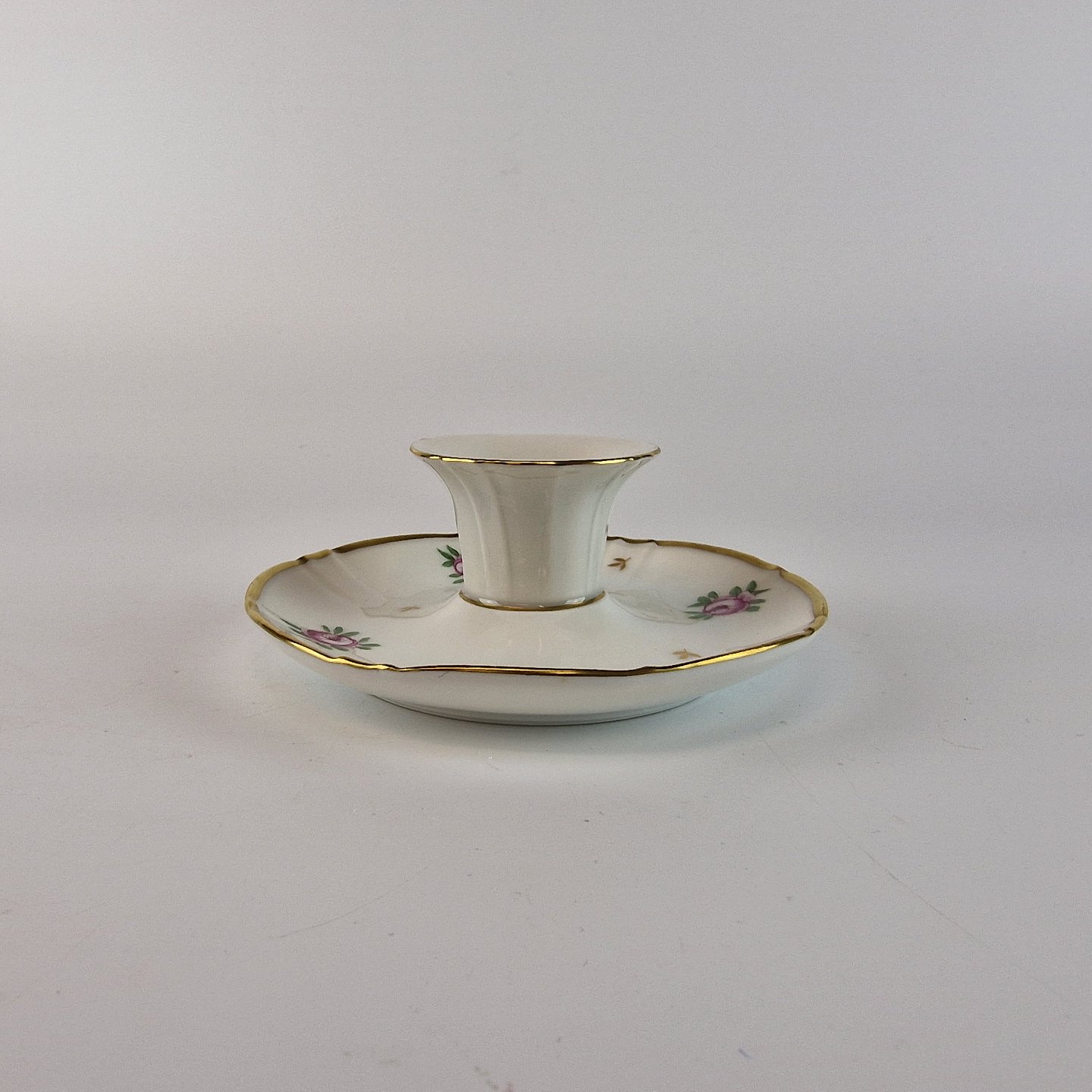 Roselil er kantet hvidt porcelæn med bred guldkant og er dekoreret med roser og blade