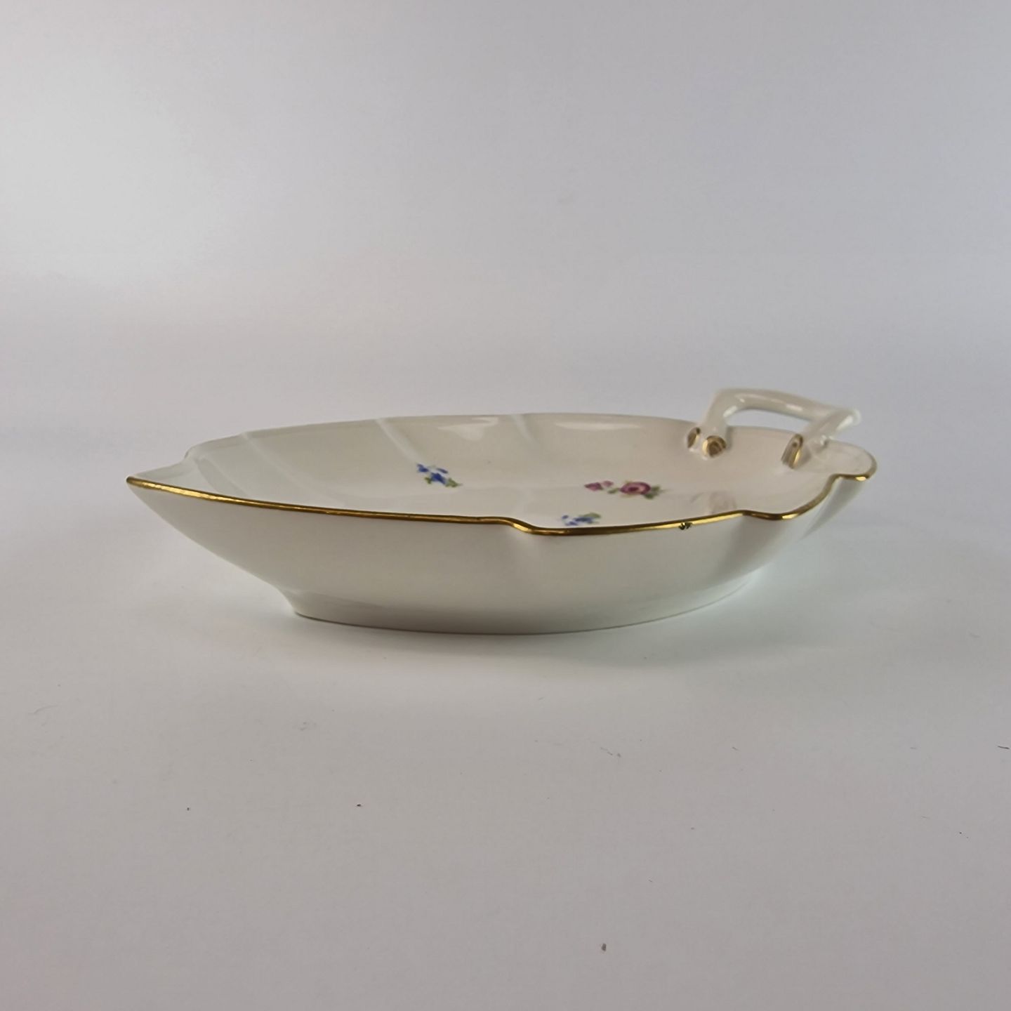 Roselil er kantet hvidt porcelæn med bred guldkant og er dekoreret med roser og blade