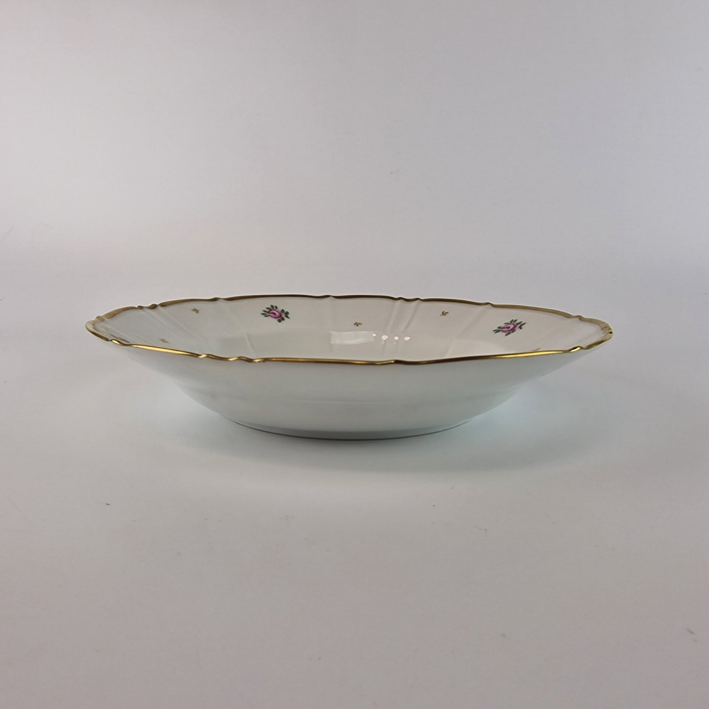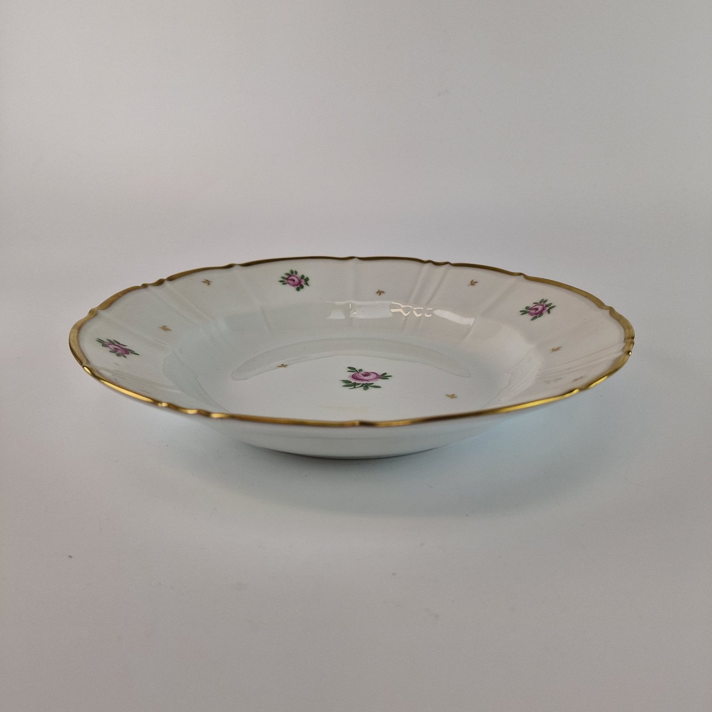 Roselil er kantet hvidt porcelæn med bred guldkant og er dekoreret med roser og blade