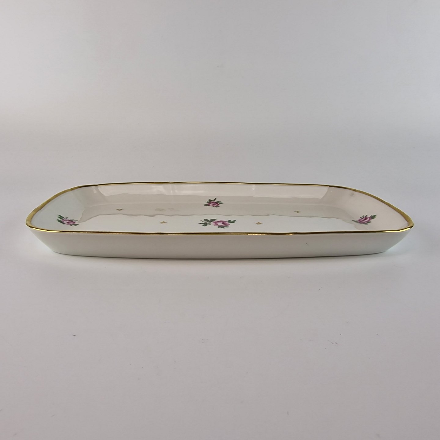 Roselil er kantet hvidt porcelæn med bred guldkant og er dekoreret med roser og blade