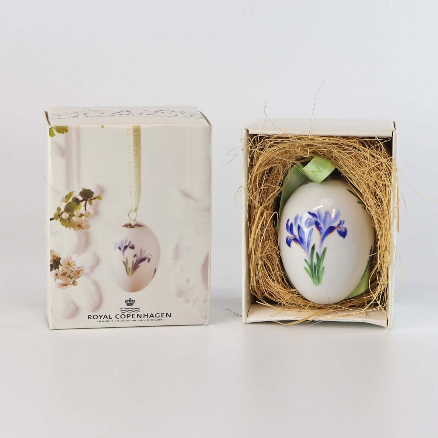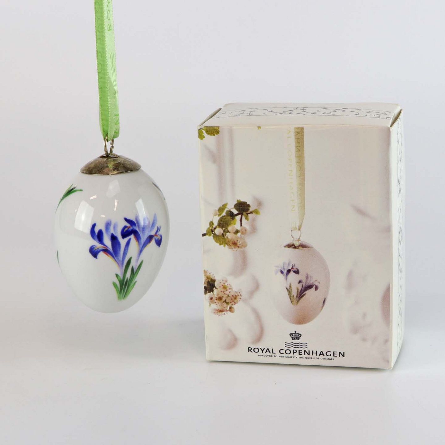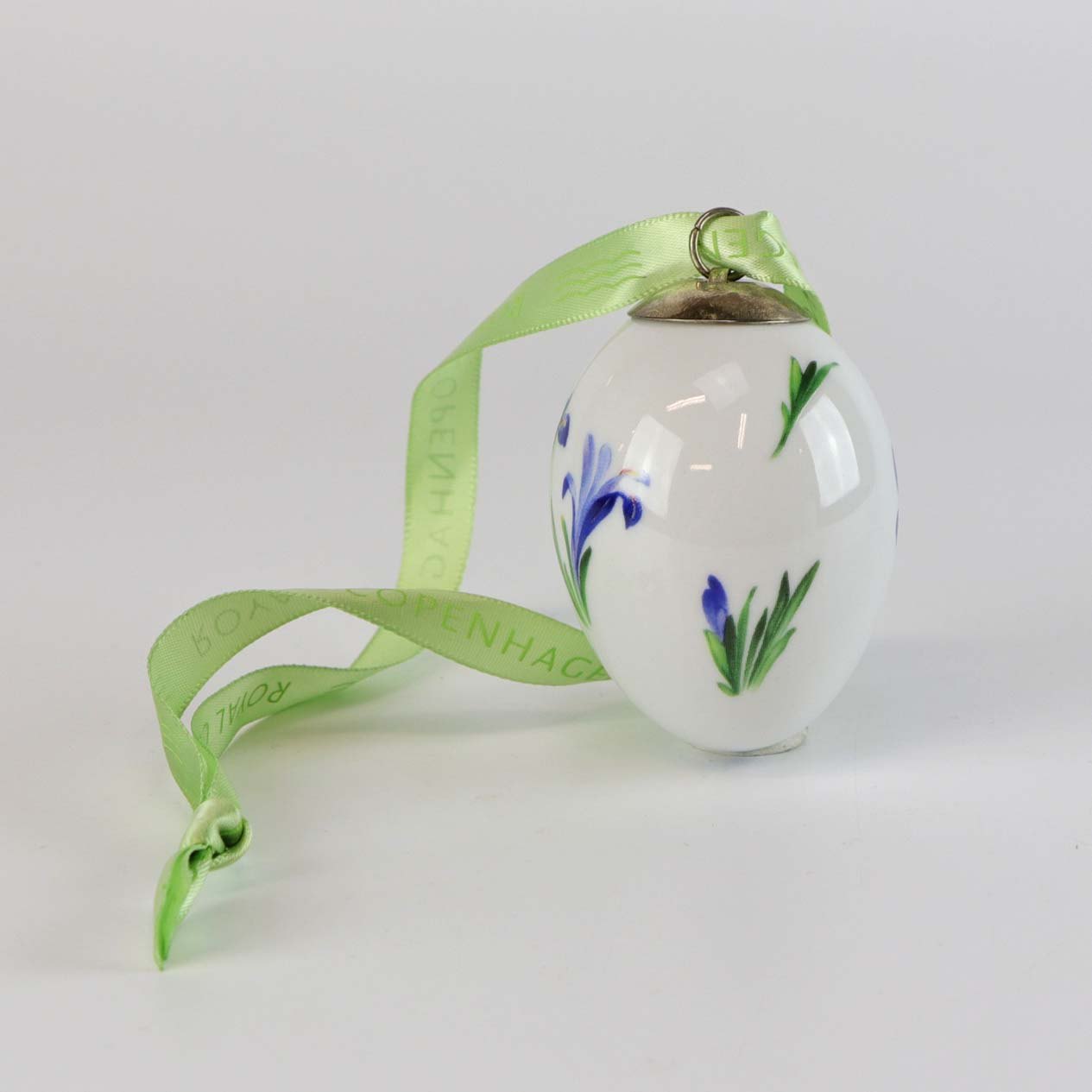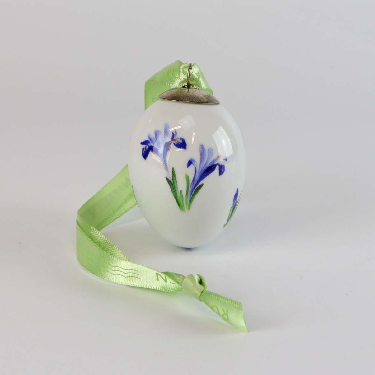 Håndlavet og håndmalet æg af porcelæn med bånd til ophæng. Fra serien Spring kollektion. Denne med motiv af en blå iris