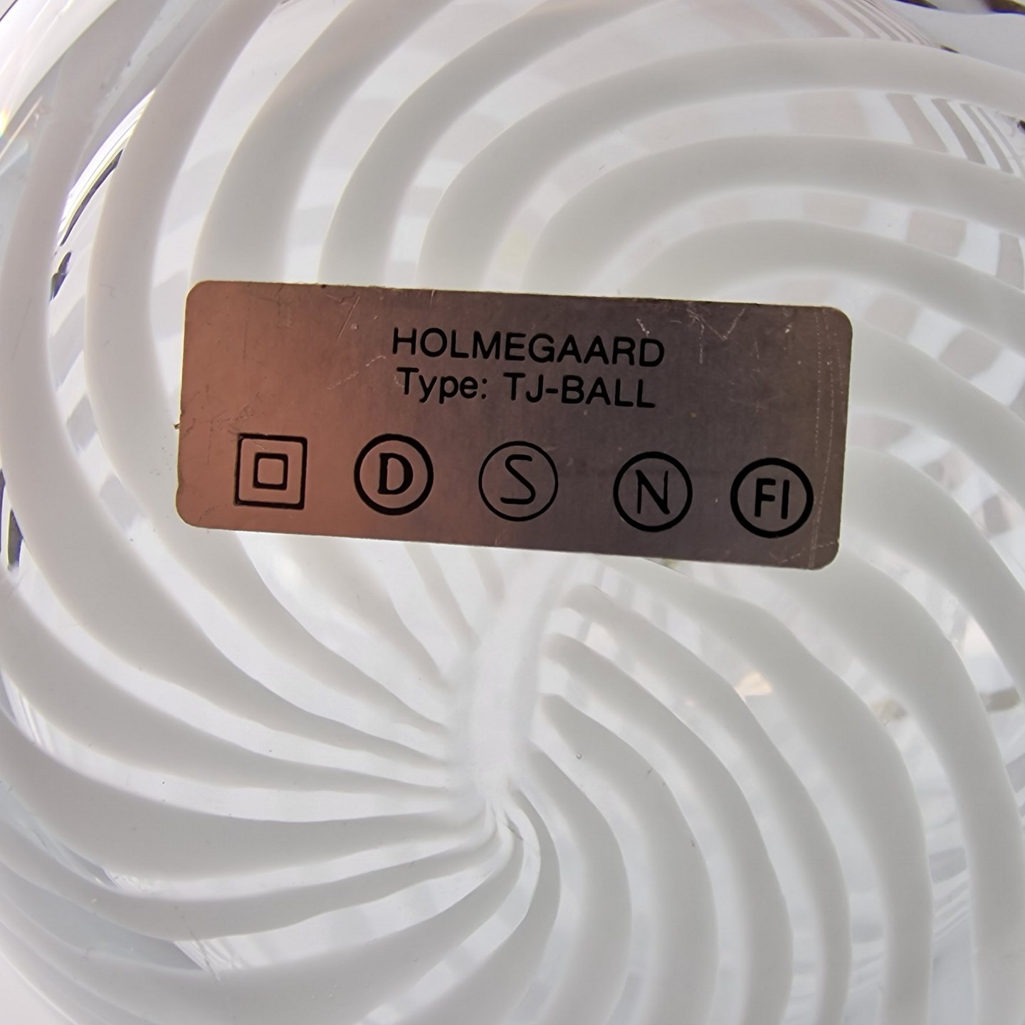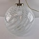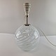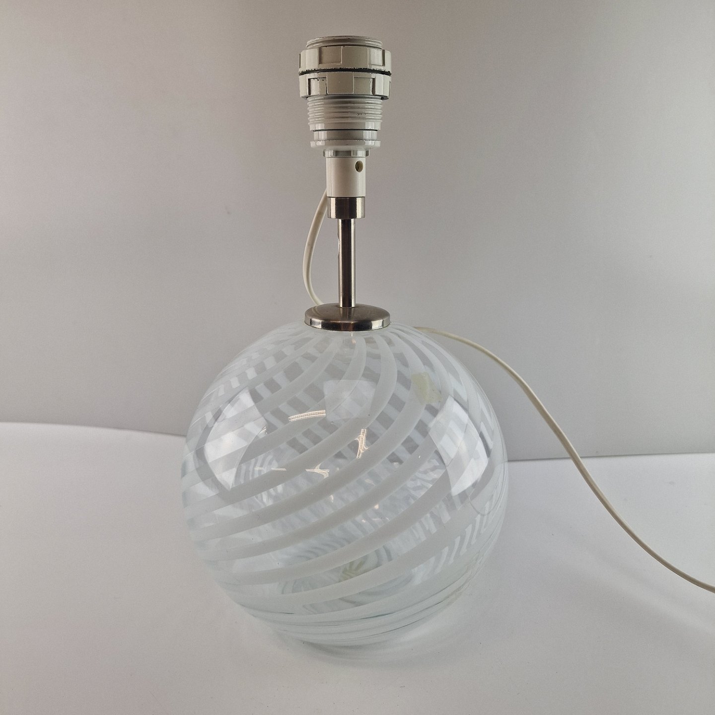 Mundblæst lampe af transparent glas med hvide striber, der understreger lampefodens runde form.