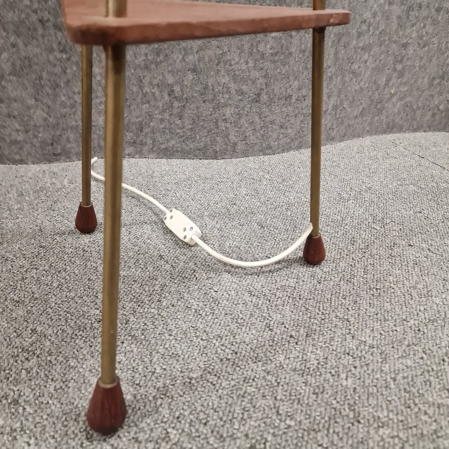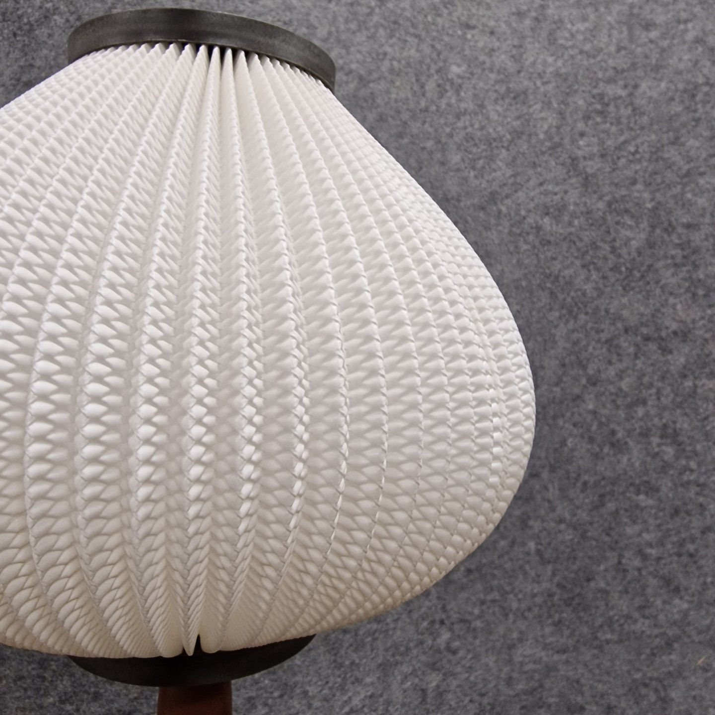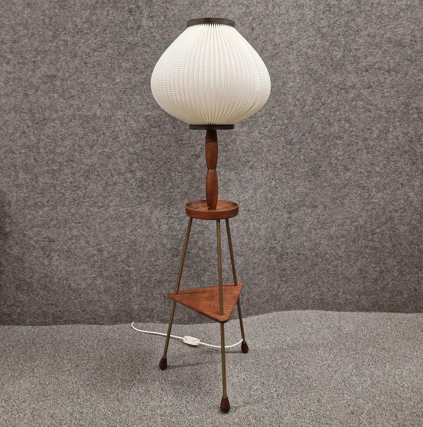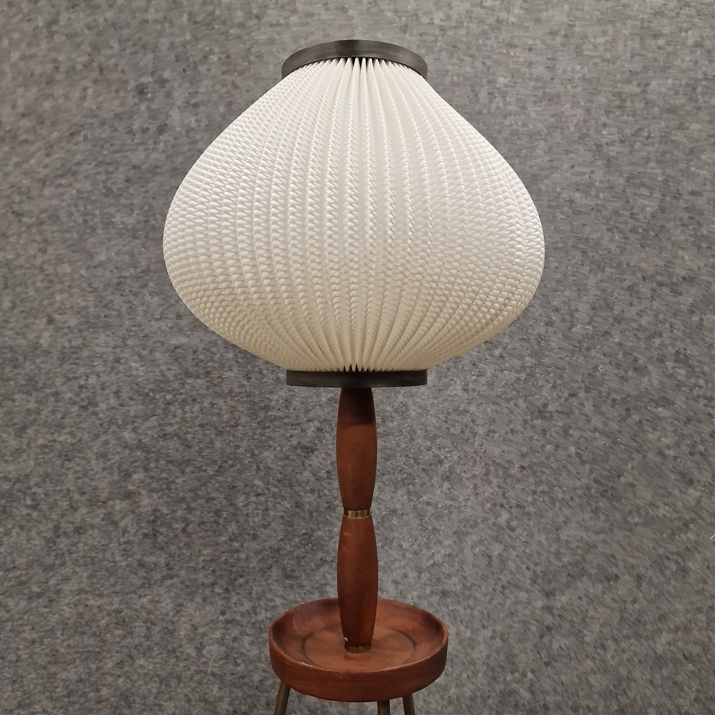 Standerlampe med flotte detaljer og hylde. Plisseret lampeskærm i hvid og med et flettet mønster. Benene er af teaktræ og metal.
