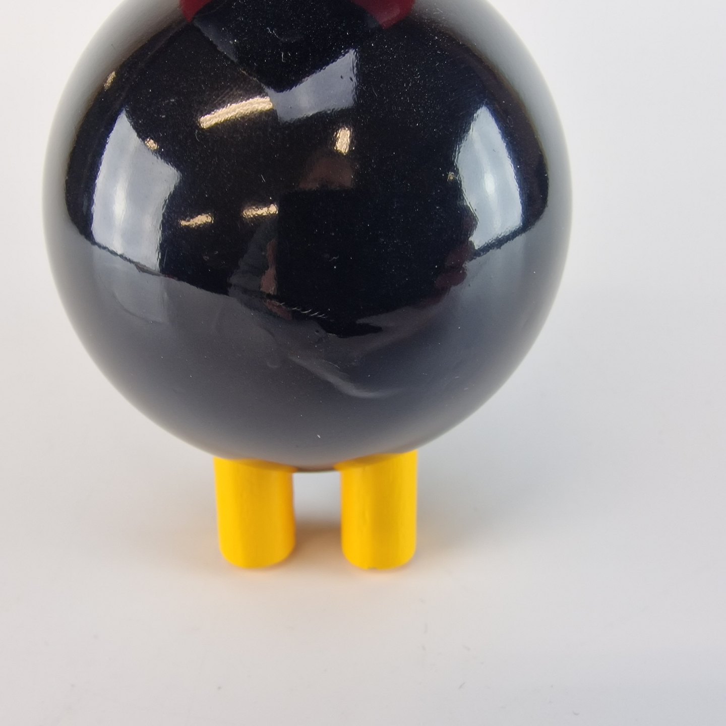Figur af malet bøgetræ fra serien Sangfugl. Peter har sort krop, rødt hoved, sort næb og gule ben.