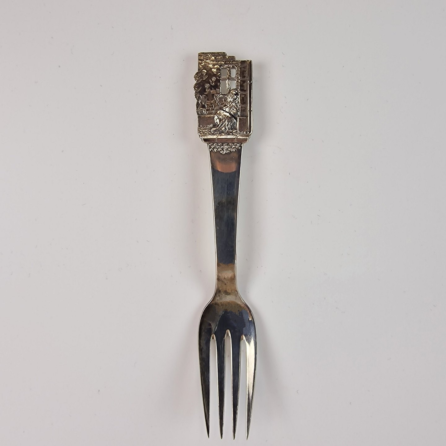 H.C. Andersen barnegaffel i sølv. Med motiv fra eventyret Den lille pige med svovlstikkerne. År 1947
