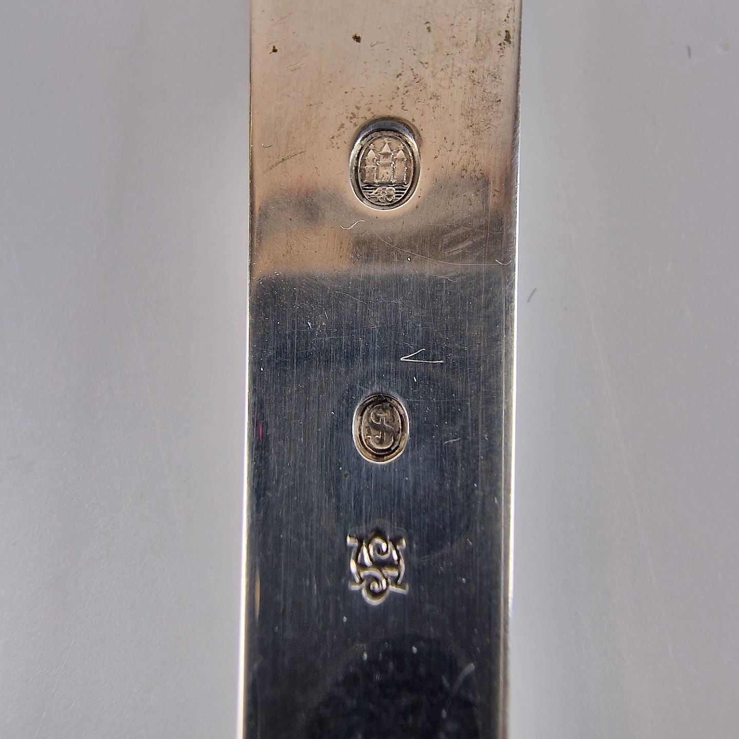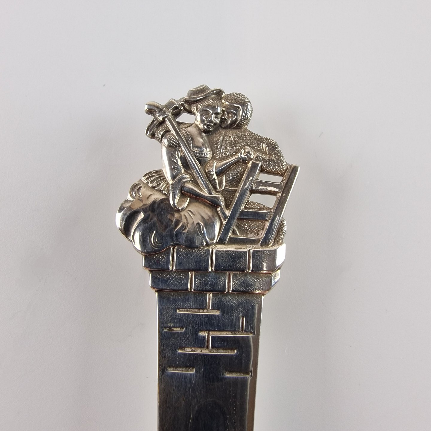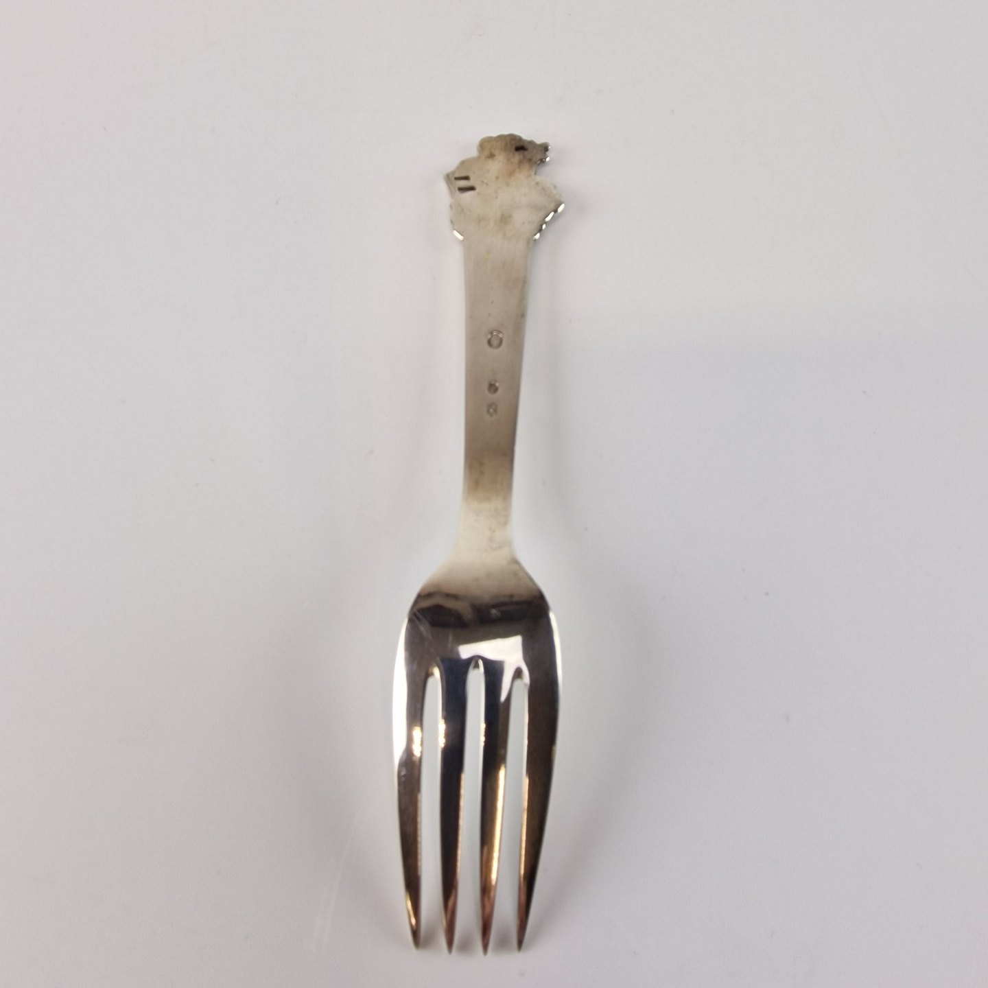 H.C. Andersen barnegaffel i sølv. Med motiv fra eventyret Hyrdinden og skorstensfejeren. År 1946
