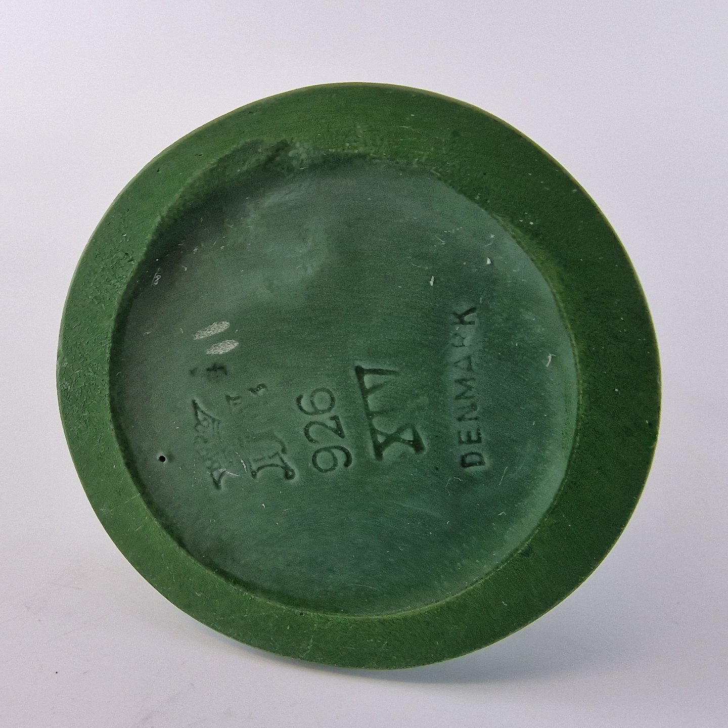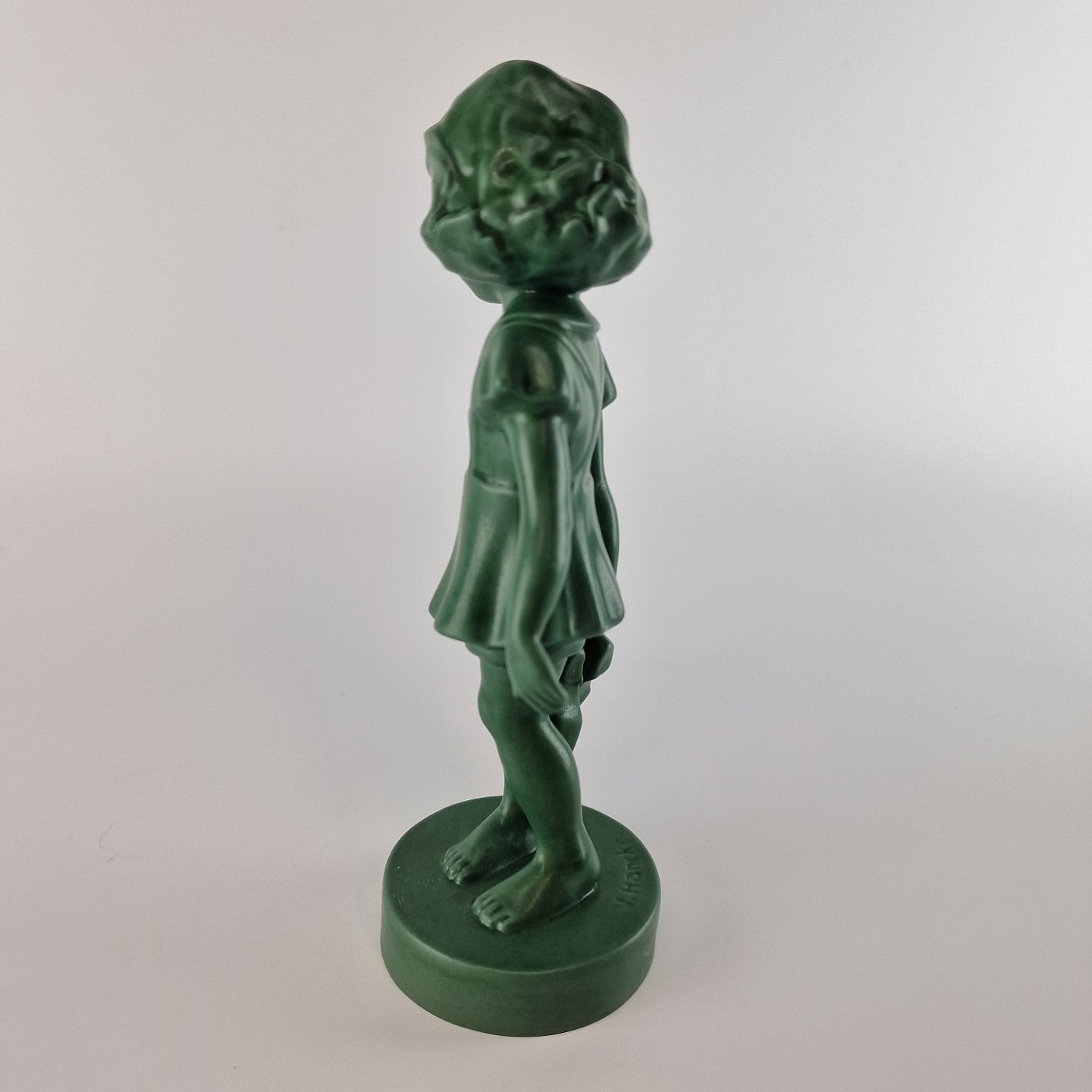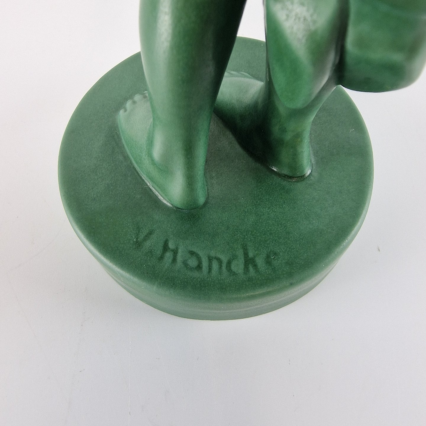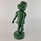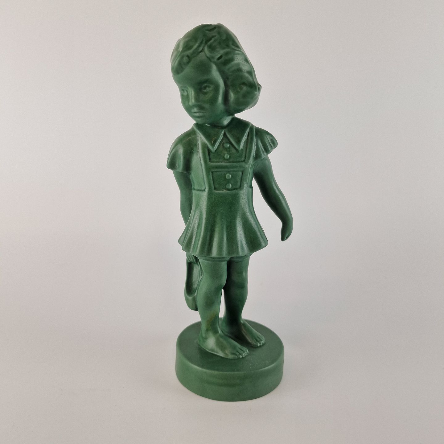 Grøn glaseret keramik figur af pige med sko i hånden. No 926