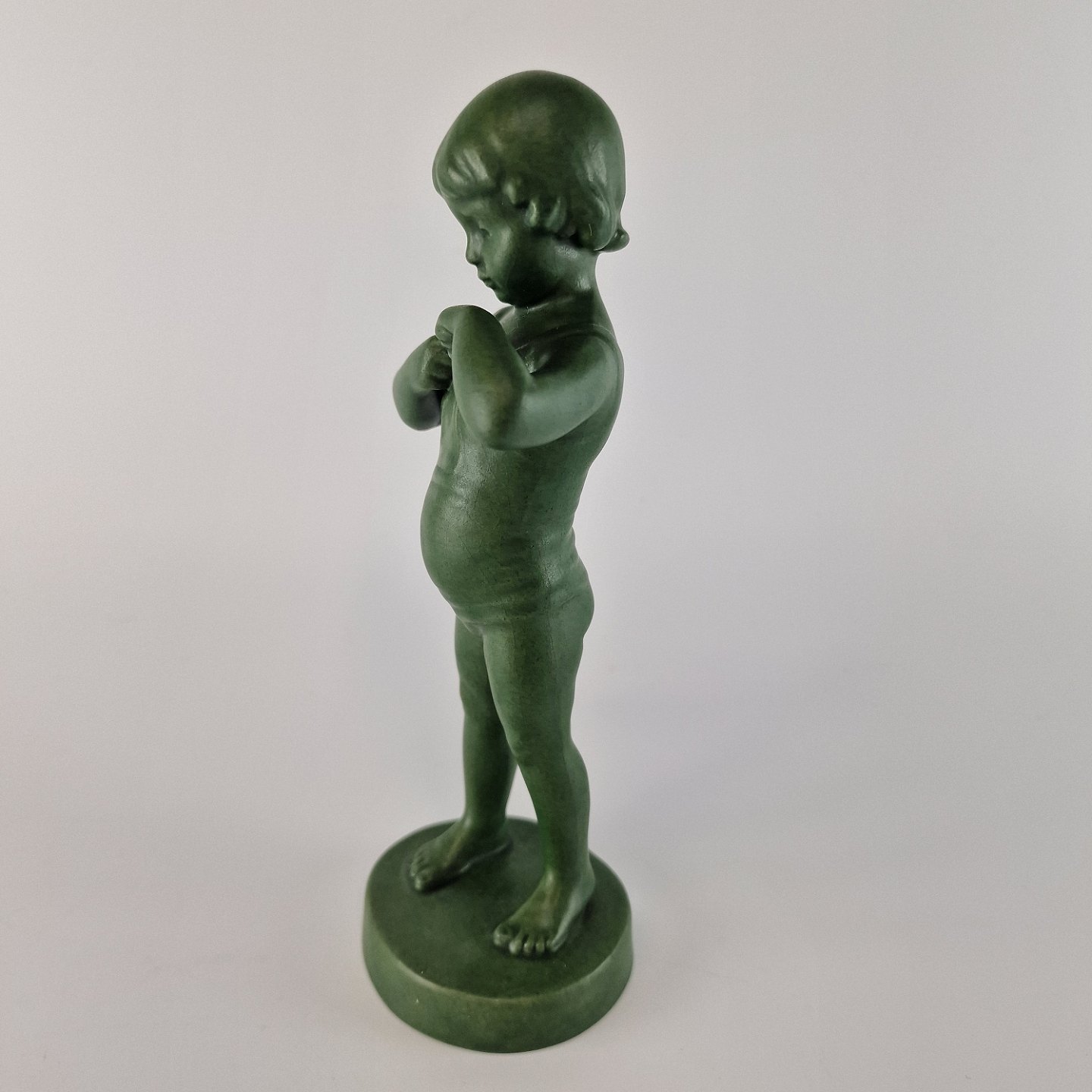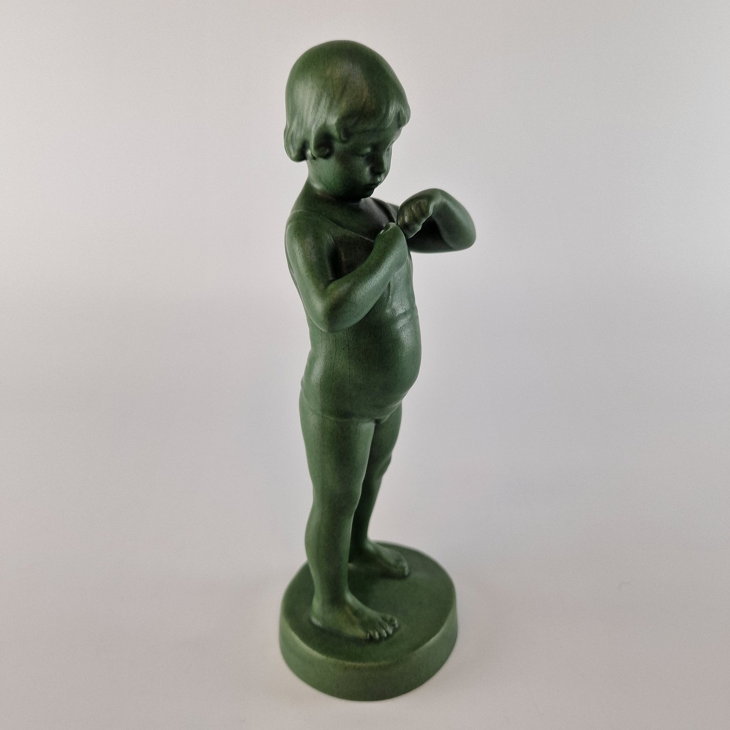Grøn glaseret keramik figur af pige, som binder sin skjorte. No 893