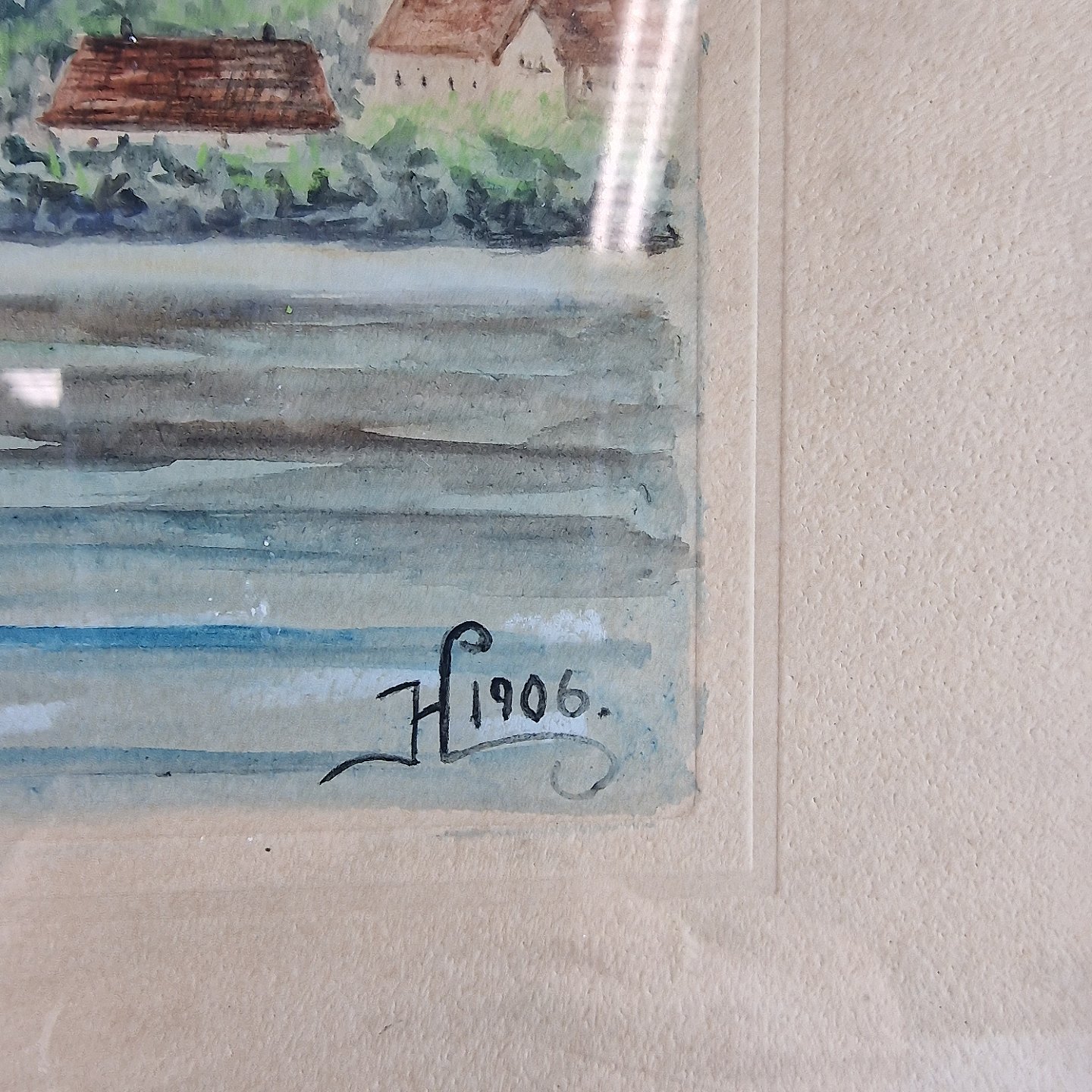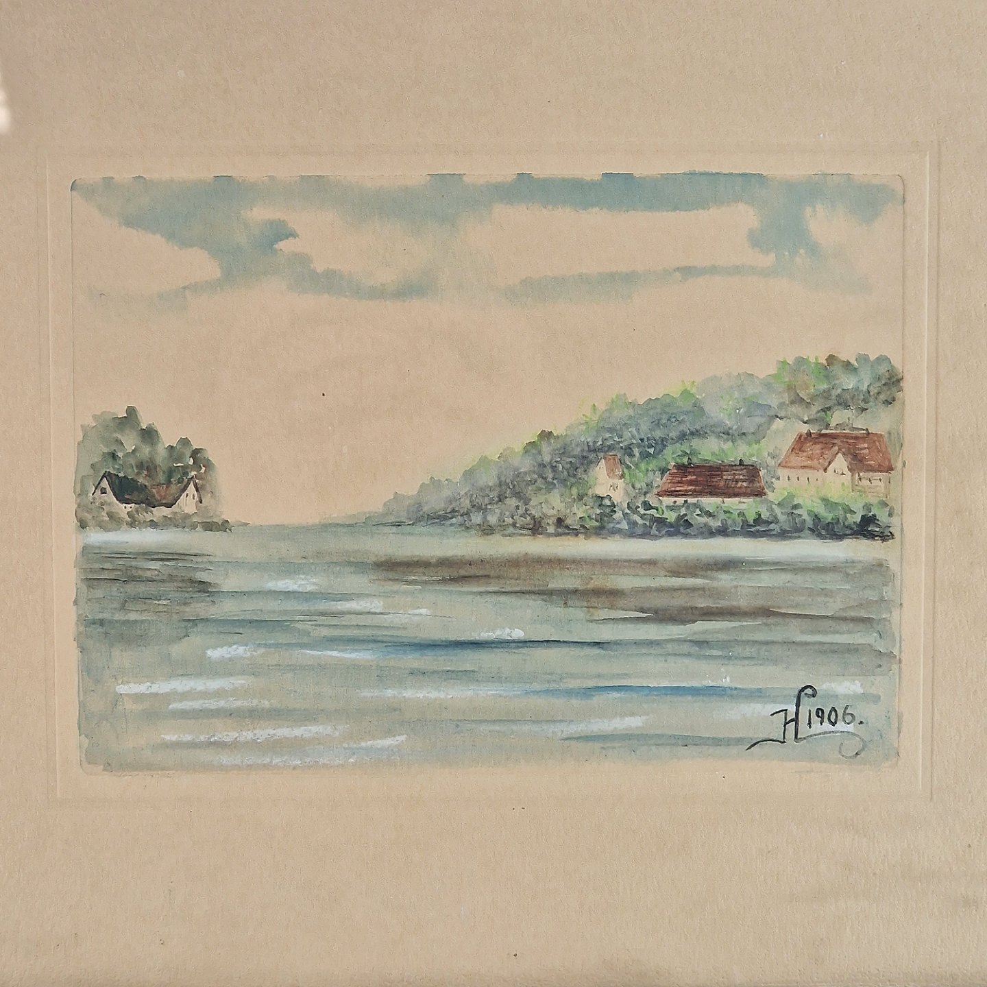 Landskabsmaleri i akvarelmaling med motiv af huse ved søbredning fra år 1906. Indrammet akvarelmaleri på struktureret papir.