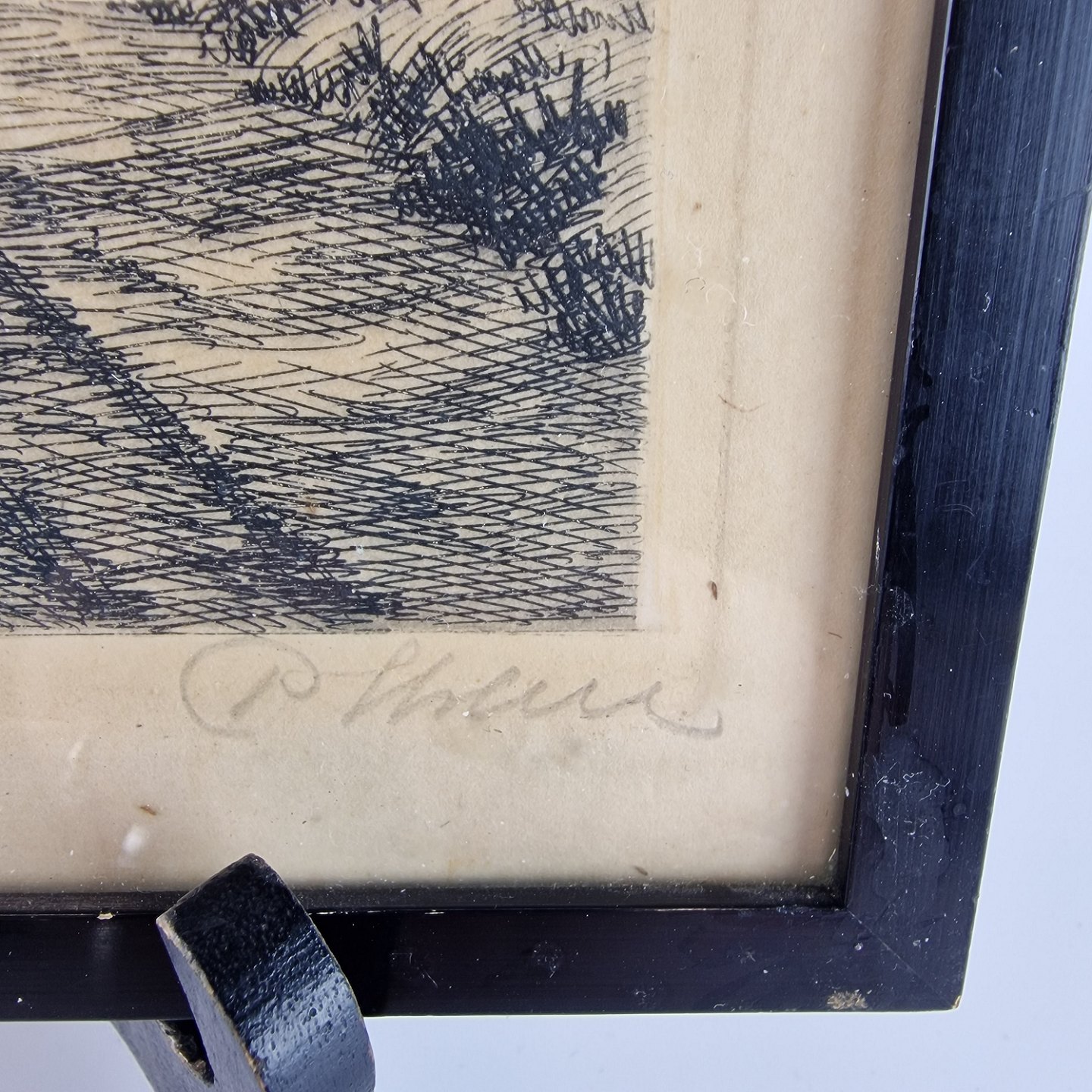 Original radering i sort og hvid med landskabmotiv. Landevej med to hjulspor omgivet af træer og en gård i det fjerne