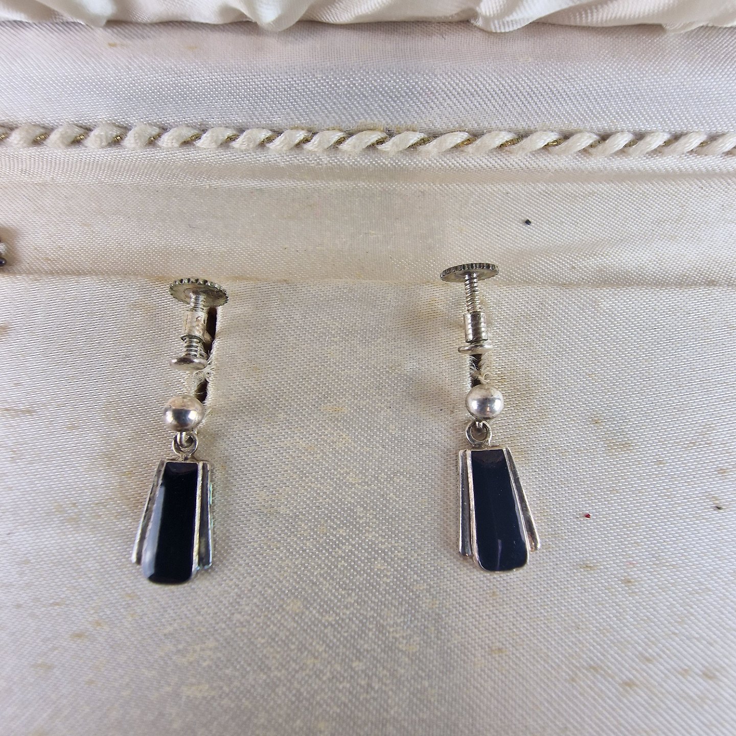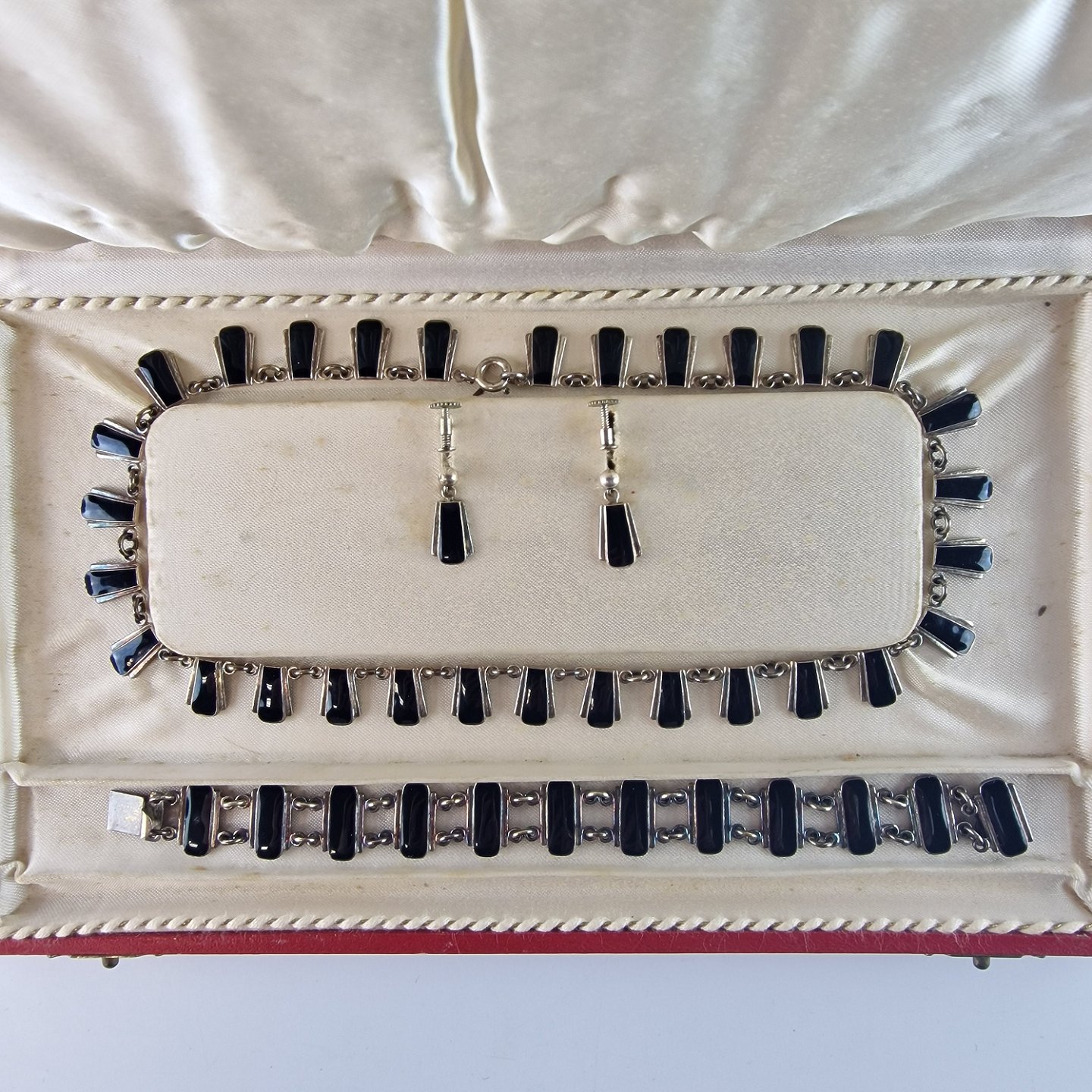 Halskæde, armbånd og ørenringe af sterling sølv, i Art Deco stil fra midten af ​​det 20. århundrede. Halvstiv collier med sorte emaljerede skiver. Lås i form af en karabinhage. Halvstift armbånd også med sorte emaljerede skiver. Øreringe med skruelås og hver med en sort emaljeret skive. Original æske foret med satin medfølger.