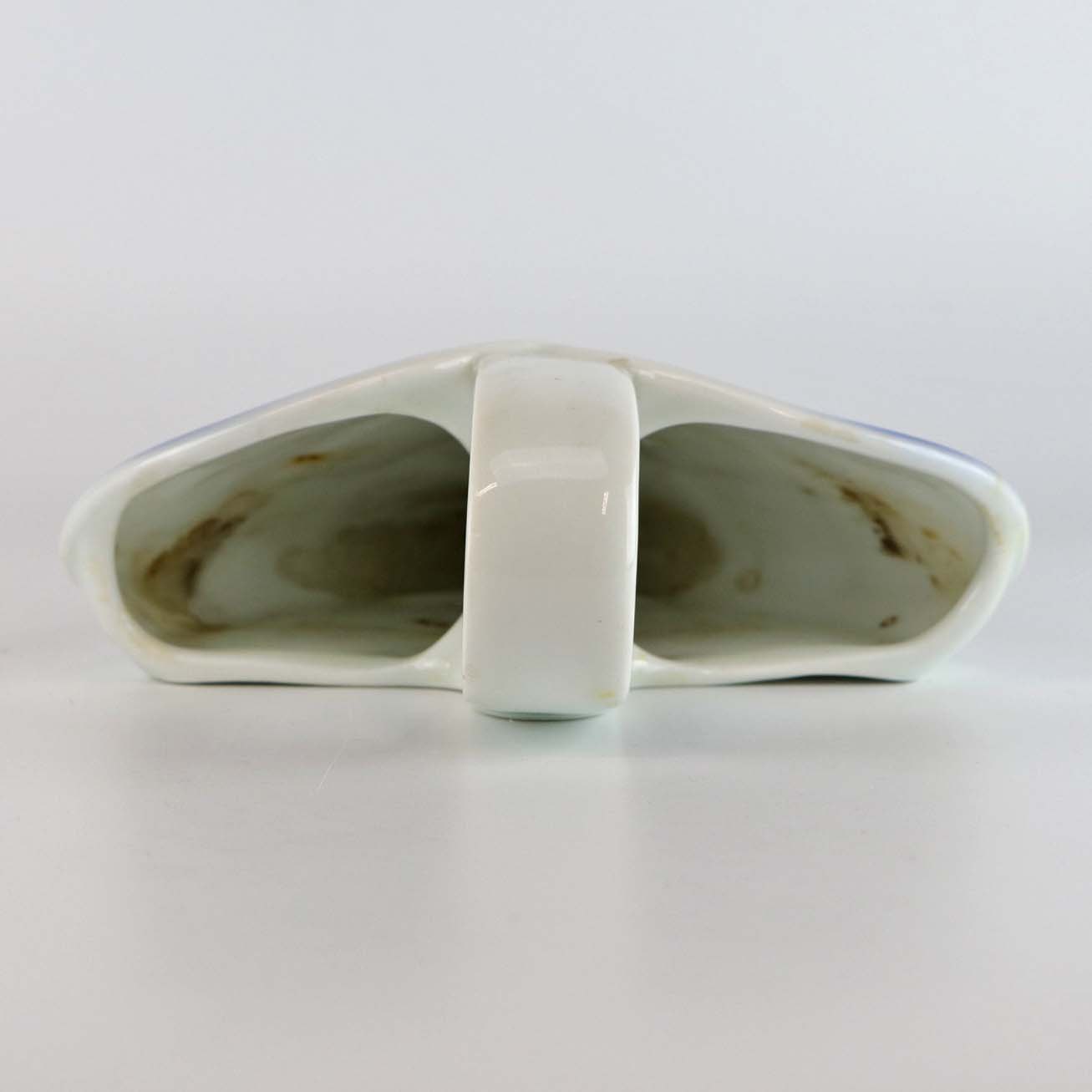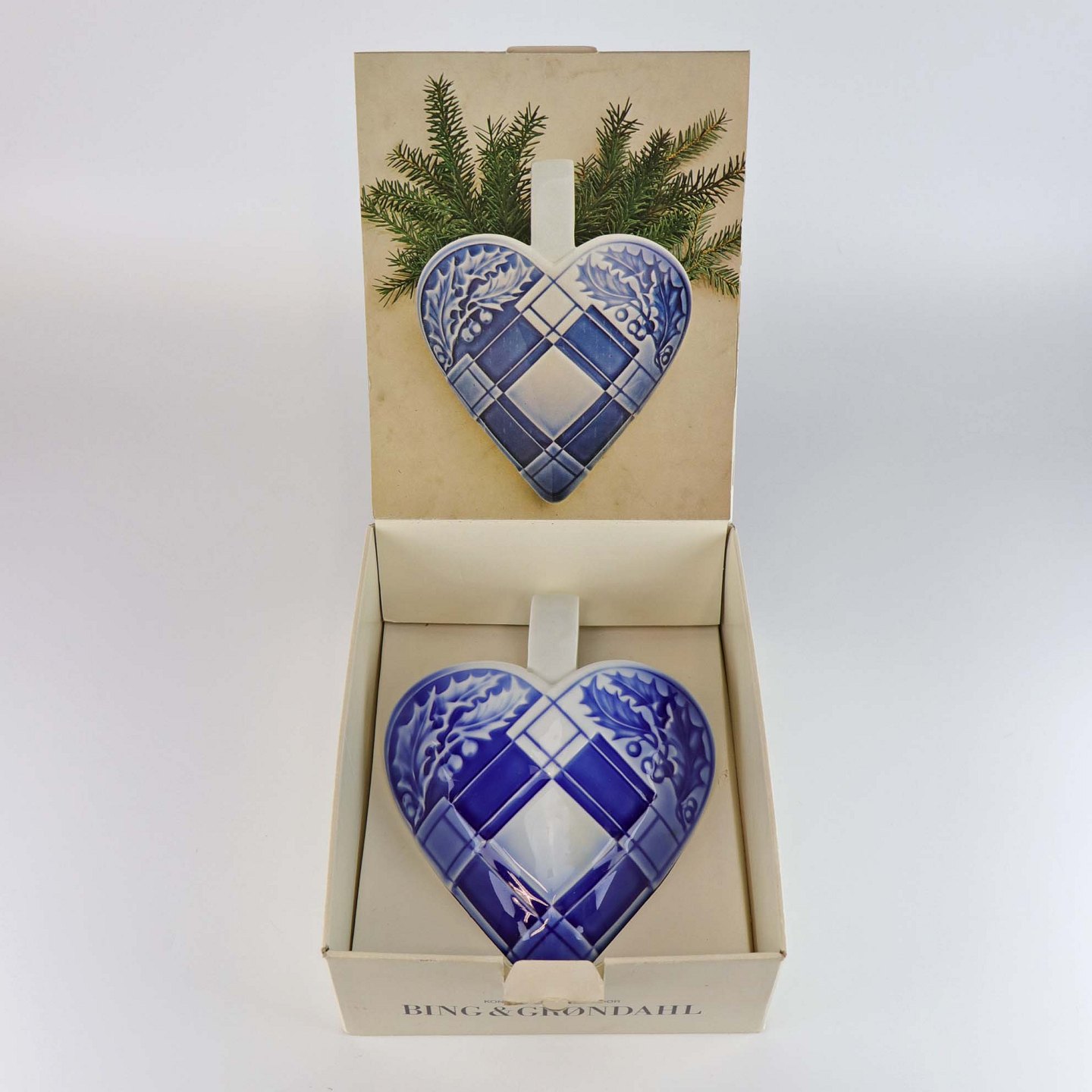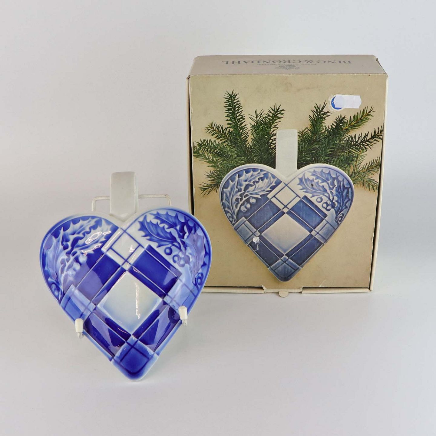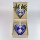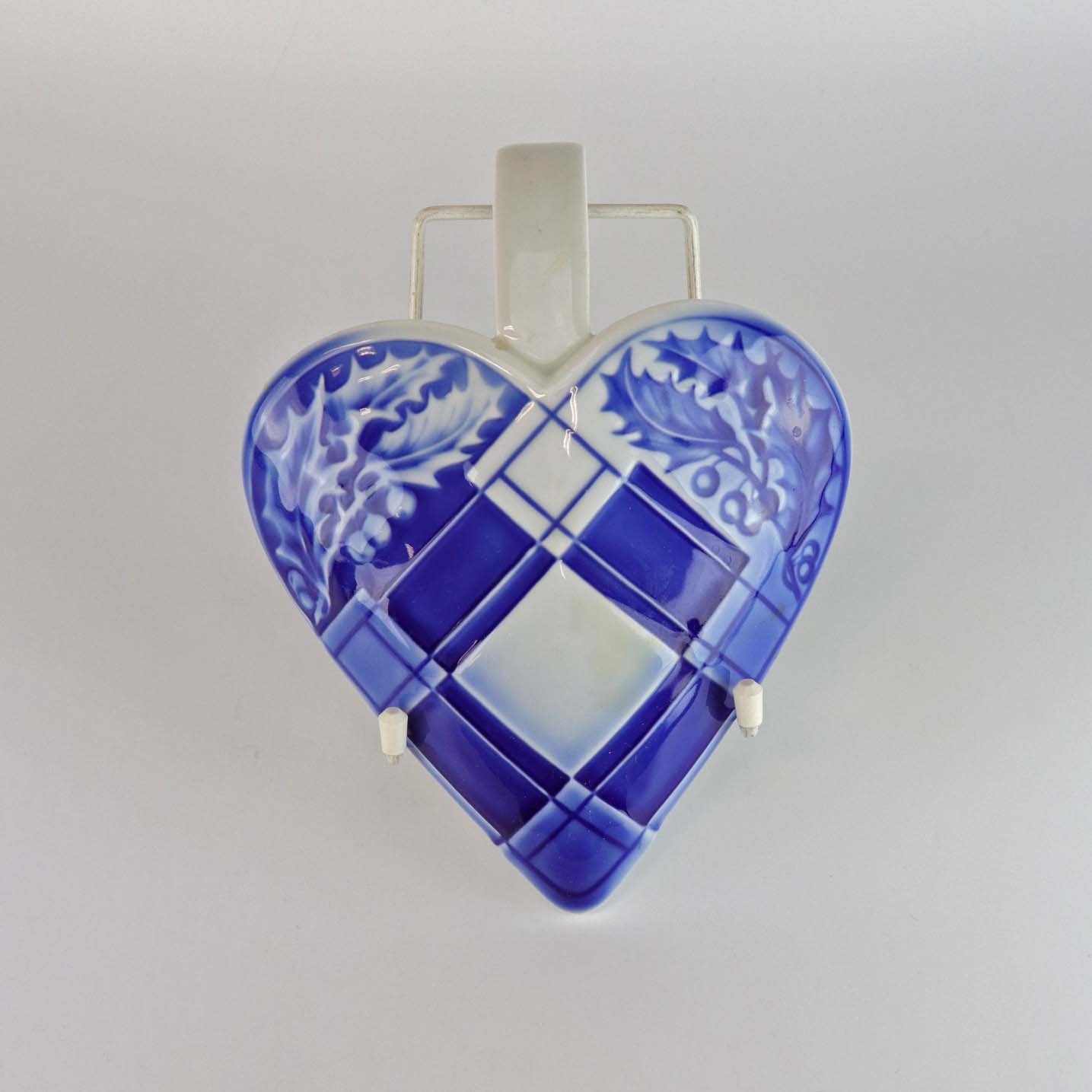 Hjerteophæng i porcelæn i blå og hvide farver. Dekoreret med kristtjørn og felter så det ligner hjertet er flettet. No 9205