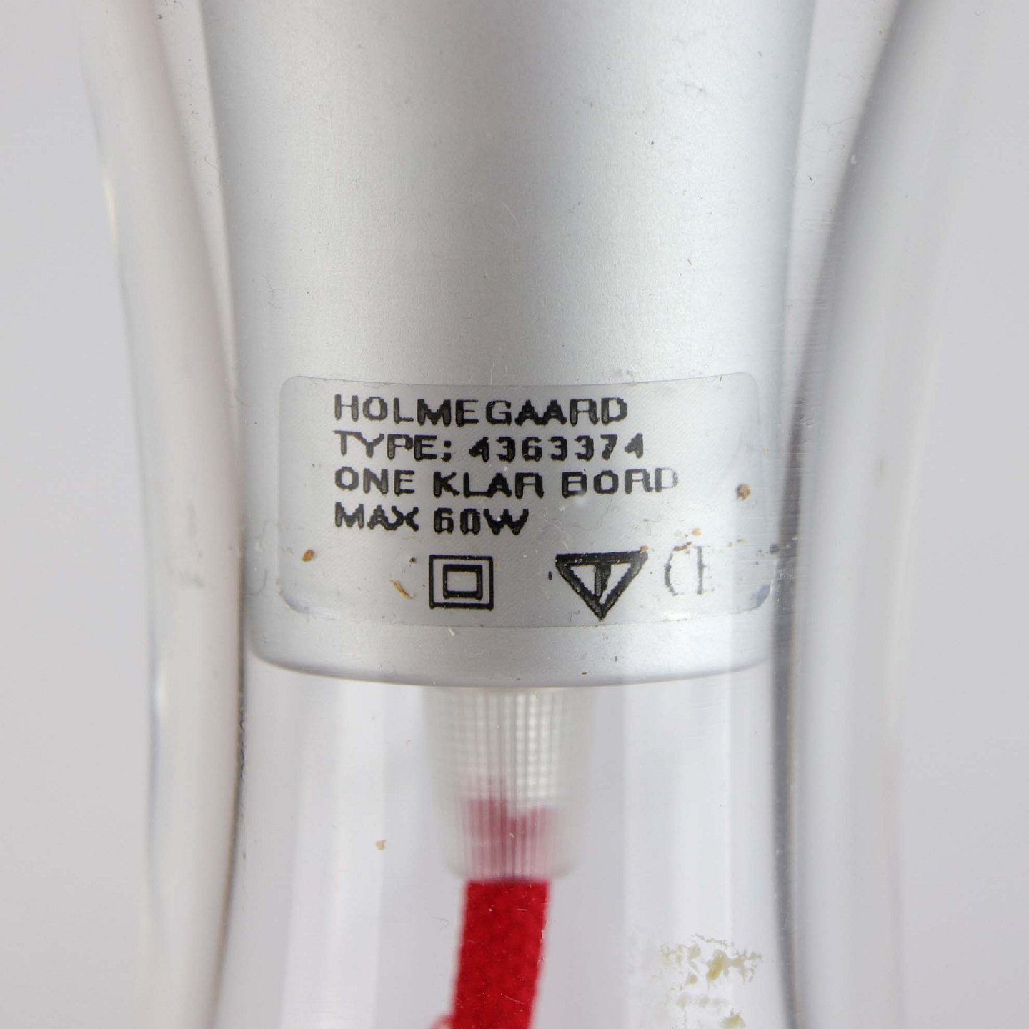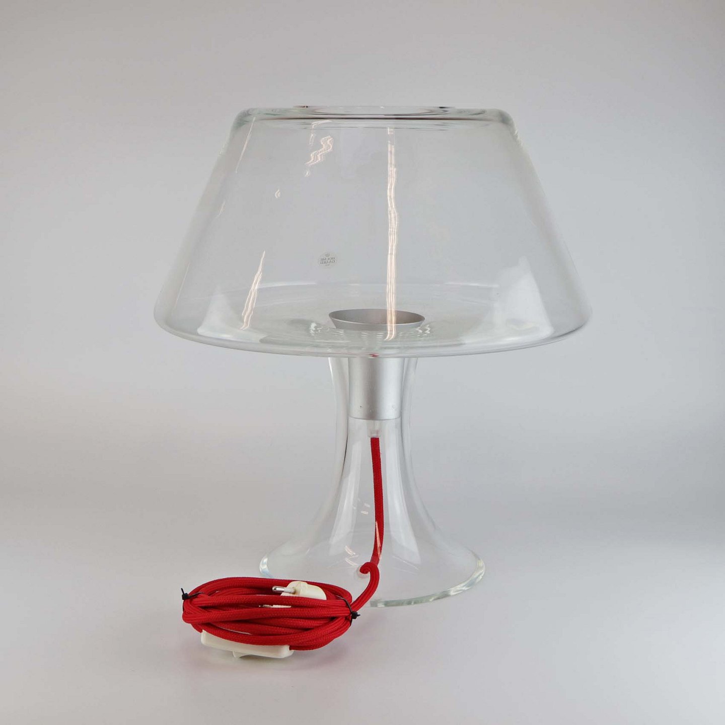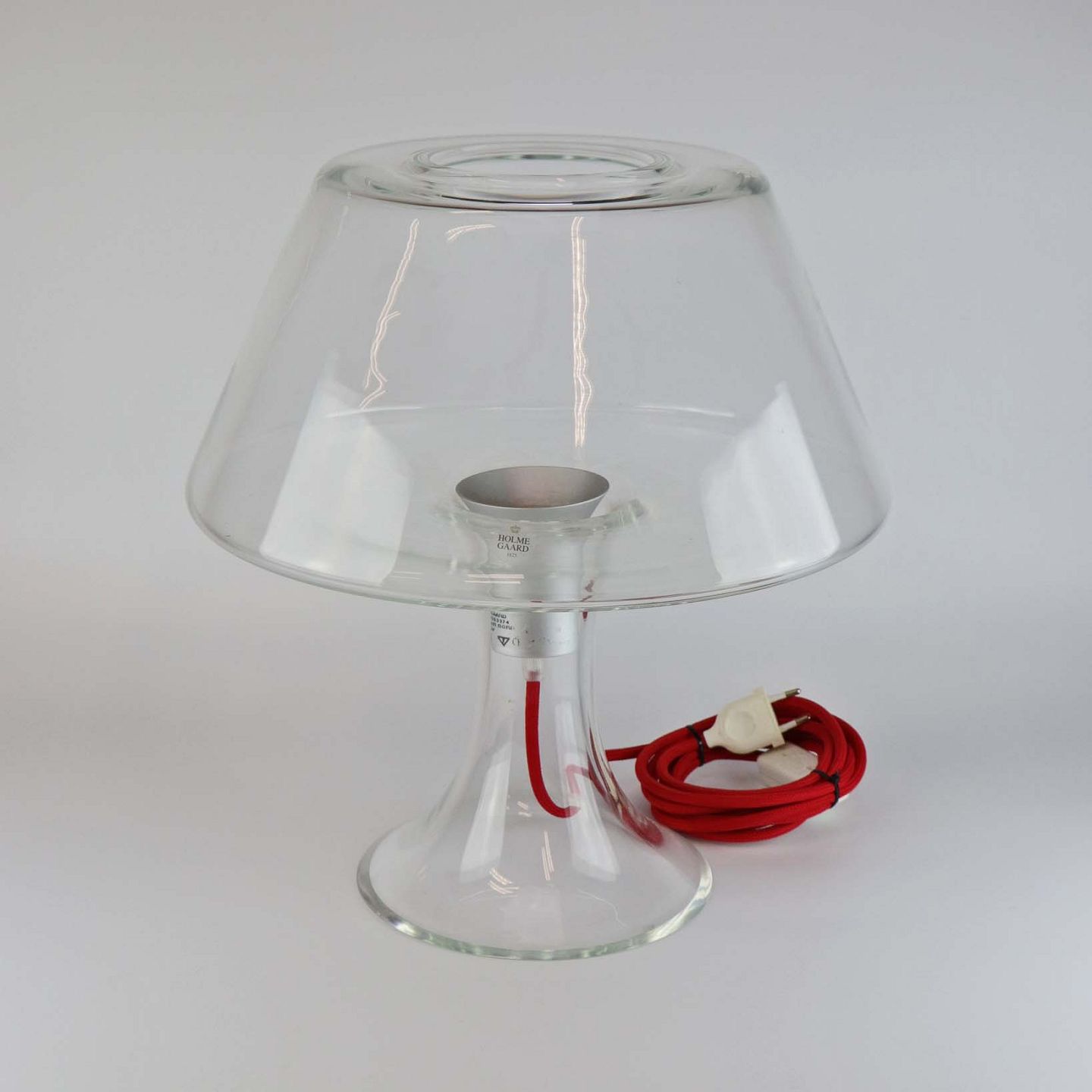 Bordlampe i mundblæst klart glas med rød stofledning. Størrelse Stor