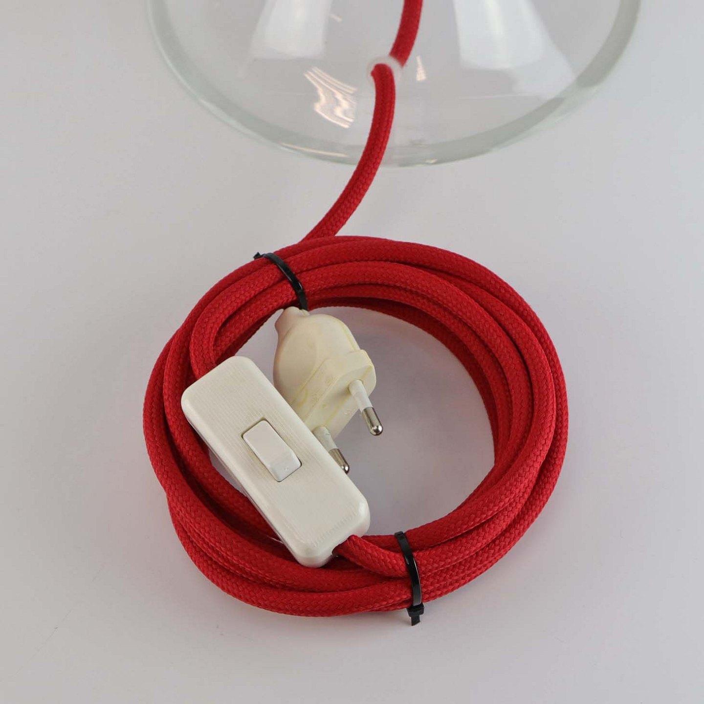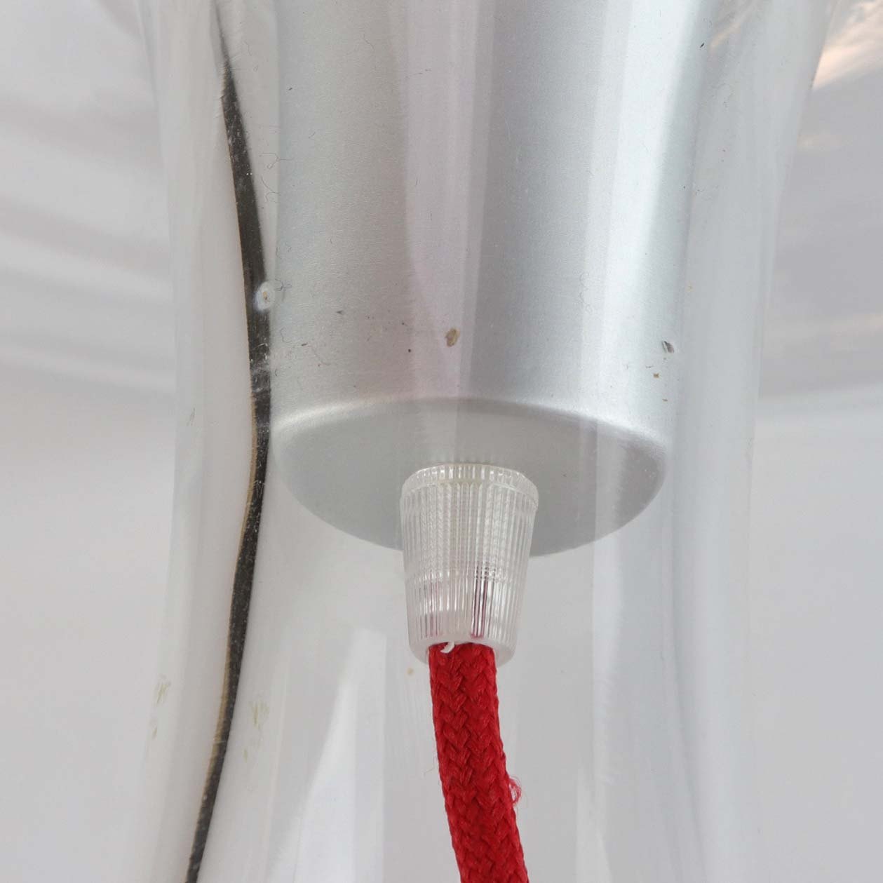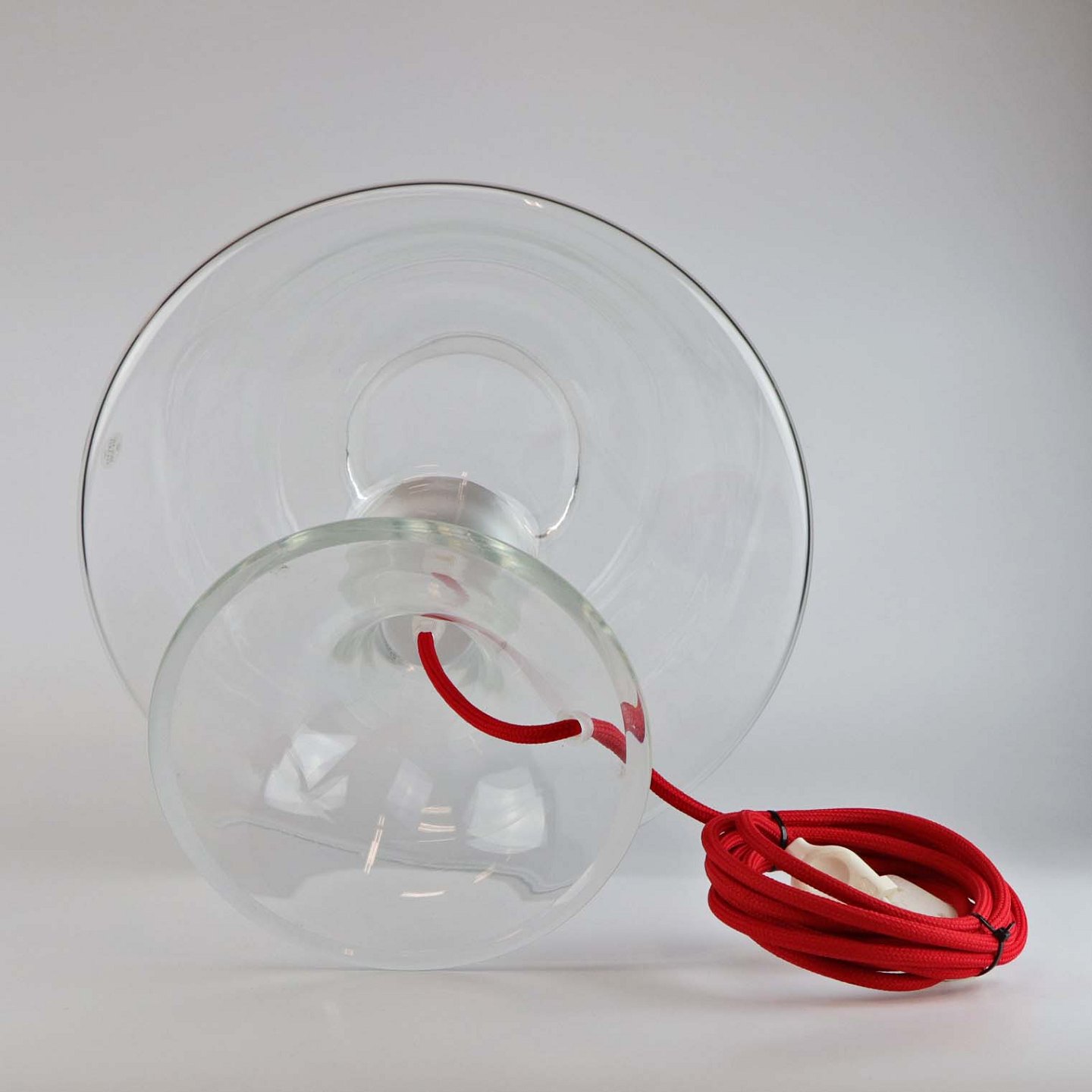 Bordlampe i mundblæst klart glas med rød stofledning. Størrelse Stor