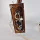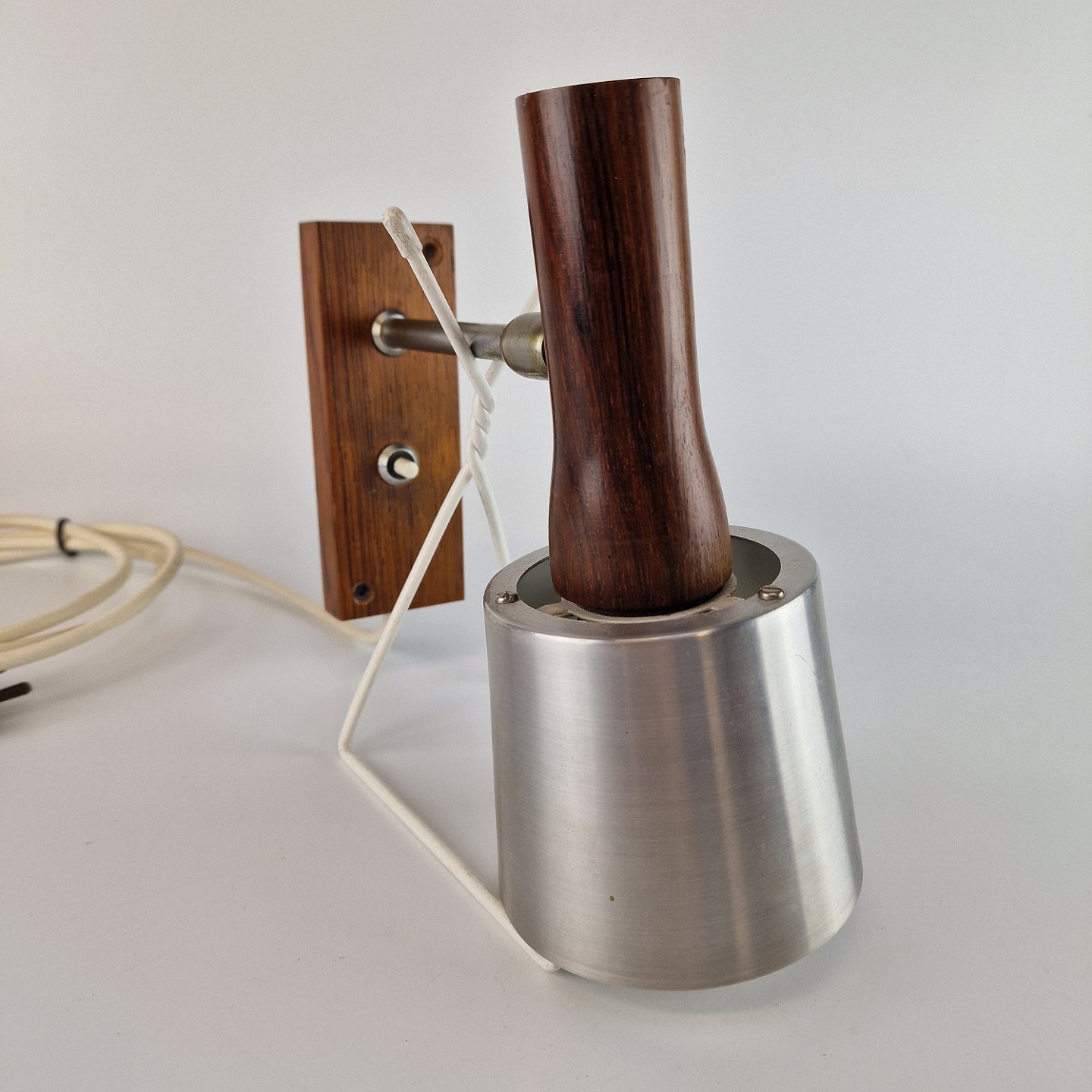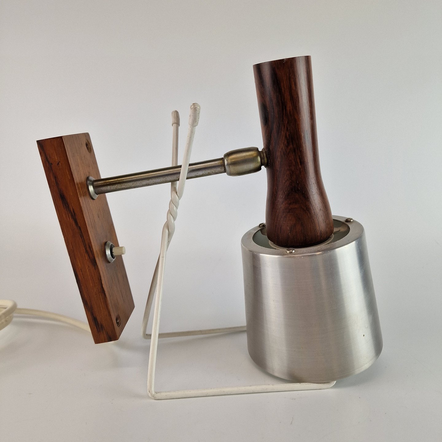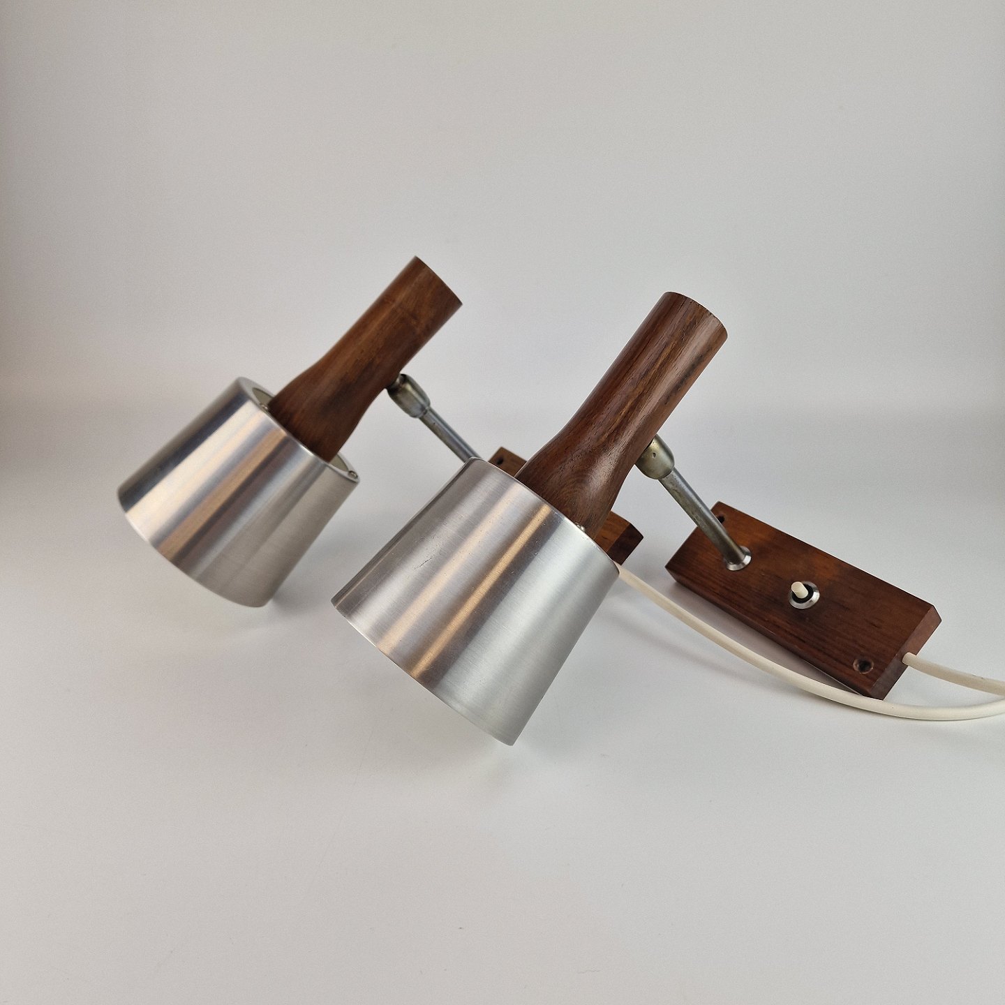 To væglamper med holder af palisander og skærm af aluminium. Kontakten er en trykknap. Prisen er for 2 styk