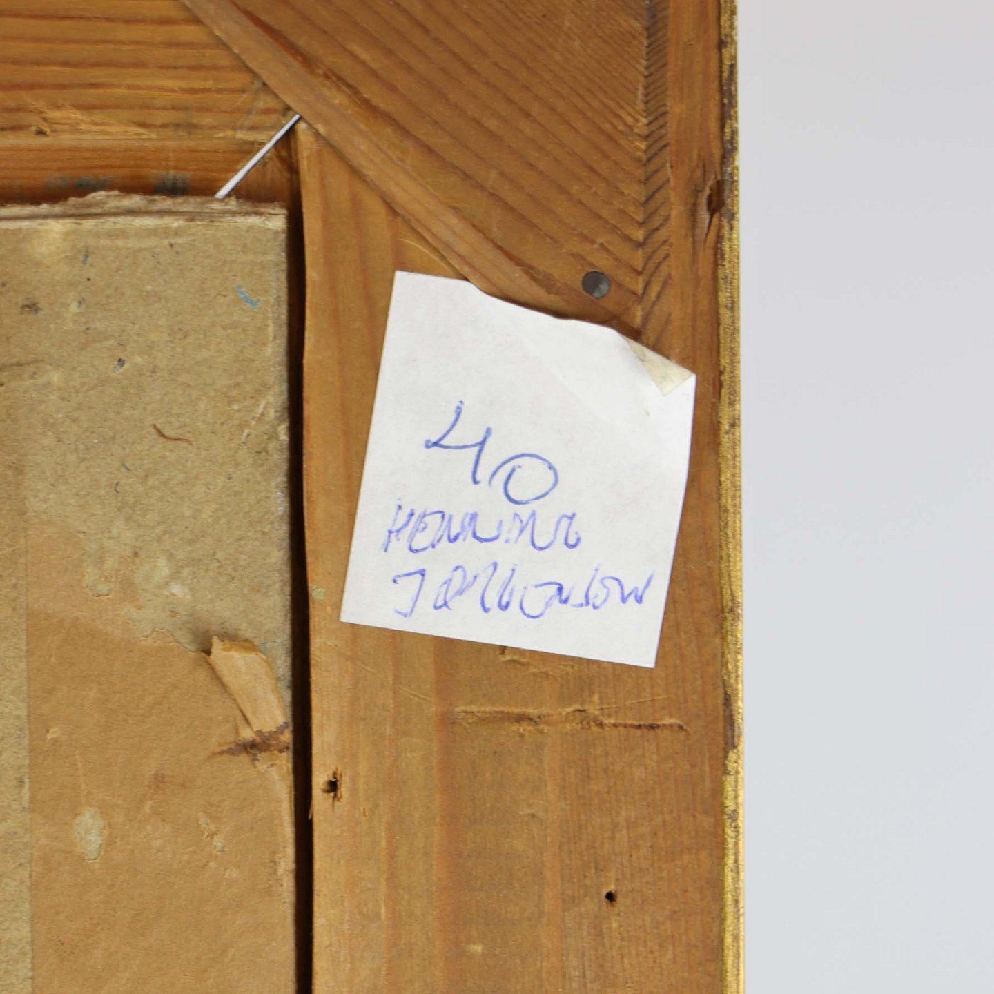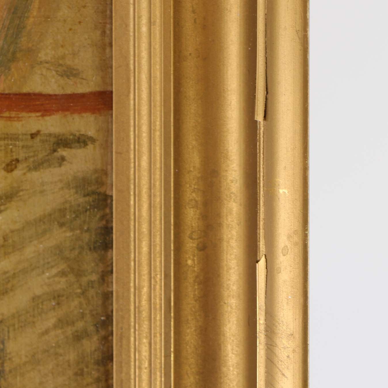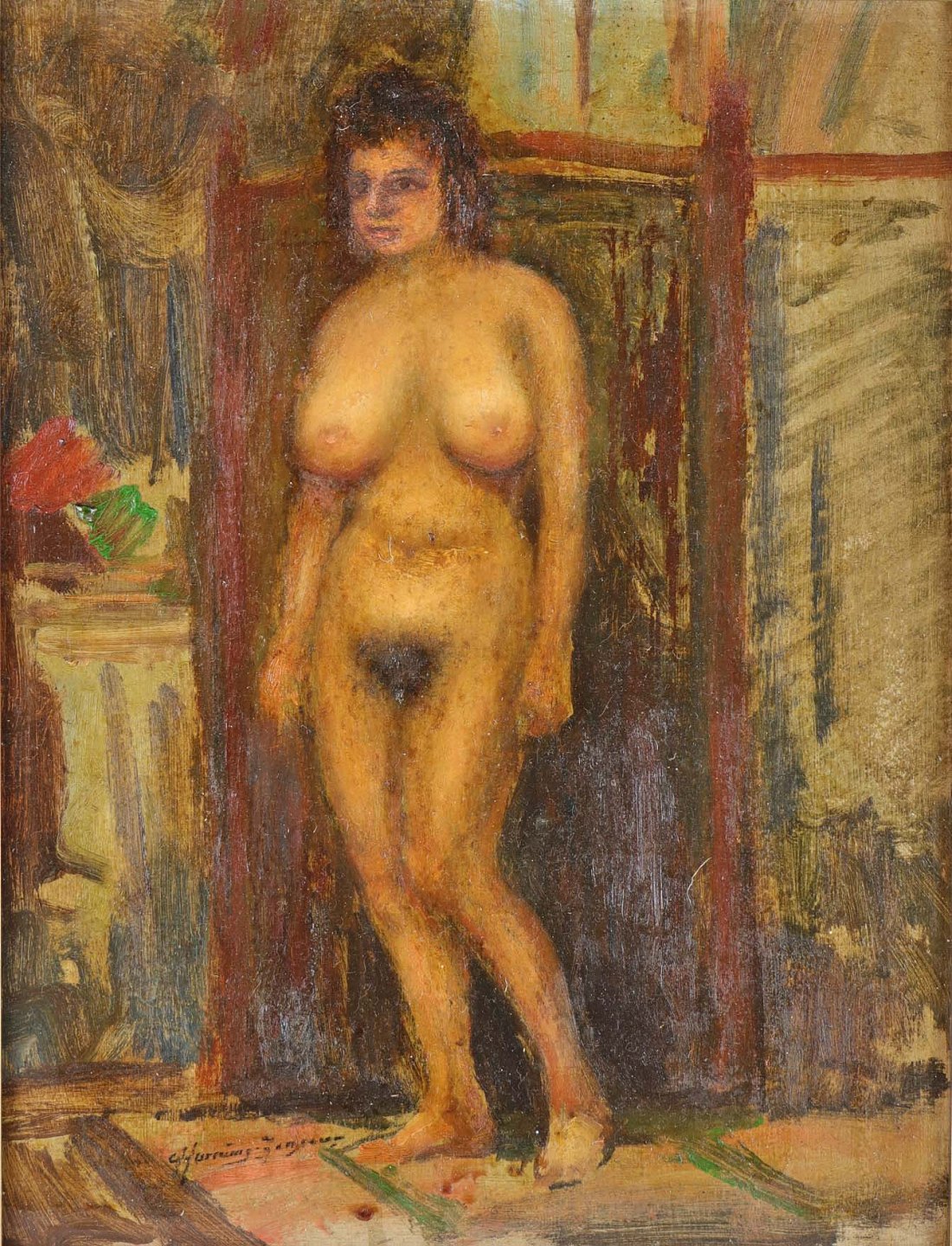 Indrammet oliemaleri på plade. Portrætmaleri af stående nøgen kvinde.