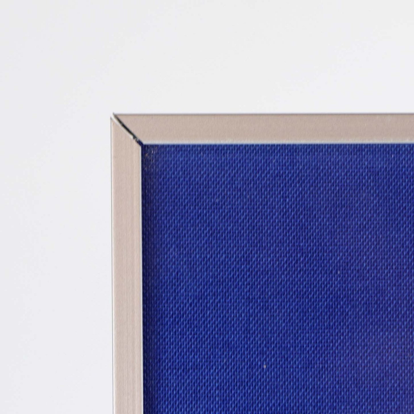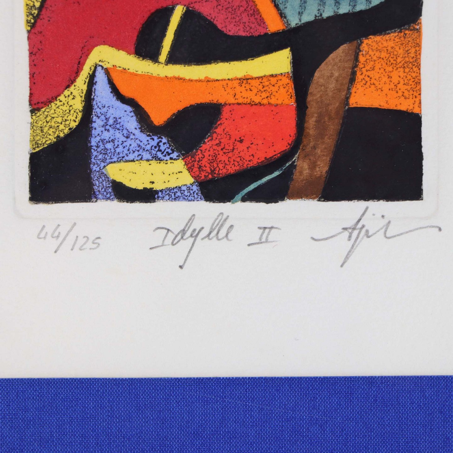 Glasindrammet abstrakt litografisk tryk på struktureret papir monteret på blå stofbaggrund. Navngivet Idylle II. Nr. 44/125