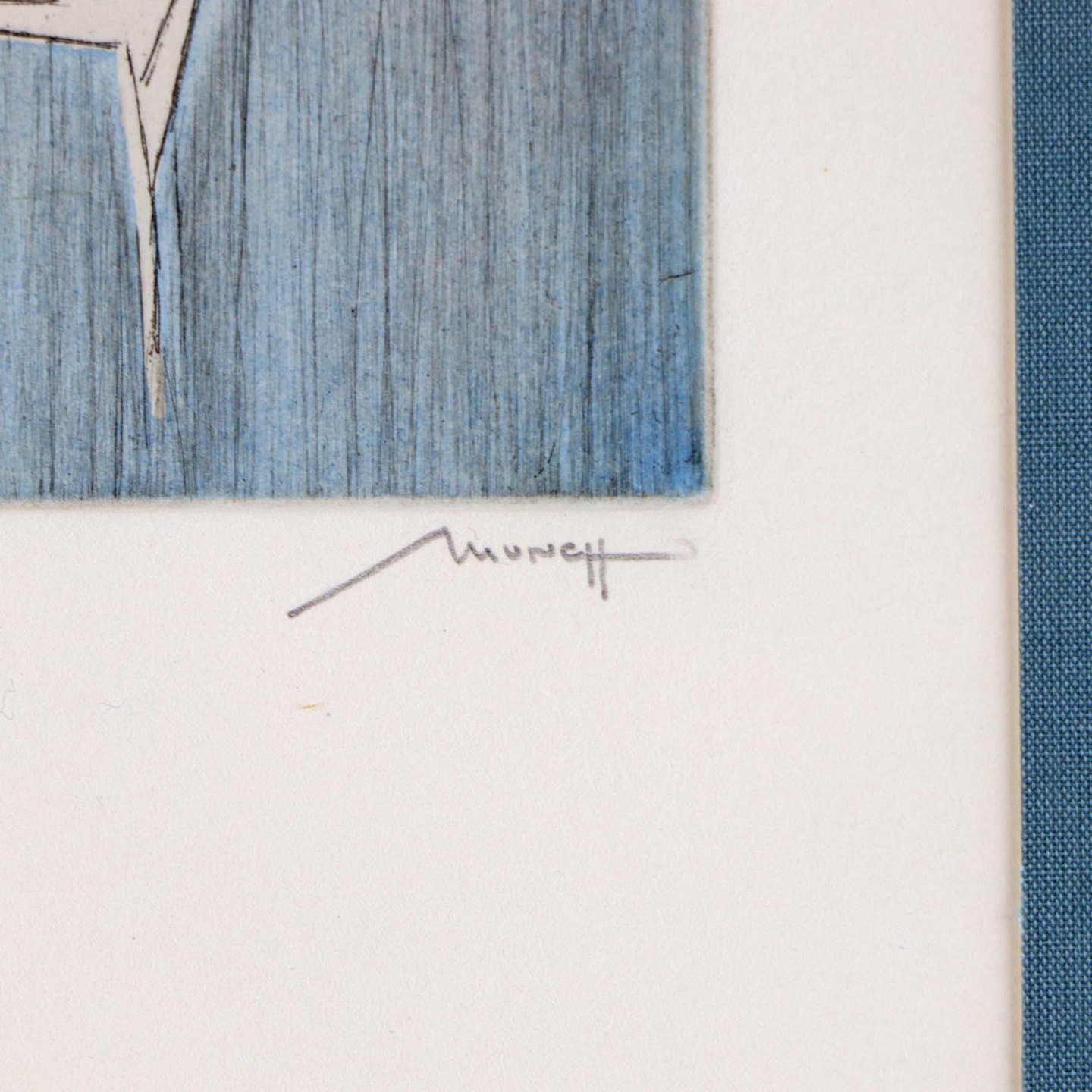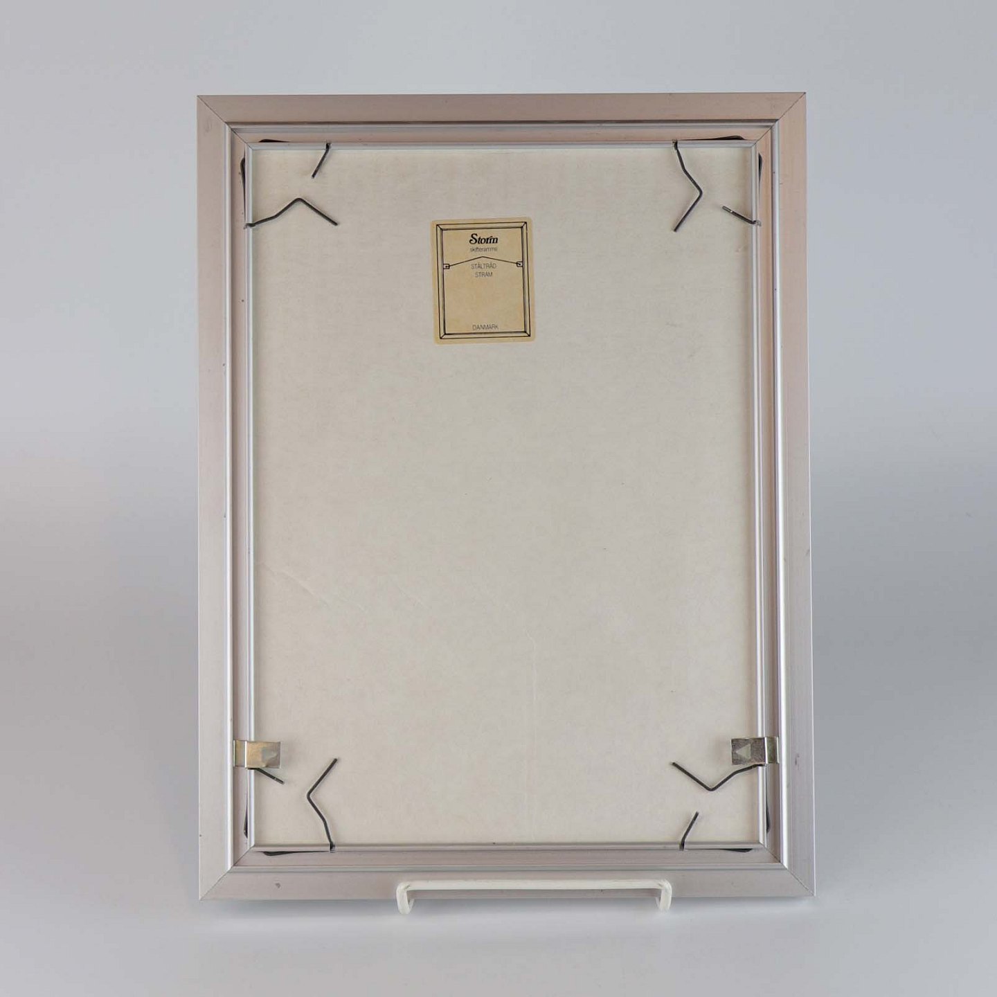 Glasindrammet abstrakt litografisk tryk på struktureret papir monteret på grå stofbaggrund. No 87/90