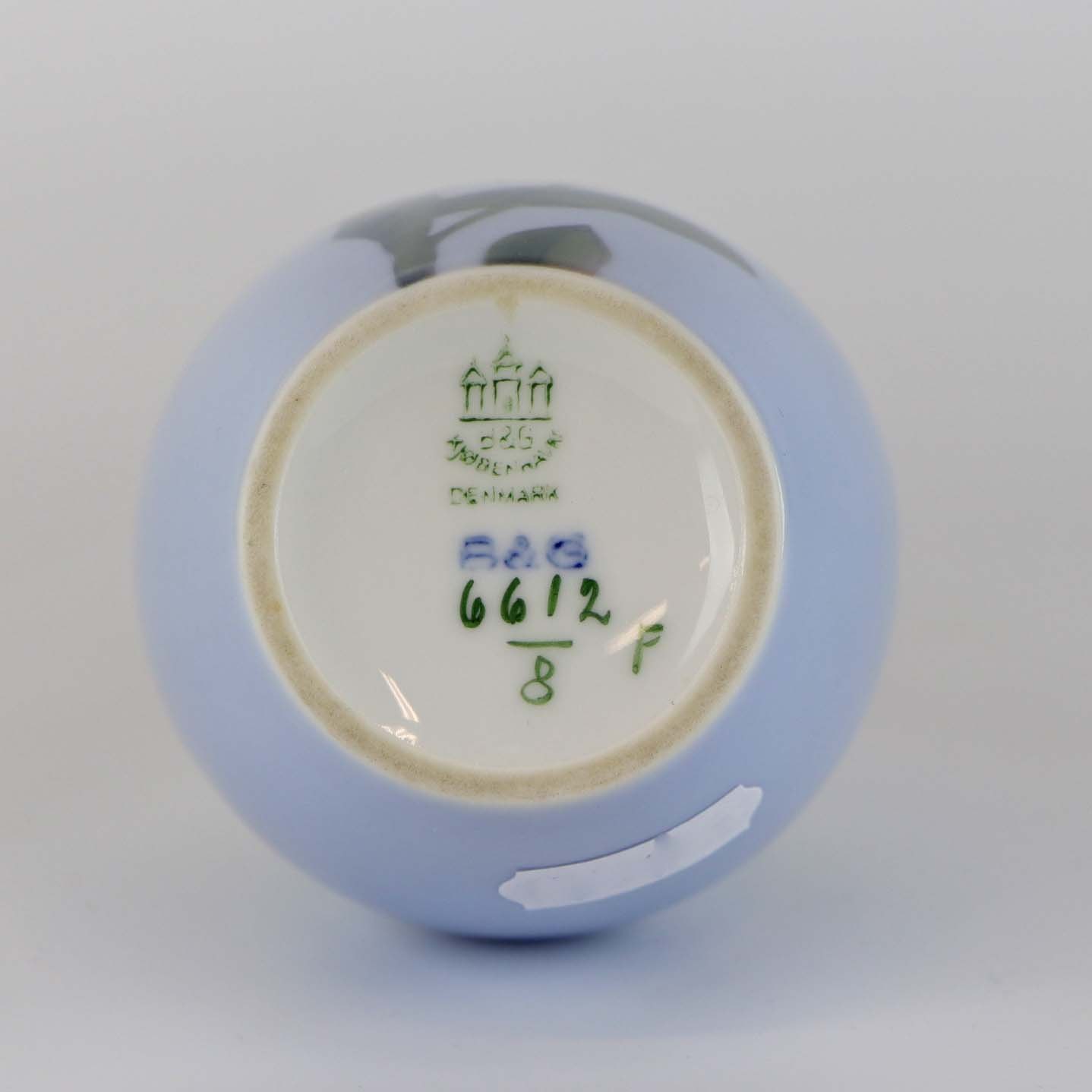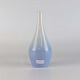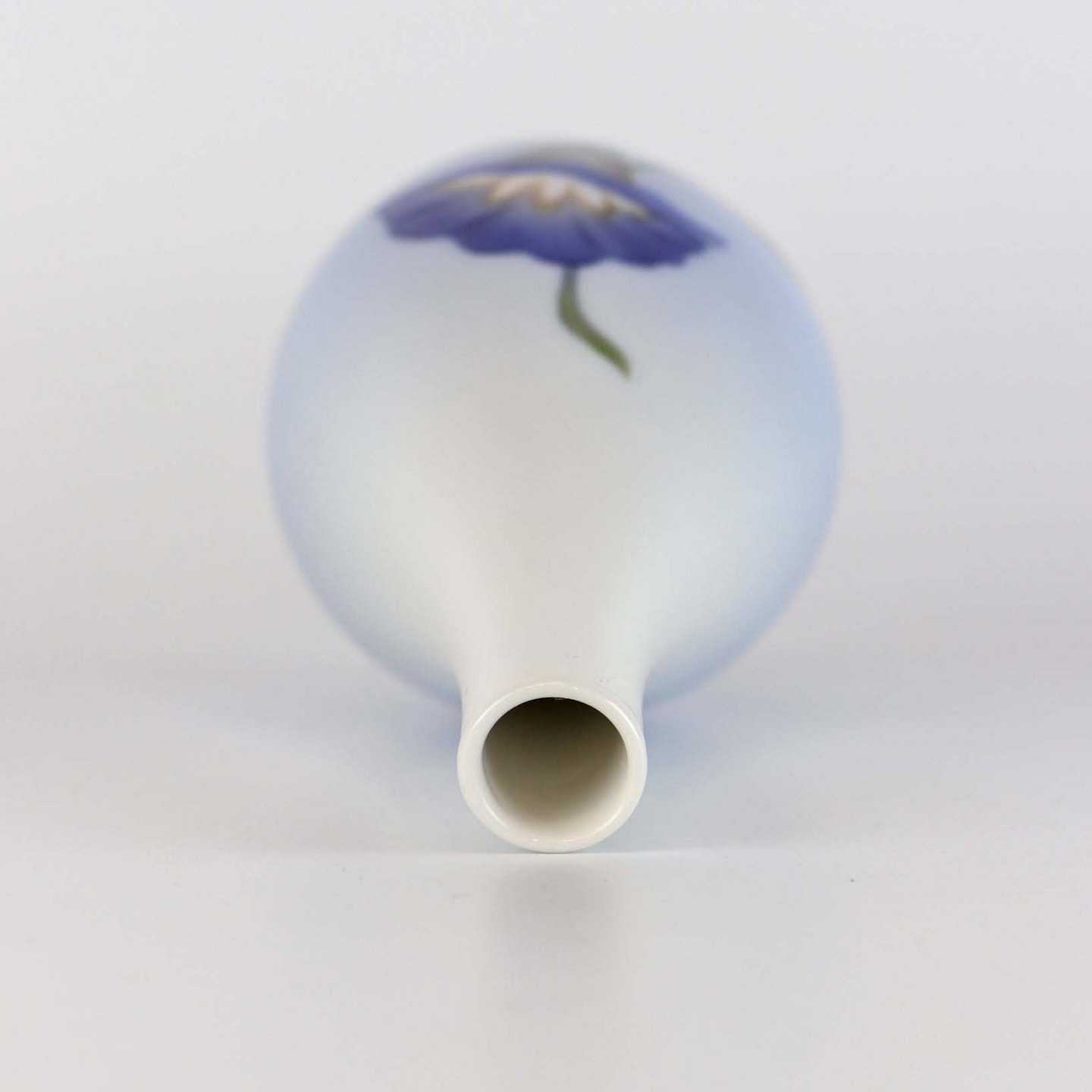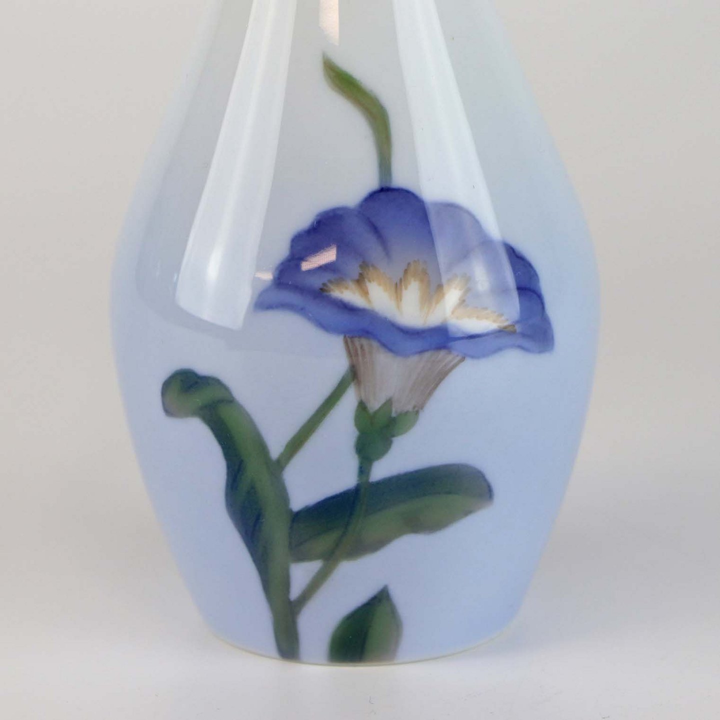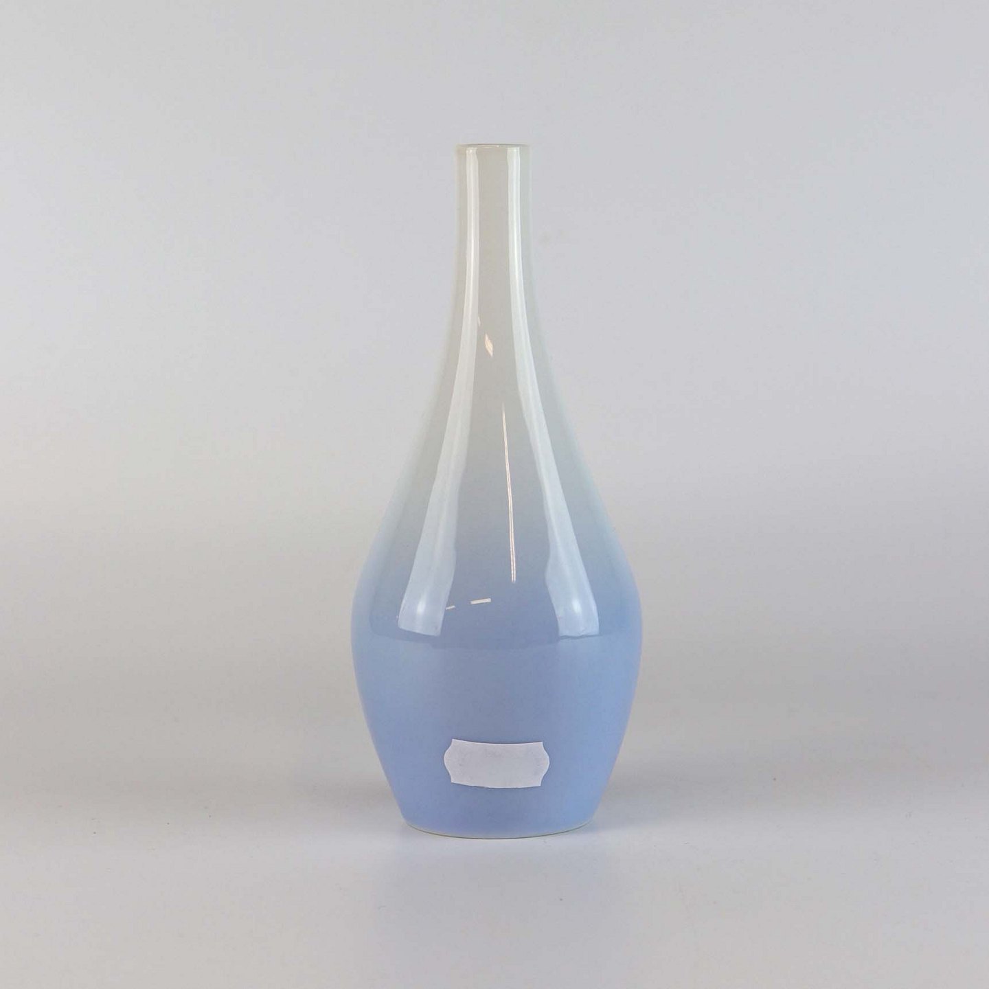Vase med slank hals i glat porcelæn i gradueret blå nuance med motiv af blå og hvid trompetblomst. Nr 6612/8