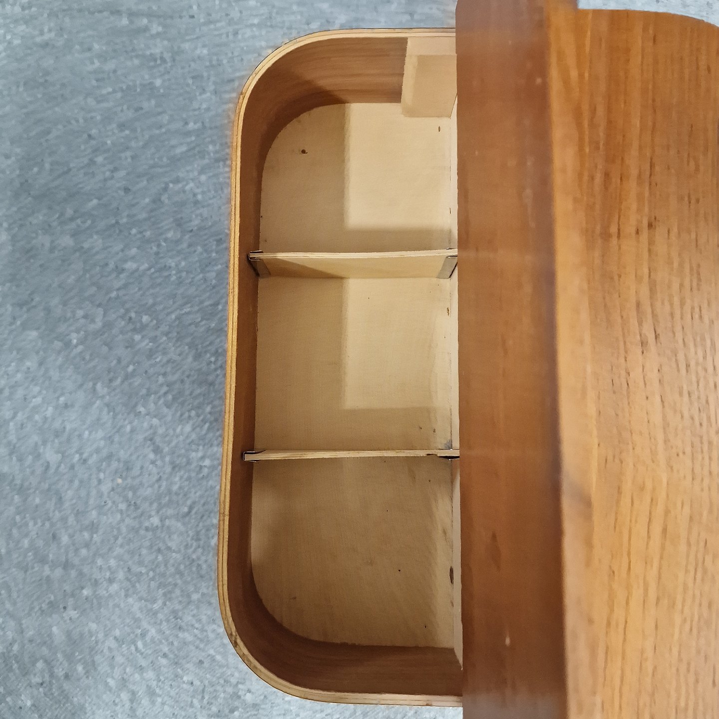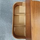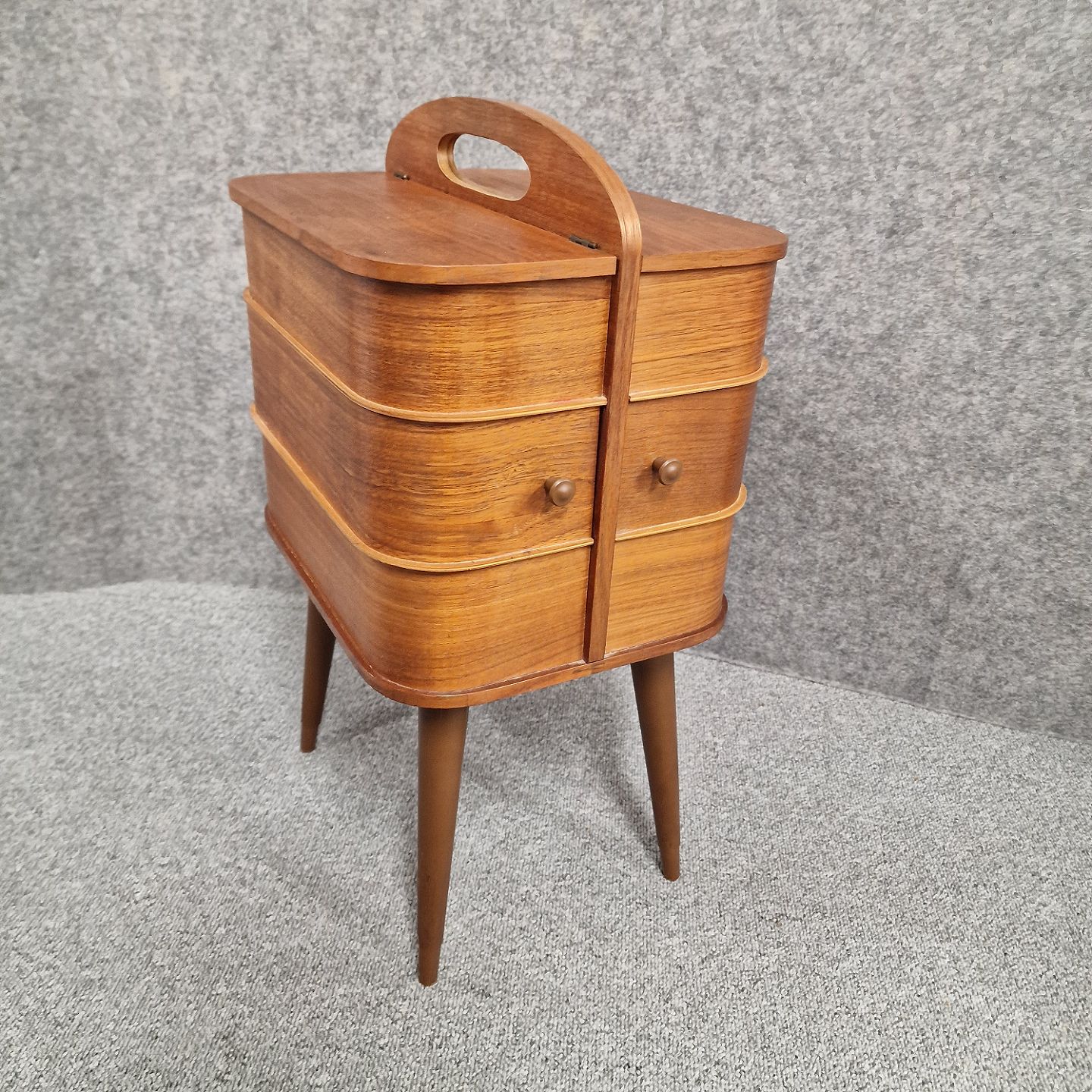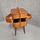 Sybord af teaktræ. Bordet har mange opbevaringsrum, nogle med skillevægge i, og håndtag så bordet nemt kan flyttes