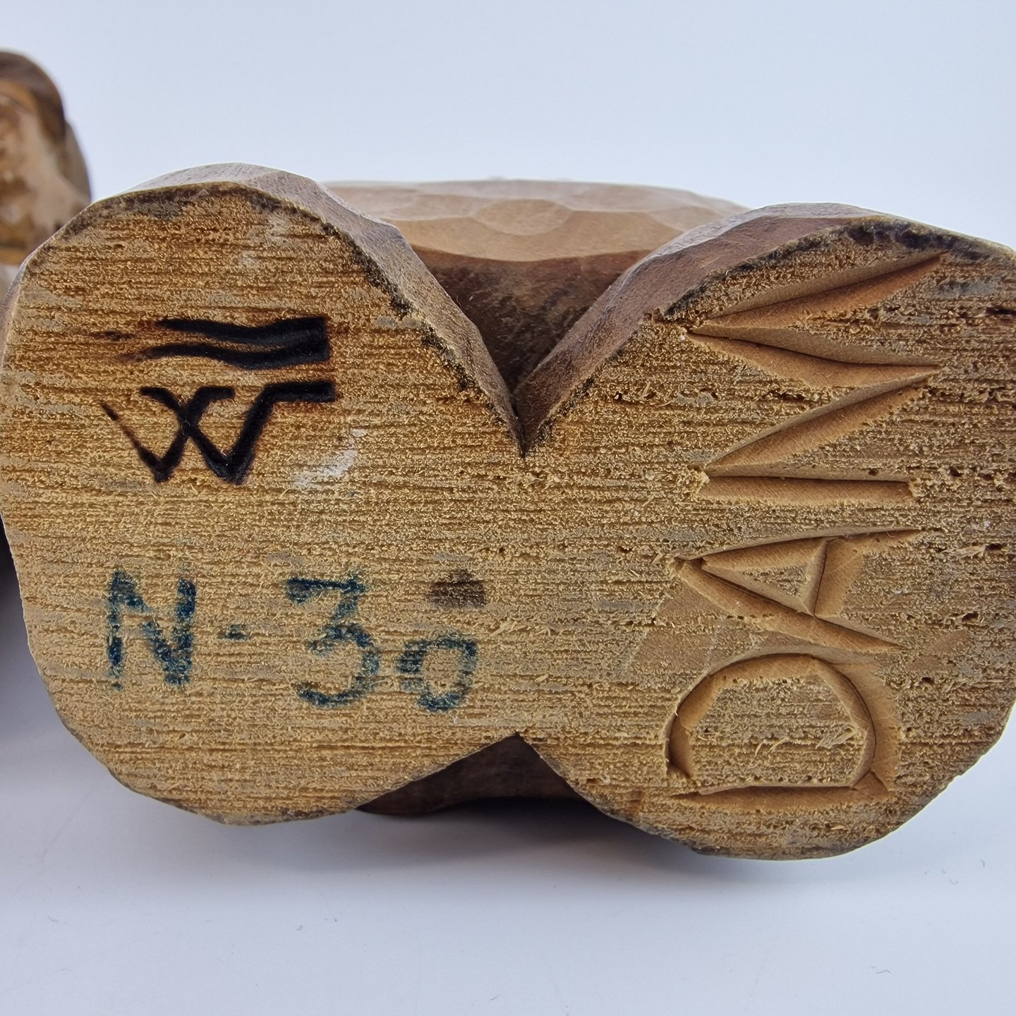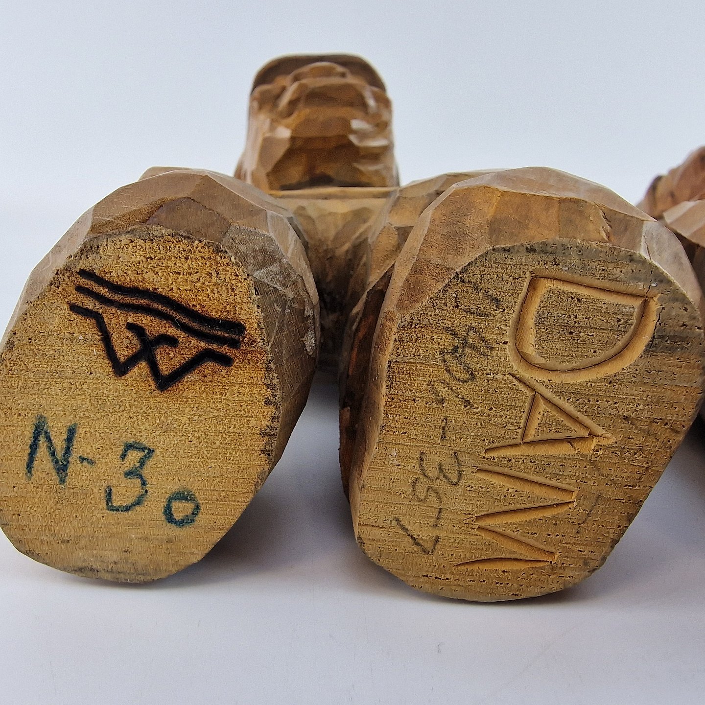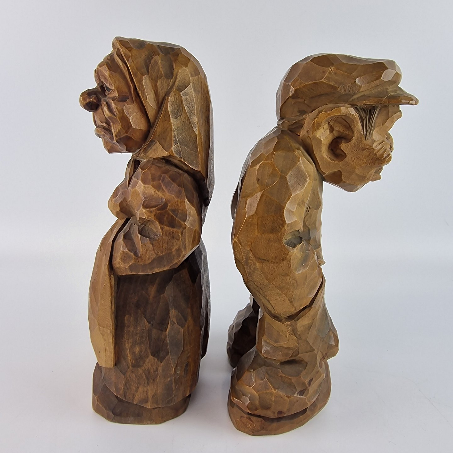 Figurer af håndsnittet træ, der forestiller en kvinde og en mand. Nr. n-30. D406-357. Solgt igennem Wiggers