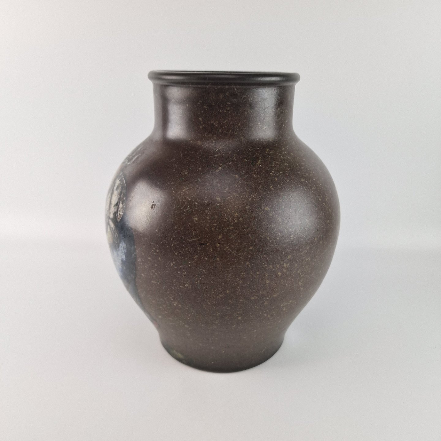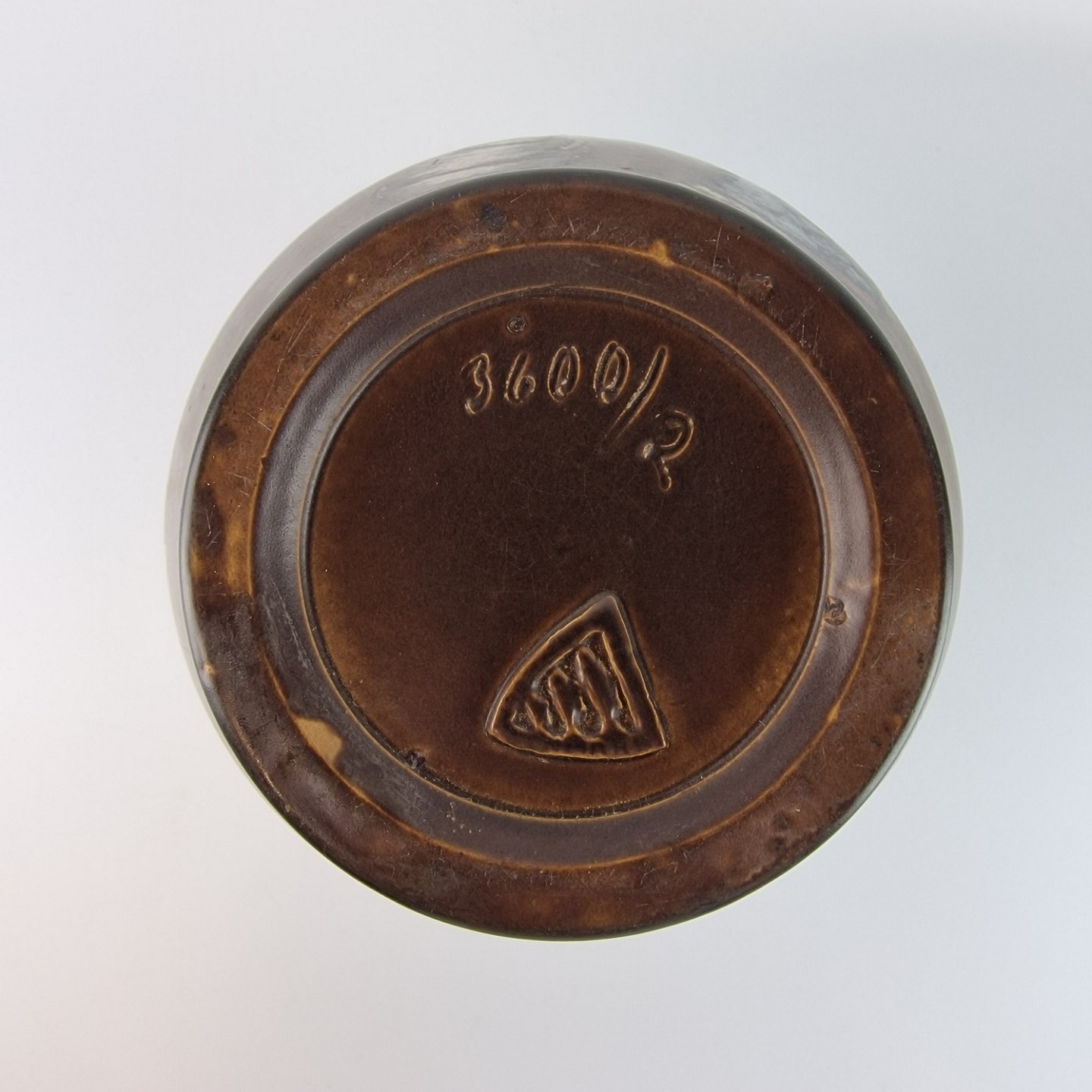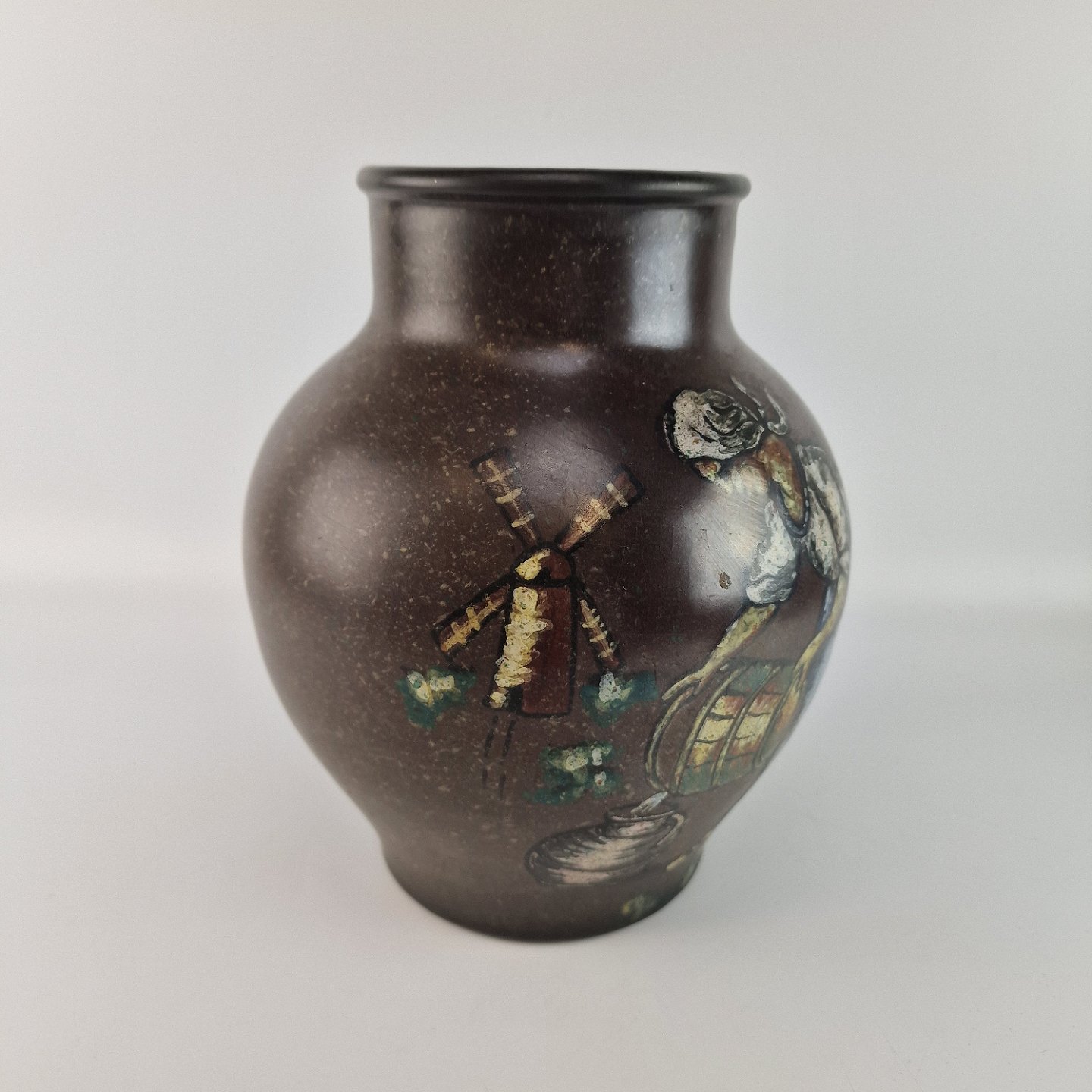 Brun keramik vase med motiv af en kvinde ved en mølle. Nr 3600/2