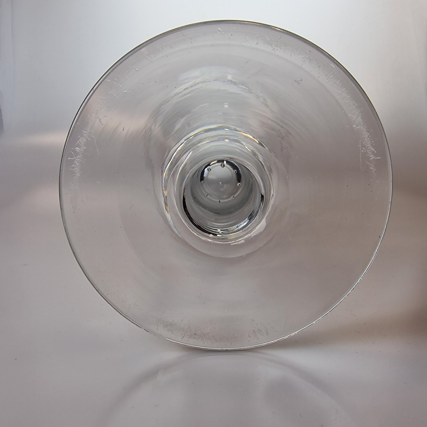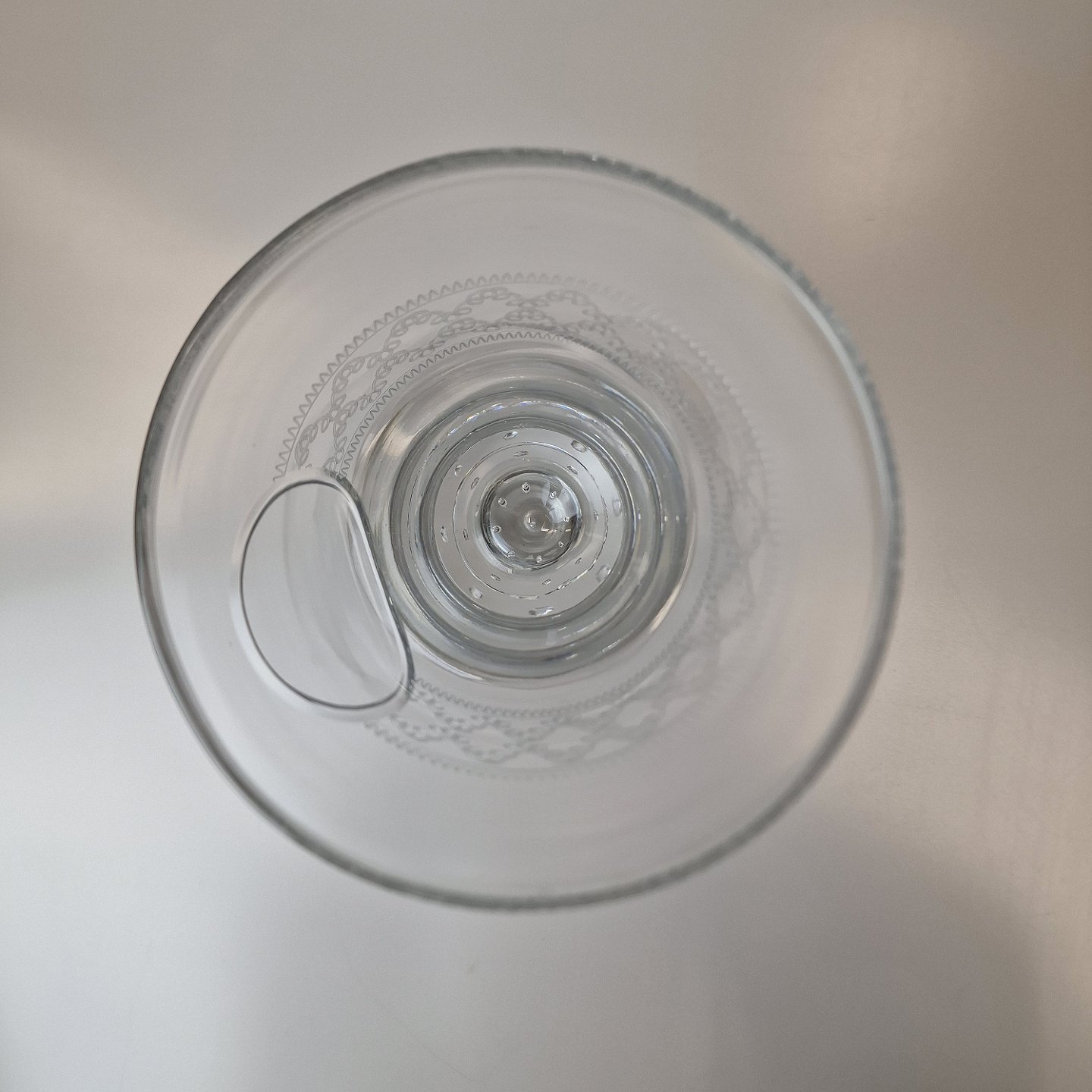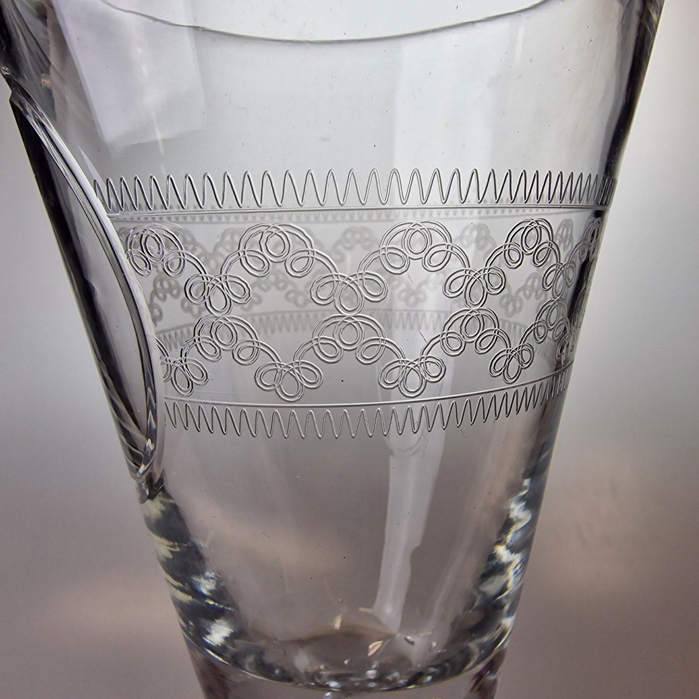 Pokal af mundblæst glas med graveret mønstre og oval plads til navn. År 1910