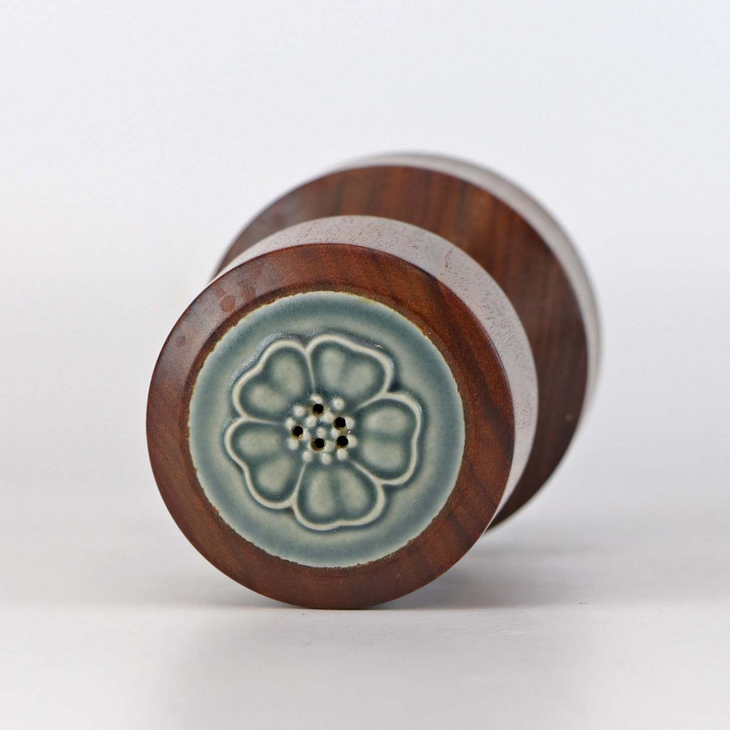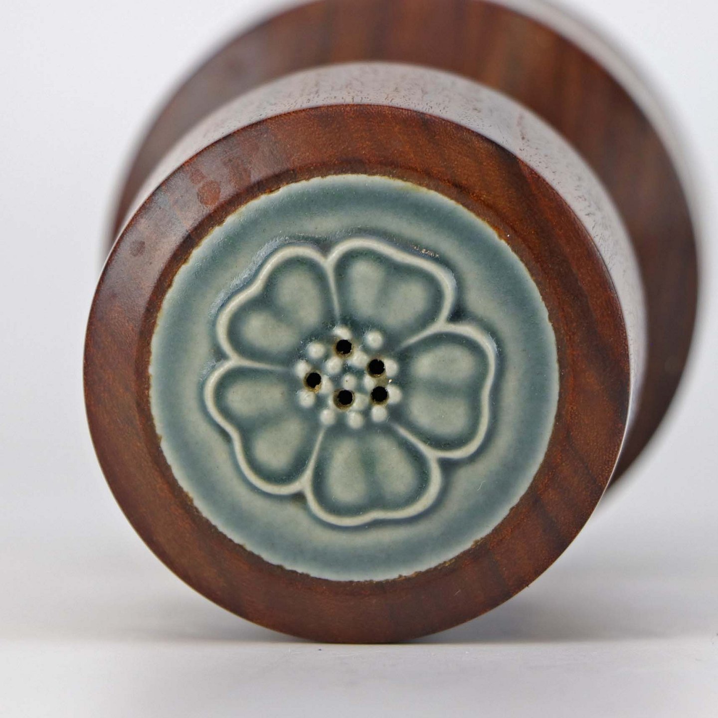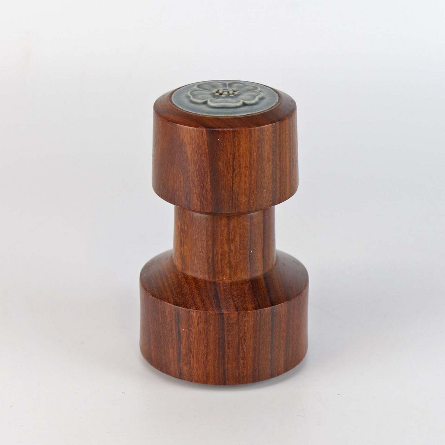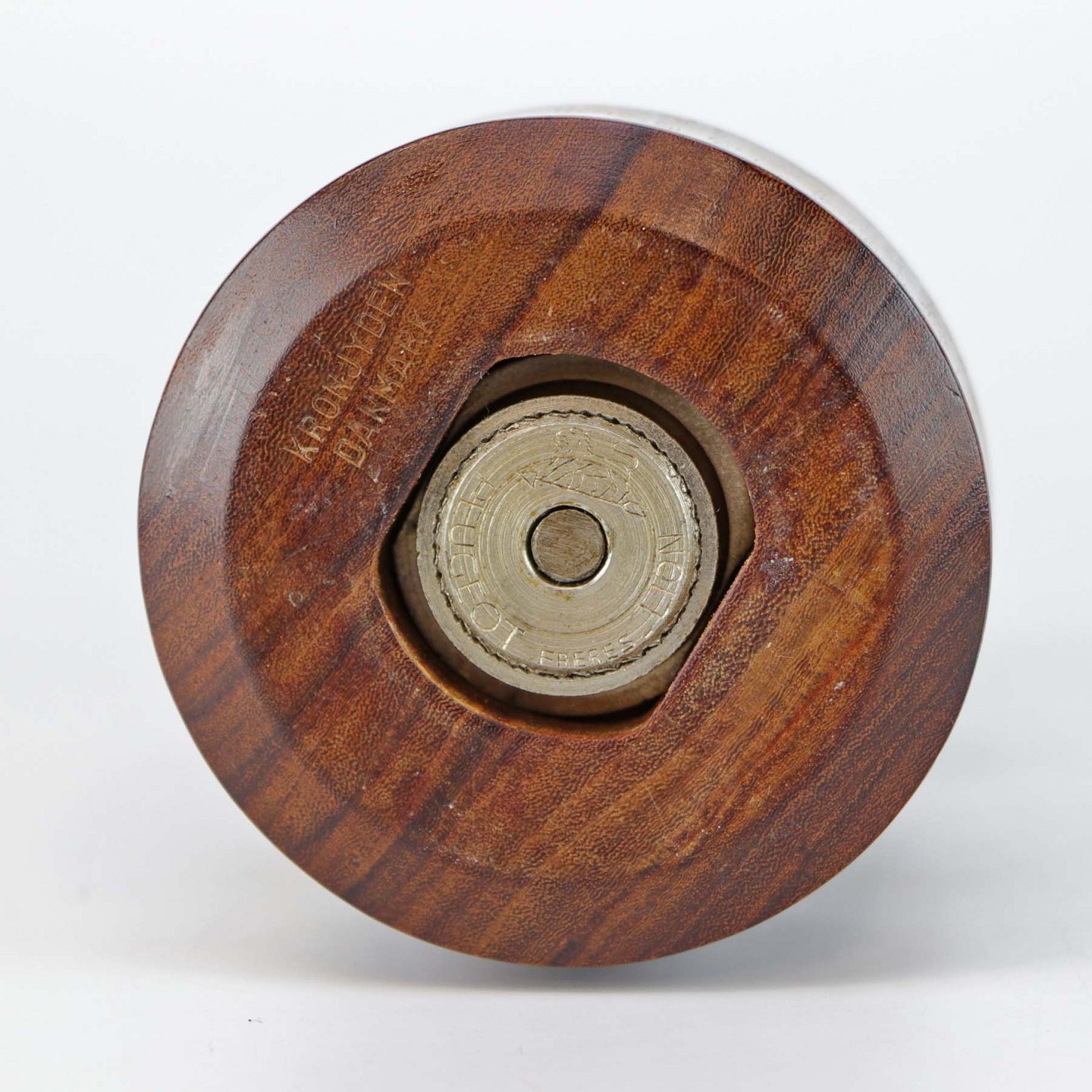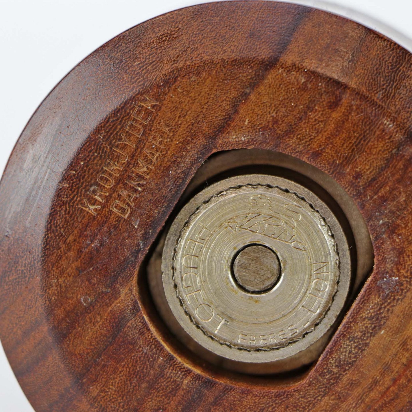 Peberkværn i mørkt træ med top af stentøj fra stellet Azur. Selve kværnen er i metal fra Peugeot Freres Lion
