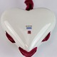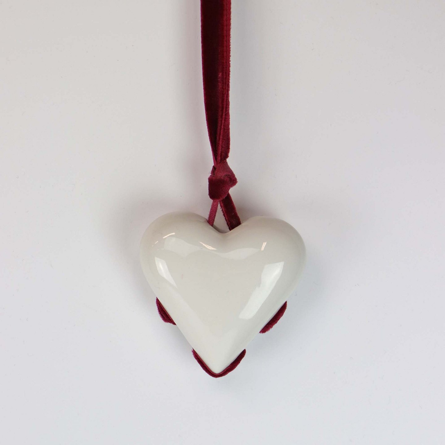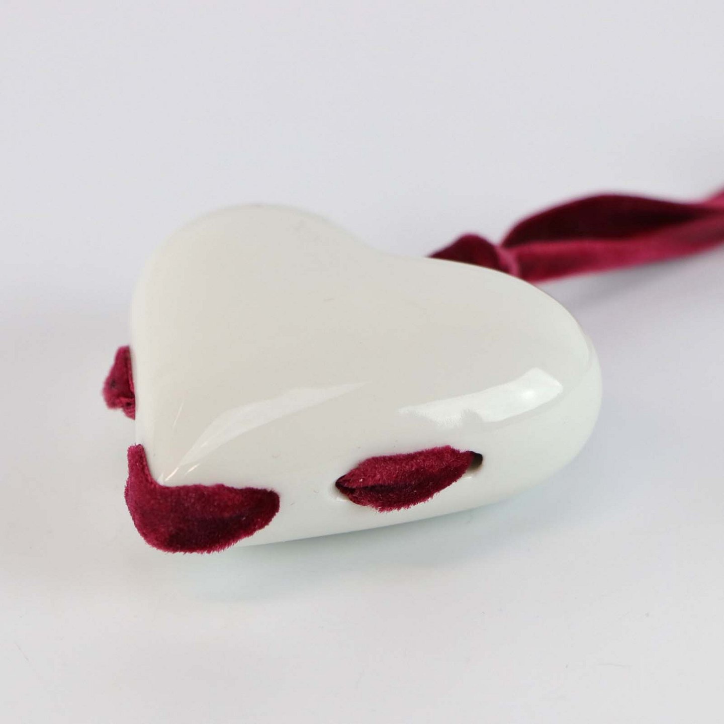 Hjerte i hvidt porcelæn med snor i bordeaux velour flettet ind i hjertet