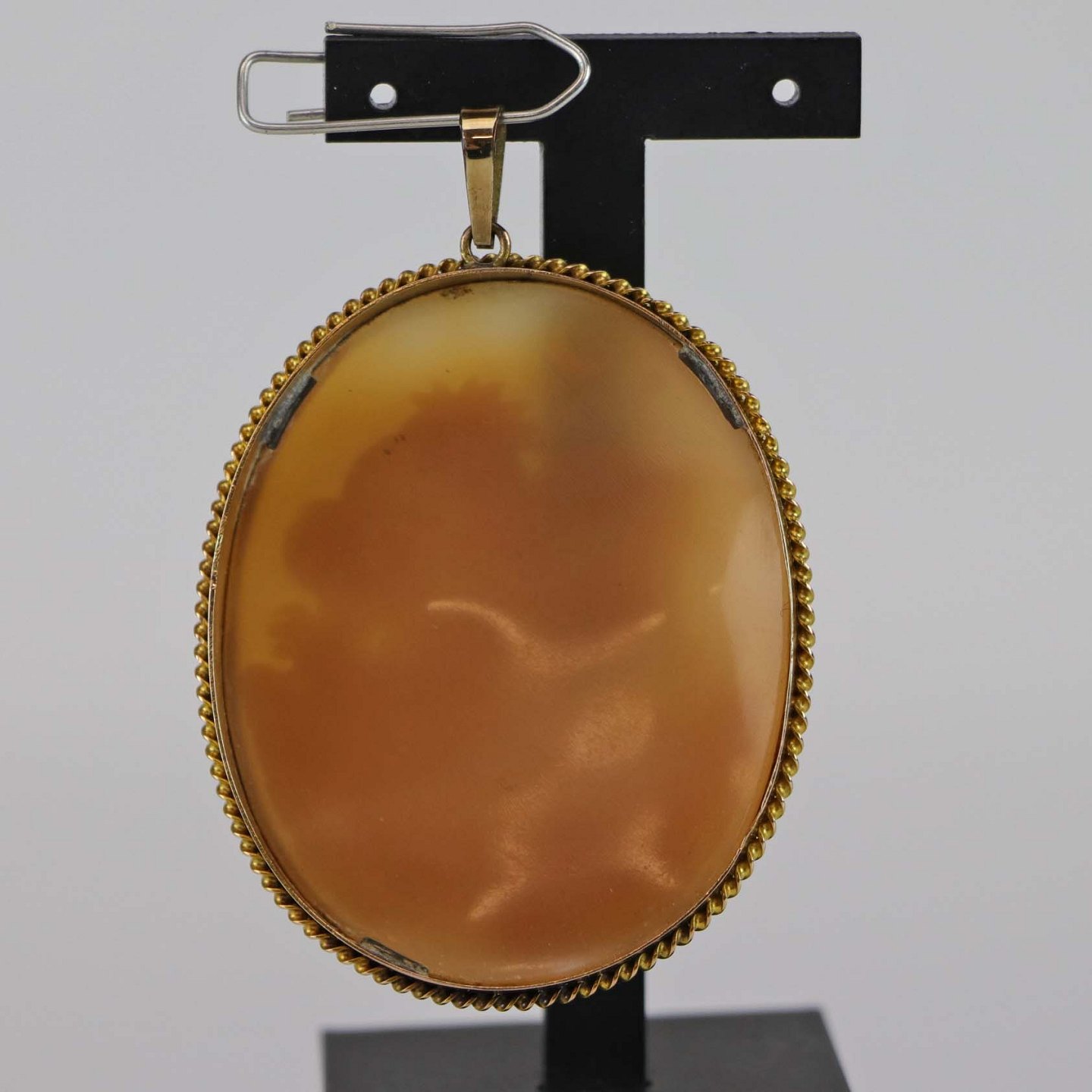 Stor kamé vedhæng med motiv af to kvinder med blomster, måne og stjerne indfattet i 14 karat guld