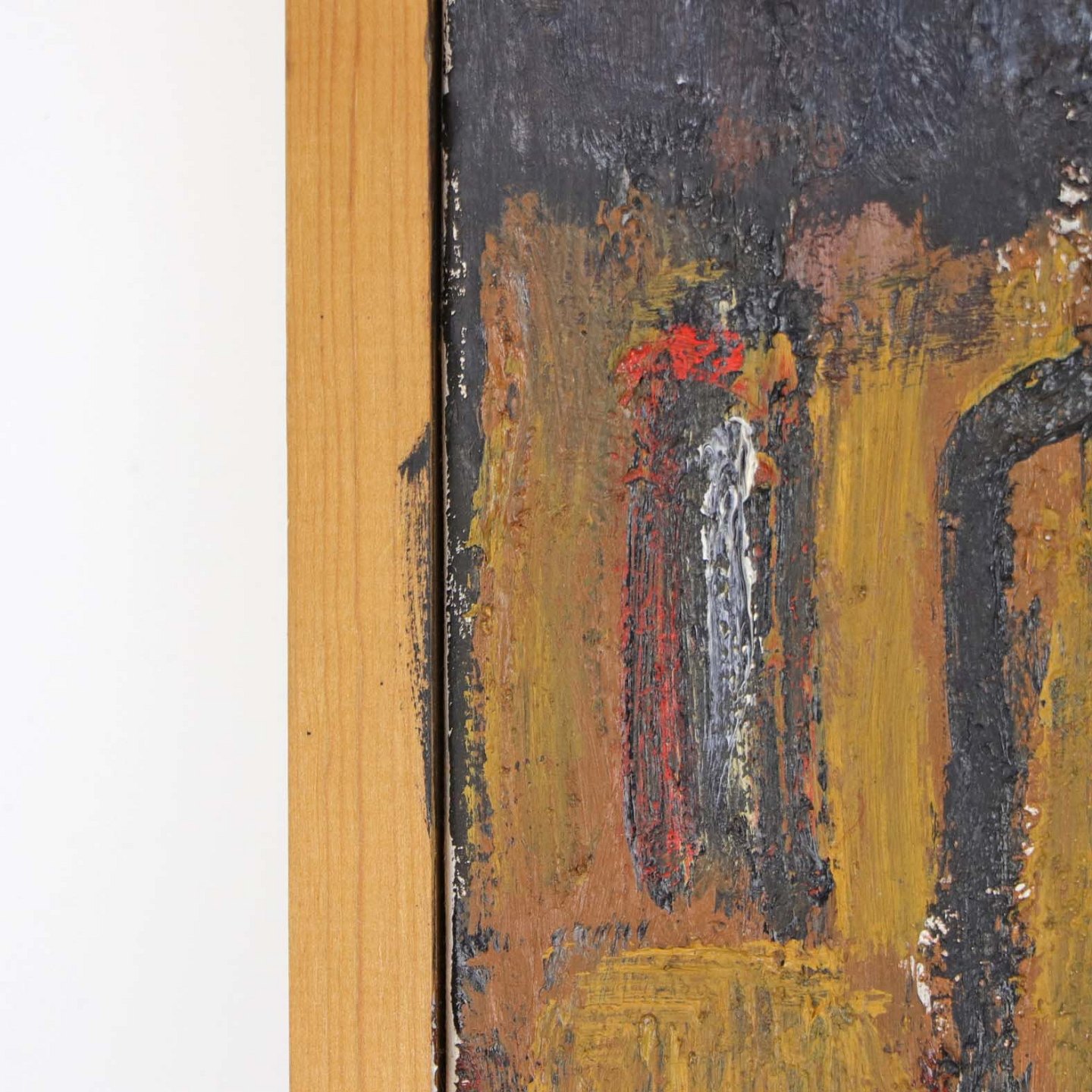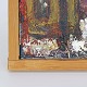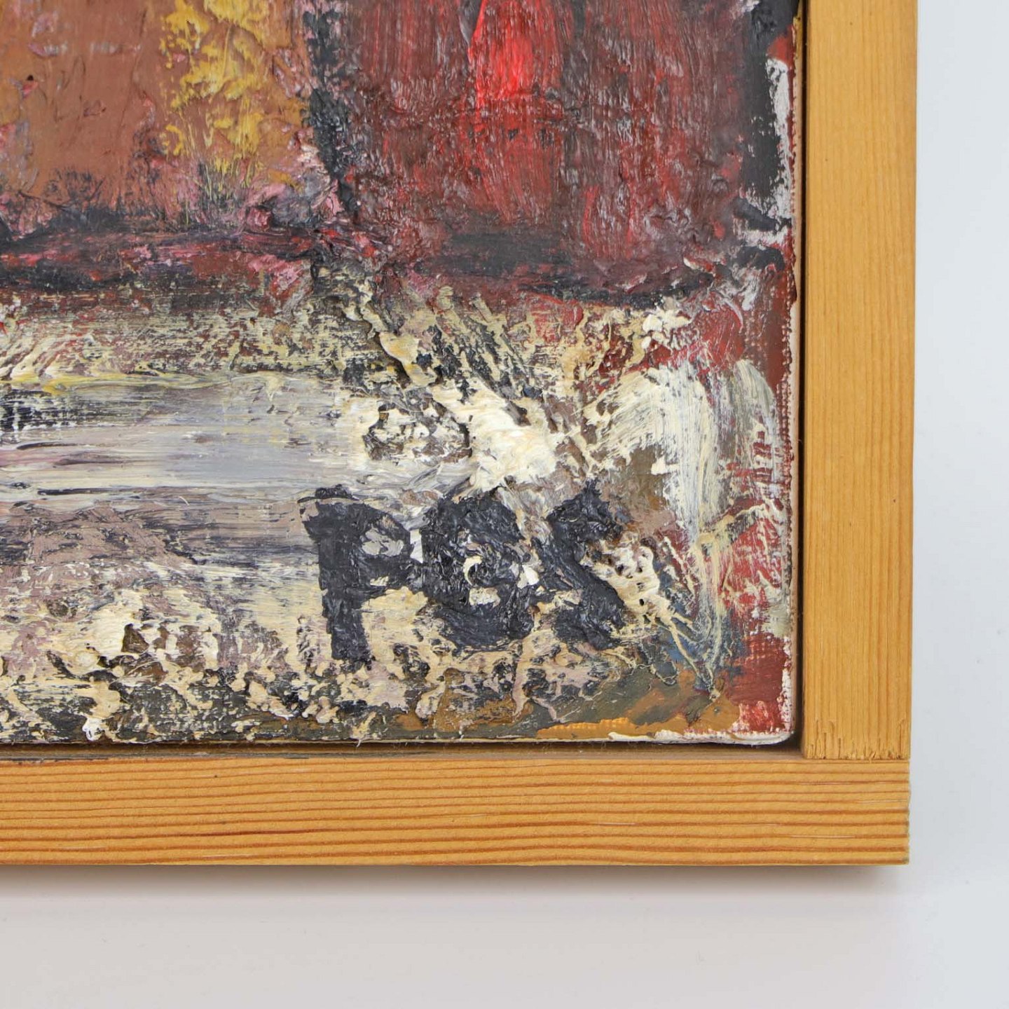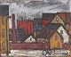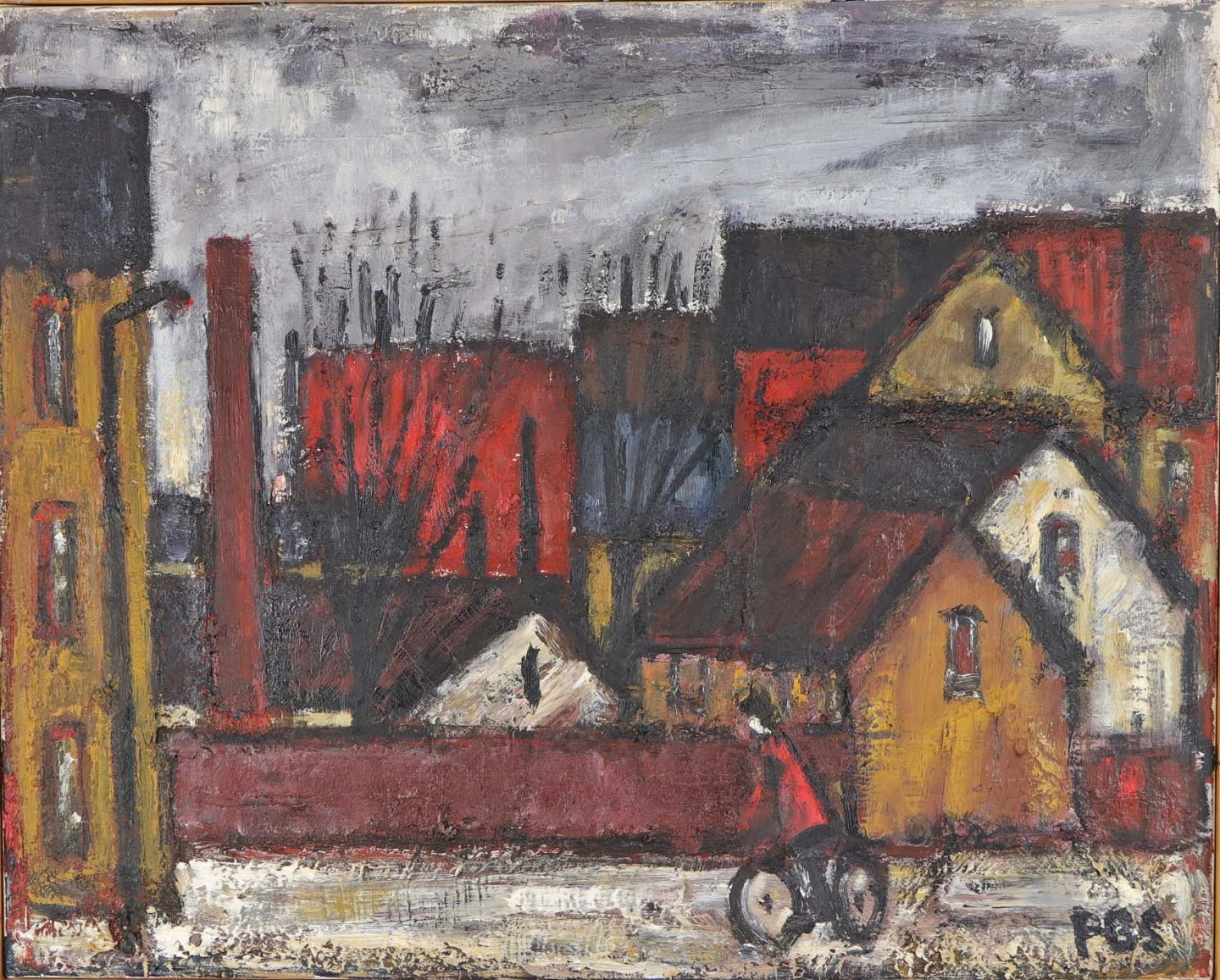 Oliemaleri på lærred i træramme. Struktureret bymaleri med motiv af cykellist foran farverige bygninger. Dateret år 1983