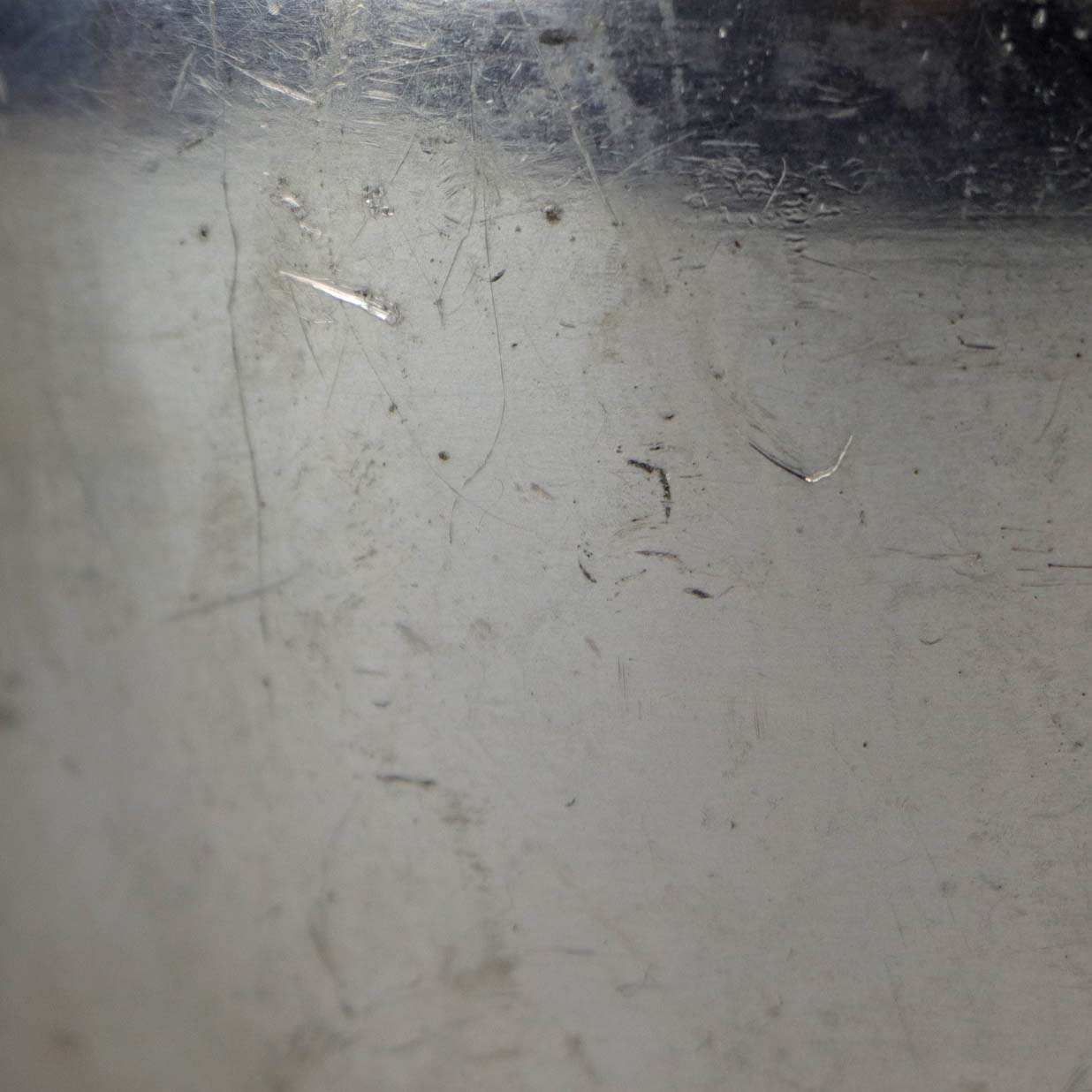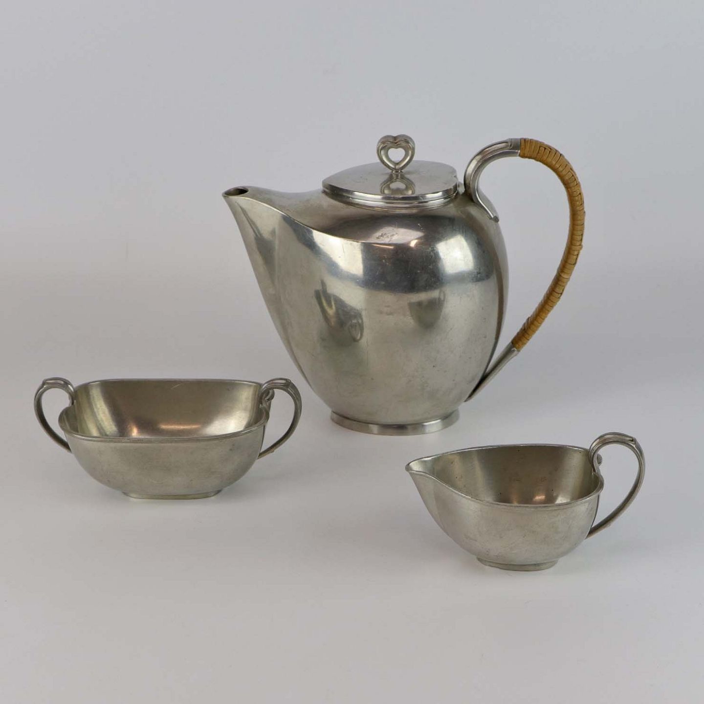 Sæt med tre dele fremstillet i tin. Tekande med flettet hank, flødekande og sukkerskål nr 2272